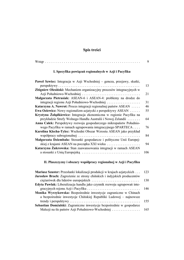 Spis treści Wstęp . . . . . . . . . . . . . . . . . . . . . . . . . . . . . . . . . . . . . . . . . . . . . . 9 I. Specyfika powiązań regionalnych w Azji i Pacyfiku Paweł Szwiec: Integracja w Azji Wschodniej – geneza, przejawy, skutki, perspektywy . . . . . . . . . . . . . . . . . . . . . . . . . . . . . . . . . . . . . . . . . . . . . . Zbigniew Olesiński: Mechanizm organizacyjny procesów integracyjnych w Azji Południowo-Wschodniej . . . . . . . . . . . . . . . . . . . . . . . . . . . . . . . . . Małgorzata Pietrasiak: ASEAN-6 i ASEAN-4: problemy na drodze do integracji regionu Azji Południowo-Wschodniej . . . . . . . . . . . . . . . . . . . Katarzyna A. Nawrot: Proces integracji regionalnej państw ASEAN . . . . . Ewa Oziewicz: Nowy regionalizm azjatycki z perspektywy ASEAN . . . . . . Krystyna Żołądkiewicz: Integracja ekonomiczna w regionie Pacyfiku na przykładzie Strefy Wolnego Handlu Australii i Nowej Zelandii . . . . . . . Anna Całek: Perspektywy rozwoju gospodarczego mikropaństw Południowego Pacyfiku w ramach ugrupowania integracyjnego SPARTECA . . . . Karolina Klecha-Tylec: Wschodni Obszar Wzrostu ASEAN jako przykład współpracy subregionalnej . . . . . . . . . . . . . . . . . . . . . . . . . . . . . . . . . . . Małgorzata Dziembała: Stosunki gospodarcze i polityczne Unii Europejskiej z krajami ASEAN na początku XXI wieku . . . . . . . . . . . . . . . . . . . Katarzyna Żukrowska: Stan zaawansowania integracji w ramach ASEAN a stosunki z Unią Europejską . . . . . . . . . . . . . . . . . . . . . . . . . . . . . . . . . 13 21 31 46 55 64 76 84 94 106 II. Płaszczyzny i obszary współpracy regionalnej w Azji i Pacyfiku Mariusz Szuster: Przesłanki lokalizacji produkcji w krajach azjatyckich . . . Jarosław Brach: Zagrożenie ze strony chińskich i indyjskich producentów ciężarówek dla liderów europejskich . . . . . . . . . . . . . . . . . . . . . . . . . . . Edyta Pawlak: Liberalizacja handlu jako czynnik rozwoju ugrupowań integracyjnych rejonu Azji i Pacyfiku . . . . . . . . . . . . . . . . . . . . . . . . . . . . . . Monika Wyrzykowska: Bezpośrednie inwestycje zagraniczne w Chinach a bezpośrednie inwestycje Chińskiej Republiki Ludowej – najnowsze trendy i perspektywy . . . . . . . . . . . . . . . . . . . . . . . . . . . . . . . . . . . . . . . . Sebastian Domżalski: Zagraniczne inwestycje bezpośrednie w gospodarce Malezji na tle państw Azji Południowo-Wschodniej . . . . . . . . . . . . . . . . 123 130 146 155 165 6 Iwona Pawlas: Azja jako obszar funkcjonowania korporacji transnarodowych w zakresie działalności badawczo-rozwojowej . . . . . . . . . . . . . . . . Bogusława Drelich-Skulska: Powiązania sieciowe przedsiębiorstw w regionie Azji i Pacyfiku . . . . . . . . . . . . . . . . . . . . . . . . . . . . . . . . . . . . . . . Elżbieta Pleśniak: Usługi outsourcingowe w Indiach . . . . . . . . . . . . . . . . . . Szymon Mazurek: Giełdy papierów wartościowych w regionie Azji i Pacyfiku . . . . . . . . . . . . . . . . . . . . . . . . . . . . . . . . . . . . . . . . . . . . . . . . . . . . . Łukasz Fijałkowski: Regionalny wymiar bezpieczeństwa w Azji Południowo-Wschodniej. Idea Wspólnoty ASEAN w świetle koncepcji wspólnot bezpieczeństwa . . . . . . . . . . . . . . . . . . . . . . . . . . . . . . . . . . . . . . . . . Paweł Łyszczak: Rywalizacja o zasoby surowców energetycznych w basenie Morza Południowochińskiego . . . . . . . . . . . . . . . . . . . . . . . . . . . . . . 175 182 195 206 216 226 III. Makroekonomiczny wymiar procesów integracyjnych w Azji i Pacyfiku Sebastian Bobowski, Marcin Haberla: Indie – narodziny drugiego azjatyckiego giganta? . . . . . . . . . . . . . . . . . . . . . . . . . . . . . . . . . . . . . . . . . . Małgorzata Domiter: Znaczenie polityki handlowej Japonii dla jej dominującej pozycji w regionie Azji i Pacyfiku . . . . . . . . . . . . . . . . . . . . . . . . . Anna Jankowiak: Znaczenie ekonomiczne Hongkongu w regionie Azji i Pacyfiku . . . . . . . . . . . . . . . . . . . . . . . . . . . . . . . . . . . . . . . . . . . . . . . . Aleksandra Kuźmińska: Brand China – wizerunek Chin w świecie w świetle rankingu Anholt Nation Brands Index . . . . . . . . . . . . . . . . . . . Patrycja Stermach: Ocena ryzyka państw ASEAN na podstawie metody klasyfikacji ryzyka kraju (The Country Risk Classification Method – CRCM) . . . . . . . . . . . . . . . . . . . . . . . . . . . . . . . . . . . . . . . . . . . . . . . . . 237 246 261 273 282 IV. Społeczne i kulturowe wymiary procesów integracyjnych Małgorzata Bartosik-Purgat: Kultura i konsument w świetle procesów globalnego rynku . . . . . . . . . . . . . . . . . . . . . . . . . . . . . . . . . . . . . . . . . . Tadeusz Sporek: Społeczne problemy współczesnego świata – dylematy ochrony środowiska . . . . . . . . . . . . . . . . . . . . . . . . . . . . . . . . . . . . . . . . Bogusław Bembenek: Japońskie grupy keiretsu w świetle koncepcji kapitału społecznego . . . . . . . . . . . . . . . . . . . . . . . . . . . . . . . . . . . . . . . . . 293 305 315 Summaries Paweł Szwiec: Integration in East Asia – causes, indications, outcomes, perspectives . . . . . . . . . . . . . . . . . . . . . . . . . . . . . . . . . . . . . . . . . . . . . . Zbigniew Olesiński: Organizational mechanism of integrative processes in South-East Asia . . . . . . . . . . . . . . . . . . . . . . . . . . . . . . . . . . . . . . . . . . . 20 30 7 Małgorzata Pietrasiak: ASEAN-6 and ASEAN-4: Problems on the way to the integration of South East Asia region . . . . . . . . . . . . . . . . . . . . . . . . Katarzyna A. Nawrot: Process of regional integration in ASEAN countries Ewa Oziewicz: New Asian regionalism from the ASEAN perspective . . . . . Krystyna Żołądkiewicz: Economic integration in Pacific Region on the example of Australia New Zealand Closer Economic Relations Trade Agreement . . . . . . . . . . . . . . . . . . . . . . . . . . . . . . . . . . . . 