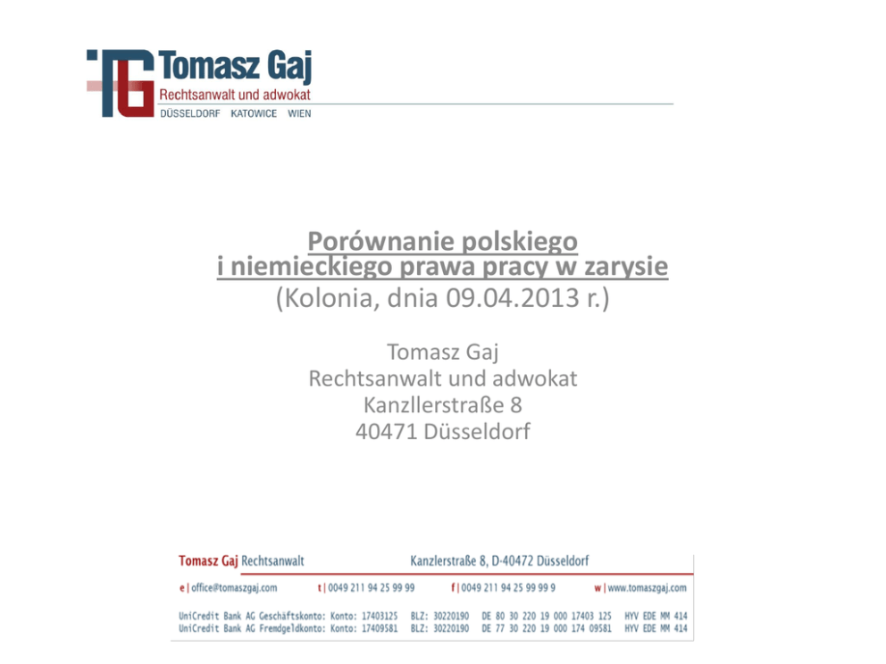 Porównanie polskiego i niemieckiego prawa pracy w zarysie (Kolonia, dnia 09.04.2013 r.) Tomasz Gaj Rechtsanwalt und adwokat Kanzllerstraße 8 40471 Düsseldorf Oddelegowanie pracowników (przepisy bezwzględnie obowiązujące) Dyrektywa 96/71/WE Parlamentu Europejskiego i Rady z dnia 16 grudnia 1996 r. dotycząca delegowania pracowników w ramach świadczenia usług PARLAMENT EUROPEJSKI I RADA UNII EUROPEJSKIEJ, stanowi, iż: a) maksymalne okresy pracy i minimalne okresy wypoczynku; b) minimalny wymiar płatnych urlopów rocznych; c) minimalne stawki płacy, wraz ze stawką za nadgodziny; d) warunki wynajmu pracowników, w szczególności przez przedsiębiorstwa zatrudnienia tymczasowego; e) zdrowie, bezpieczeństwo i higiena w miejscu pracy; f) środki ochronne stosowane w odniesieniu do warunków zatrudnienia kobiet ciężarnych lub kobiet tuż po urodzeniu dziecka, dzieci i młodzieży; g) równość traktowania mężczyzn i kobiet, a także inne przepisy w zakresie niedyskryminacji. Oddelegowanie pracowników do pracy w Niemczech i w Polsce Niemcy: Arbeitnehmer-Entsendegesetz vom 20. April 2009 „Gesetz über zwingende Arbeitsbedingungen für grenzüberschreitend entsandte und für regelmäßig im Inland beschäftigte Arbeitnehmer und Arbeitnehmerinnen (ArbeitnehmerEntsendegesetz - AEntG)” Polska: Warunki zatrudnienia pracowników skierowanych do pracy na terytorium RP z państwa będącego członkiem Unii Europejskiej regulują postanowienia przepisów Art. 67¹ - Art. 67 ⁴ Kodeksu pracy. Allgemeine Arbeitsbedingungen § 2 Allgemeine Arbeitsbedingungen Die in Rechts- oder Verwaltungsvorschriften enthaltenen Regelungen über 1. die Mindestentgeltsätze einschließlich der Überstundensätze, 2. den bezahlten Mindestjahresurlaub, 3. die Höchstarbeitszeiten und Mindestruhezeiten, 4. die Bedingungen für die Überlassung von Arbeitskräften, insbesondere durch Leiharbeitsunternehmen, 5. die Sicherheit, den Gesundheitsschutz und die Hygiene am Arbeitsplatz, 6. die Schutzmaßnahmen im Zusammenhang mit den Arbeits- und Beschäftigungsbedingungen von Schwangeren und Wöchnerinnen, Kindern und Jugendlichen und 7. die Gleichbehandlung von Männern und Frauen sowie andere Nichtdiskriminierungsbestimmungen finden auch auf Arbeitsverhältnisse zwischen einem im Ausland ansässigen Arbeitgeber und seinen im Inland beschäftigten Arbeitnehmern und Arbeitnehmerinnen zwingend Anwendung. ROZPORZĄDZENIE PARLAMENTU EUROPEJSKIEGO I RADY (WE) Nr 593/2008 z dnia 17 czerwca 2008 r. w sprawie prawa właściwego dla zobowiązań umownych (Rzym I) (Artykuł 8 Indywidualne umowy o pracę) • (1) Indywidualna umowa o pracę podlega prawu wybranemu przez strony zgodnie z art. 3. Taki wybór prawa nie może jednak prowadzić do pozbawienia pracownika ochrony przyznanej mu na podstawie przepisów, których nie można wyłączyć w drodze umowy, na mocy prawa, jakie, w przypadku braku wyboru, byłoby właściwe zgodnie z ust. 2, 3 i 4 niniejszego artykułu. • (2.) W zakresie, w jakim strony nie dokonały wyboru prawa właściwego dla indywidualnej umowy o pracę, umowa podlega prawu państwa, w którym lub – gdy takiego brak – z którego pracownik zazwyczaj świadczy pracę w wykonaniu umowy. Za zmianę państwa, w którym zazwyczaj świadczona jest praca, nie uważa się tymczasowego zatrudnienia w innym państwie. • (3.) Jeżeli nie można ustalić prawa właściwego zgodnie z ust. 2, umowa podlega prawu państwa, w którym znajduje się przedsiębiorstwo, za pośrednictwem którego zatrudniono pracownika. • (4.) Jeżeli ze wszystkich okoliczności wynika, że umowa wykazuje ściślejszy związek z państwem innym niż wskazane w ust. 2 lub 3, stosuje się prawo tego innego państwa. Właściwość sądu 1. ROZPORZĄDZENIE RADY (WE) NR 44/2001 z dnia 22 grudnia 2000 r. w sprawie jurysdykcji i uznawania orzeczeń sądowych oraz ich wykonywania w sprawach cywilnych i handlowych (Art. 19 ) Pracodawca mający miejsce zamieszkania w Państwie Członkowskim może być pozwany: 1) przed sądy Państwa Członkowskiego, w którym ma miejsce zamieszkania; lub 2) w innym Państwie Członkowskim a) przed sąd miejsca, w którym pracownik zazwyczaj świadczy lub ostatnio zazwyczaj świadczył pracę; lub b) jeżeli pracownik zazwyczaj nie świadczy lub zazwyczaj nie świadczył pracy w jednym i tym samym państwie – przed sąd miejsca, w którym znajduje się albo znajdował się oddział, który pracownika zatrudnił. 2. Arbeitnehmer - Entsendegesetz (§ 15) Arbeitnehmer und Arbeitnehmerinnen, die in den Geltungsbereich dieses Gesetzes entsandt sind oder waren, können eine auf den Zeitraum der Entsendung bezogene Klage auf Erfüllung der Verpflichtungen nach den §§ 2, 8 oder 14 auch vor einem deutschen Gericht für Arbeitssachen erheben. Diese Klagemöglichkeit besteht auch für eine gemeinsame Einrichtung der Tarifvertragsparteien nach § 5 Nr. 3 in Bezug auf die ihr zustehenden Beiträge. Pozwanie pracownika ROZPORZĄDZENIE RADY (WE) NR 44/2001: (Art. 20) Pracodawca może wytoczyć powództwo tylko przed sądami Państwa Członkowskiego, na terytorium którego pracownik ma miejsce zamieszkania. Ochrona stosunku pracy Ochrona stosunku pracy w prawie polskim Rozwiązanie umowy o pracę na mocy porozumienia stron (art. 30 § 1 pkt 1 k.p.) • Na mocy porozumienia stron może ulec rozwiązaniu każda umowa o pracę. • Rozwiązanie umowy o pracę może w tym wypadku nastąpić z inicjatywy każdej ze stron stosunku pracy. • Nie znajdują tu zastosowania ograniczenia, jakie normy prawne nakładają na jednostronne rozwiązanie umowy o pracę przez pracodawcę. • Z formalnego punktu widzenia bez znaczenia jest przyczyna, która stoi u podstaw rozwiązania umowy o pracę (np. rozwiązanie umowy o pracę następuje z powodów nie dotyczących pracodawcy). • W razie nadużycia przez pracodawcę swojej pozycji względem pracownika druga strona stosunku pracy może domagać się oceny działania pracoda