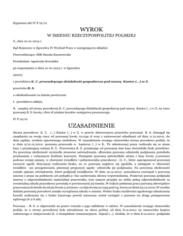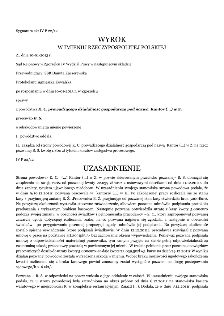 Sygnatura akt IV P 22/12 WYROK W IMIENIU RZECZYPOSPOLITEJ POLSKIEJ Z., dnia 10-01-2013 r. Sąd Rejonowy w Zgorzelcu IV Wydział Pracy w następującym składzie: Przewodniczący: SSR Danuta Kaczerewska Protokolant: Agnieszka Kowalska po rozpoznaniu w dniu 10-01-2013 r. w Zgorzelcu sprawy z powództwa K. C. prowadzącego działalność gospodarcza pod nazwą Kantor (...) w Z. przeciwko B. S. o odszkodowanie za mienie powierzone I. powództwo oddala, II. zasądza od strony powodowej K. C. prowadzącego działalność gospodarczą pod nazwą Kantor (...) w Z. na rzecz pozwanej B. S. kwotę 1.800 zł tytułem kosztów zastępstwa procesowego. IV P 22/12 UZASADNIENIE Strona powodowa- K. C. (...) Kantor (...) w Z. w pozwie skierowanym przeciwko pozwanej- B. S. domagał się zasądzenia na swoją rzecz od pozwanej kwoty 22.039 zł wraz z ustawowymi odsetkami od dnia 11.12.2011r. do dnia zapłaty, tytułem ujawnionego niedoboru. W uzasadnieniu swojego stanowiska strona powodowa podała, że w dniu 9/10.12.2011r. pozwana pracowała w kantorze (...) w K.. Po zakończonej pracy rozliczała się ze stanu kasy z przyjmującą zmianę B. Ż. .Pracownica B. Ż. przyjmując od pozwanej stan kasy stwierdziła brak 5000Euro. Na powyższą okoliczność wystawiła stosowne zaświadczenie, albowiem pozwana odmówiła podpisania protokołu przekazania z wykazanym brakiem kasowym. Następnie pozwana potwierdziła utratę z kasy kwoty 5.000euro podczas swojej zmiany, w obecności świadków i pełnomocnika pracodawcy –G. C., który zaproponował pozwanej zawarcie ugody dotyczącej rozliczenia braku, na co pozwana najpierw się zgodziła, a następnie w obecności świadków –po przygotowaniu pisemnej propozycji ugody- odmówiła jej podpisania. Na powyższą okoliczność zostało spisane oświadczenie ,które podpisali świadkowie. W dniu 12.12.2011r. pracodawca rozwiązał z pozwaną umowę o pracę na podstawie art.30§1pkt.3- bez zachowania okresu wypowiedzenia. Ponieważ pozwana podpisała umowę o odpowiedzialności materialnej pracownika, tym samym przyjęła na siebie pełną odpowiedzialność za ewentualną szkodę pracodawcy powstałą w powierzonym jej mieniu. W trakcie pełnienia przez pozwaną obowiązków pracowniczych doszło do utraty kwoty 5.000euro -co daje kwotę 22.039,50zł wg. kursu na dzień 29.12.2011r.W wyniku działań pozwanej powodowi została wyrządzona szkoda w mieniu. Wobec braku możliwości ugodowego zakończenia kwestii rozliczenia się z braku kasowego powód zmuszony został wystąpić z pozwem na drogę postępowania sądowego/k-2-6 akt/. Pozwana – B. S. w odpowiedzi na pozew wniosła o jego oddalenie w całości. W uzasadnieniu swojego stanowiska podała, że u strony powodowej była zatrudniona na okres próbny od dnia 8.12.2011r na stanowisku kasjera walutowego w miejscowości K. w kompleksie restauracyjnym Zajazd (...). Dodała, że w dniu 8.12.2011r. podpisała umowę o odpowiedzialności materialnej za mienie powierzone. W dniu z 9/10 grudnia 2011r. pełniła w kantorze nocną zmianę, którą w godzinach rannych przekazała swojej zmienniczce B. Ż.. Pozwana nie poczuwa się do odpowiedzialności za ujawniony niedobór ,ponieważ rozliczając stan kasy ze swoją zmienniczką w godzinach rannych nie ujawniły żadnego niedoboru. O niedoborze w kwocie 5.000 euro poinformowała pozwaną B. Ż. dopiero ok.godz.19 w dniu 10.12.2011r. podczas przekazywania zmiany następnej pracownicy- M. P., która ujawniła niedobór na kwotę 5,090 euro. Z załączonych do pozwu kopii oświadczeń wynika, że niedobór został ujawniony podczas przekazywania zmiany pomiędzy B. Ż. oraz M. P., a zatem obciążenie ujawnionym niedoborem nie powinno dotyczyć pozwanej/ k-40-42 akt/. Sąd ustalił ,że : Pozwana- B. S. była zatrudniona u strony pozwanej na podstawie umowy o pracę zawartej na okres próbny od dnia 8.12.2011r do dnia 7.02.2012r na stanowisku kasjera walutowego w pełnym wymiarze czasu pracy z wynagrodzeniem miesięcznym 1386 zł. Pozwana w dniu 8.12.2011r podpisała umowę o odpowiedzialności materialnej/akta osobowe powódki dołączono do akt sprawy o Sygn.akt:148/11 , które przesłano do SO Sądu Pracy w J. G. na skutek apelacji strony pozwanej oraz k-12 akt ,k-14 akt/.W dniu 9.12.2011r. pozwana pracowała na nocną zmianę w kantorze (...) w miejscowości K. od godz.19 w dniu 9.12.2011r do godz.7 rano w dniu 10.12.2011r. Zmianę przekazała kasjerce B. Ż., która po przeliczeniu stanu kasy przejęła zmianę bez zastrzeżeń. Pozwana oraz przejmująca zmianę B. Ż. podpisały wydrukowany komputerowo stan kasy ok.godz.7.15 nie stwierdzając żadnego niedoboru. Około godziny19.30 ,gdy pozwana przebywała we W. na uczelni zadzwoniła do niej B. Ż., która poinformowała ją, że przeliczając pieniądze z przejmująca zmianę M. P. stwierdziły brak 5000 euro/ zeznania pozwanej B. S. na k-46-47 akt, k-110akt/. Strona powodowa do pozwu nie przedłożyła wydruku stanu kasy z dnia 10.12.2011r. z godz.7.15 ze stwierdzonym niedoborem podpisanego przez zdającą zmianę B. S. i przyjmującą zmianę B. Ż., tylko oświadczenie B. Ż. bez daty i godziny sporządzenia, w którym to oświadczeniu, kasjerka B. Ż. podała, ze stwierdziła brak 5000 euro od zdającej B. S., która nie chciała podpisać protokołu z wykazanym brakiem 5.000euro/k- 17 akt/. Strona powodowa nie przedłożyła żadnego protokołu na okoliczność ujawnienia braku 5.000euro. Przesłuchana na tę okoliczność B. Ż. twierdziła, że do pracy przyszła ok. godz. 6.30 w dniu 10.12.2011r. i wydrukowała z komputera stan kasy, a następnie razem z powódką przeliczały pieniądze. W kasie wszystko się zgadzało, zaś brak został ujawniony w reklamówce z walutą, która znajdowała się w sejfie i była przeznaczona dla innego kantoru. Po ujawnieniu niedoboru pozwana odmówiła podpisania stwierdzenia niedoboru na wydruku stanu kasy i opuściła kantor. W związku z powyższym, zadzwoniła 