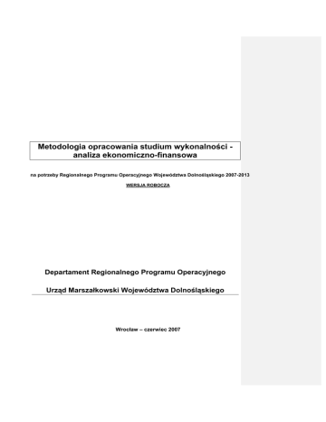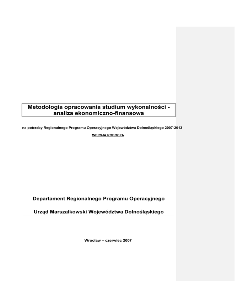 Metodologia opracowania studium wykonalności analiza ekonomiczno-finansowa na potrzeby Regionalnego Programu Operacyjnego Województwa Dolnośląskiego 2007-2013 WERSJA ROBOCZA Departament Regionalnego Programu Operacyjnego Urząd Marszałkowski Województwa Dolnośląskiego Wrocław – czerwiec 2007 Wydział Funduszy Europejskich i Polityki Regionalnej UMWD SPIS TREŚCI: METODOLOGIA OPRACOWANIA STUDIUM WYKONALNOŚCI -ANALIZY EKONOMICZNOFINANSOWEJ ......................................................................................................................................... 1 WSTĘP .................................................................................................................................................... 3 I. PROGNOZA PRZYCHODÓW I KOSZTÓW W ANALIZOWANYM OKRESIE (PROJEKCJA FINANSOWA) ......................................................................................................................................... 4 1. Założenia ogólne......................................................................................................................... 4 2. Podstawowe założenia projekcji finansowej ........................................................................... 7 3. Projektowane rachunki zysków i strat ................................................................................... 14 4. Projektowane bilanse ............................................................................................................... 14 5. Projektowane przepływy pieniężne ........................................................................................ 15 II. ANALIZA FINANSOWA ................................................................................................................ 16 1. Struktura modelu 16 2. Obliczenie przepływów finansowych 17 3. Analiza luki finansowej 18 3. Wielkości 19 4. Trwałość finansowa i wskaźniki charakteryzujące efektywność finansową przedsięwzięcia 21 III. ANALIZA RYZYKA ........................................................................................................................ 23 1. Analiza ryzyka czynników jakościowych ............................................................................... 23 2. Analiza wrażliwości .................................................................................................................. 24 IV. FINANSOWANIE ........................................................................................................................... 27 V. VI. 30 ANALIZA KOSZTÓW I KORZYŚCI SPOŁECZNO-EKONOMICZNYCH ..................................... 27 RAMOWA STRUKTURA STUDIUM VI. ZAŁĄCZNIKI 33 2 WYKONALNOŚCI Wydział Funduszy Europejskich i Polityki Regionalnej UMWD WSTĘP Niniejszy dokument został opracowany na potrzeby wdrażania projektów w ramach RPO na Dolnym Śląsku w latach 2007-2013. Pominięto tu metodologię dotyczącą części ogólnej i technicznej, bo te są powiązane ze specyfiką projektu i jego rodzajem, co i tak znajdzie odniesienia w wytycznych instytucji wdrażających lub zostanie przyjęte zgodnie ze wskazaniami w przedmiotowej literaturze. Przy redagowaniu tekstu niniejszego opracowania korzystano z „Wytycznych do przygotowania inwestycji w zakresie środowiska współfinansowanych przez Fundusz Spójności i Europejski Fundusz Rozwoju Regionalnego w latach 2007-2013” opracowywanych w ramach Programu JASPERS (KE 01/2007), Wytycznych dotyczących metodologii przeprowadzania analizy kosztów i korzyści (KE; DG Regio 08/2006), Przewodnik AKK projektów inwestycyjnych (KE 2002), Niebieska Księga – AKK projektów inwestycyjnych w sektorze transportu KE 2002) (dostępne na: www.rpo.dolnyslask.pl) . Założono podział projektów na • projekty „małe” do 0,8 mln zł. • projekty „duże” powyżej 0,8 mln. zł. Powyższy podział należy traktować jako umowny (zgodnie z art..55 ROZPORZĄDZENIA RADY (WE) nr 1083/2006) w aspekcie obowiązku kraju członkowskiego do kontroli luki finansowej, a jego celem jest uproszczenie metodologii analizy ekonomiczno-finansowej dla projektów poniżej 0,8 mln. zł. Wymagania dotyczące opisu projektu, otoczenia makroekonomicznego, wymaganych analiz specyficznych, wymaganej metodologii analizy finansowoekonomicznej i odstępstwa od niej każdorazowo będą precyzowane na etapie naboru projektów do poszczególnych priorytetów RPO Dokument zawiera prezentację metodologii przygotowania studium wykonalności w części dotyczącej analizy finansowej oraz analizy kosztów i korzyści społecznoekonomicznych. 3 Wydział Funduszy Europejskich i Polityki Regionalnej UMWD I. 1. PROGNOZA PRZYCHODÓW I KOSZTÓW W ANALIZOWANYM OKRESIE (PROJEKCJA FINANSOWA) Założenia ogólne Punktem wyjścia dla opracowania projekcji finansowej przedsięwzięcia inwestycyjnego jest część techniczna studium wykonalności zawierająca m.in. informacje w zakresie: • Przedmiotu studium, • Otoczenia makroekonomicznego i trendów, • Uwarunkowań społeczno-ekonomicznych realizacji przedsięwzięcia, • Analizy popytu/frekwencji/specyficzne (np.: analiza ruchu drogowego, oddziaływania na otoczenie ekonomicznogospodarcze etc.) • Opisu istniejącego systemu/przedsięwzięcia (stan istniejący), • Analiza wariantów • Analizy opcji, • Lokalizacji, • Opisu projektowanego zakresu przedsięwzięcia, • Przygotowania i realizacji inwestycji, • Planu inwestycyjnego • Kosztów realizacji przedsięwzięcia, • Planu wdrożenia i funkcjonowania przedsięwzięcia z uwzględnieniem kosztów. Dodatkowym źródłem informacji niezbędnych do opracowania założeń przyjętych w projekcji są m.in.: • Rozmowy przeprowadzone z przedstawicielami Urzędów Miast i Gmin oraz podmiotów zajmujących się eksploatacją planowanych systemów//przedsięwzięć na terenach objętych projektem, • Materiały źródłowe otrzymane bezpośrednio z gmin oraz podmiotów zajmujących się ek