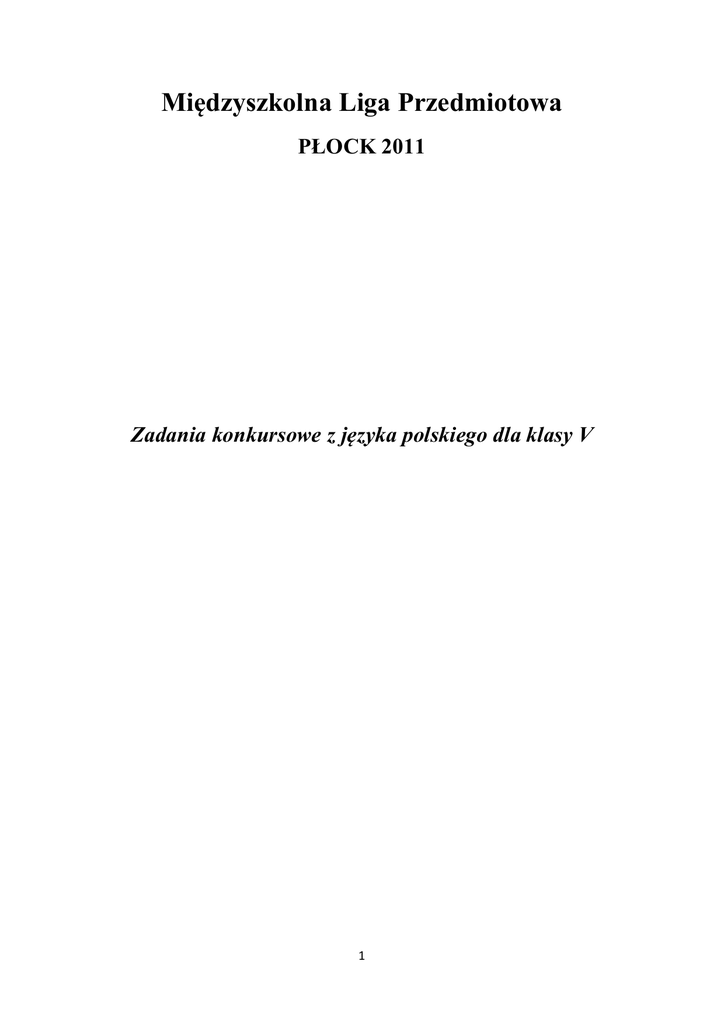 Międzyszkolna Liga Przedmiotowa PŁOCK 2011 Zadania konkursowe z języka polskiego dla klasy V 1 Witamy Cię na XVII Międzyszkolnej Lidze Przedmiotowej. Przed Tobą zadania konkursowe z języka polskiego dla klasy V. Instrukcja 1. Przeczytaj uważnie teksty i polecenia. 2. W zadaniach, w których są podane cztery odpowiedzi: A, B, C, D, wybierz tylko jedną i zaznacz znakiem X. 3. Jeżeli się pomylisz, błędną odpowiedź otocz kółkiem i zaznacz inną. 4. Rozwiązania zadań, w których należy samodzielnie sformułować odpowiedź, zapisz czytelnie w wyznaczonych miejscach. Na wykonanie zadań masz 60 minut. Życzymy powodzenia! 2 Tekst I Gdzie jest moja córka? Persefona rosła otoczona nimfami i wesołymi leśnymi duszkami. Po mamie odziedziczyła miłość do przyrody. – Córeczko, zostaniesz tu sama? – zapytała któregoś dnia Demeter – muszę sprawdzić, czy zboża już dojrzewają. – Dobrze mamo – odpowiedziała Persefona. – Tylko pamiętaj, co ci mówiłam! – przestrzegała córkę Demeter. I poszła. Persefona westchnęła, spoglądając za znikającą w lesie matką. Dobrze wiedziała, o co jej chodziło – nieopodal, na ich ulubionej łące rosły piękne narcyzy. Za nic nie można było ich zrywać, bo podobno przynosiły nieszczęście. Ale były tak piękne, tak piękne! I tak cudownie pachniały! Zamyślona Persefona przyklęknęła przy kwiatku i … – nim zorientowała się, co robi – zerwała go. Teraz proszę, ażeby wszyscy co bardziej strachliwi czytelnicy zamknęli oczy. Bo ziemia rozstąpiła się nagle z przerażającym hukiem i z jej wnętrza wyjechał na wspaniałym rydwanie straszliwy bóg krainy umarłych, Hades! Chwycił oniemiałą dziewczynę, wciągnął do swego rydwanu i nie minęła sekunda, jak obydwoje zniknęli w podziemnych czeluściach! Persefona nie zdążyła nawet krzyknąć. Ziemia zamykała się za nim powoli, tak jak zamyka się porastająca leśne stawy rzęsa za rzuconym do wody kamieniem. Demeter, tknięta jakimś przeczuciem, wróciła wcześniej niż to miała w planach. Patrzyła z niepokojem na łąkę, gdzie rankiem pożegnała się z córką. – Córko! – zawołała Demeter. – Córeczko! Gdzie jesteś?! Ale odpowiedziała jej tylko cisza. Nawet echo tym razem nie odważyło się odezwać. – Córuś! – krzyknęła ponownie. A potem, nie mogąc już dłużej znieść porażającej martwoty, która zdawała się ją osaczać z każdej strony, ruszyła na poszukiwanie córki. Ech, gdzież jej nie było… Przemierzyła wzdłuż i wszerz cały las, wszystkie łąki, uroczyska i pachnące kwiatami polanki, wszystkie zagajniki, sady i winnice. Była w miejscach, gdzie źródła rozpoczynają swój bieg, jak i tam, gdzie kończą żywot, wpadając do rzek lub wodnych oczek. Odwiedziła nimfy, boginie i leśne duszki – lecz nikt nie potrafił powiedzieć zrozpaczonej matce, co stało się z Persefoną. Aż nadeszła noc, a wraz z nocą czarne myśli. – Córuś… - szeptała Demeter, patrząc przez łzy na uśpiony świat. – Gdzie jesteś, moja córeczko? Nieopodal przechodziła Hekate, bogini nocy i ciemności, i poradziła Demeter, aby udała się do Heliosa, Bóg Słońca przekazał matce przerażającą wiadomość. Persefonę porwał Hades, władca świata umarłych. Zagniewana Demeter podążyła z interwencją do Zeusa, który nie tylko o wszystkim wiedział, ale sam już dawno temu obiecał, iż Persefona zostanie żoną Hadesa. Albo mi zwrócą córkę – zazgrzytała zębami Demeter – albo moja noga nigdy więcej tu nie postanie! Zeus wzruszył ramionami. Phi, też mi groźba… Jednak już wkrótce musiał przyznać, że nie warto było wszczynać sporu z rozeźloną matką. Bo ledwo Demeter opuściła Olimp, zaraz rzuciła klątwę na całą ziemię. – Niech stanie się nieurodzajna, sucha, opustoszała! I stało się. Ludzie patrzyli z przerażeniem na marniejące zboża, na wysychające winnice, na drzewa owocowe, które kurczyły się pod palącymi promieniami słońca. Z dnia na 3 dzień zapomnieli, co to jest dobrobyt. I wtedy dopiero Zeus zrozumiał – jeśli ludzie nie będą mieli co jeść, z pewnością nie będą też mieli czym dzielić się z bogami, a przecież cały Olimp zdążył się już przyzwyczaić do ofiar składanych przez śmiertelników. – No dobra – mruknął Zeus – Ta mała musi wrócić do matki! I zaraz powiadomił o swojej decyzji Hadesa. Bóg podziemi był zrozpaczony. Tak bardzo pokochał tę przepiękną dziewczynę, a teraz ma się z nią żegnać? Nim więc wypuścił Persefonę z podziemi, poczęstował ją jakimś owocem – w ciemności Persefona nawet nie dostrzegła, jakim… – Ha! – krzyknął Hades. – właśnie zostałaś moją żoną! – Co? – zdziwił się Zeus. – Jak to?! – zawołała Demeter. A Persefona patrzyła na niego jak na wariata. – No tak – tłumaczył Hades. – to był owoc granatu, a przecież stara tradycja głosi, że jeśli kobieta zje granat, zostanie żoną mężczyzny, który ją poczęstował. Zakłopotany władca Olimpu podrapał się w głowę. Fakt jest faktem – tradycji zmieniać nie można. Co robić? – Dużo zjadłaś? – zapytał Zeus patrząc na Persefonę. – Trzy kawałki – wyszeptała dziewczyna. – W takim razie – wymyślił Zeus – jedną trzecią roku będziesz odtąd spędzała ze swoim mężem, w podziemiach… Hades aż podskoczył z radości do góry! – A pozostałe miesiące – ciągnął Zeus – spędzisz z matką, na ziemi. Od tamtej pory wiosnę, lato, a i część jesieni Demeter spędzała wraz z córką, przed zimą zaś żegnały się i Persefona wracała do męża. Kto wie, może właśnie dlatego zimy są tak smutne? Na podstawie: Grzegorz Kasdepke, Mity dla dzieci, Wydawnictwo Literatura, Łódź 2011. Zadanie 1. (0–1) Jakim drugim imieniem nazywana jest Persefona? …...................................................................................