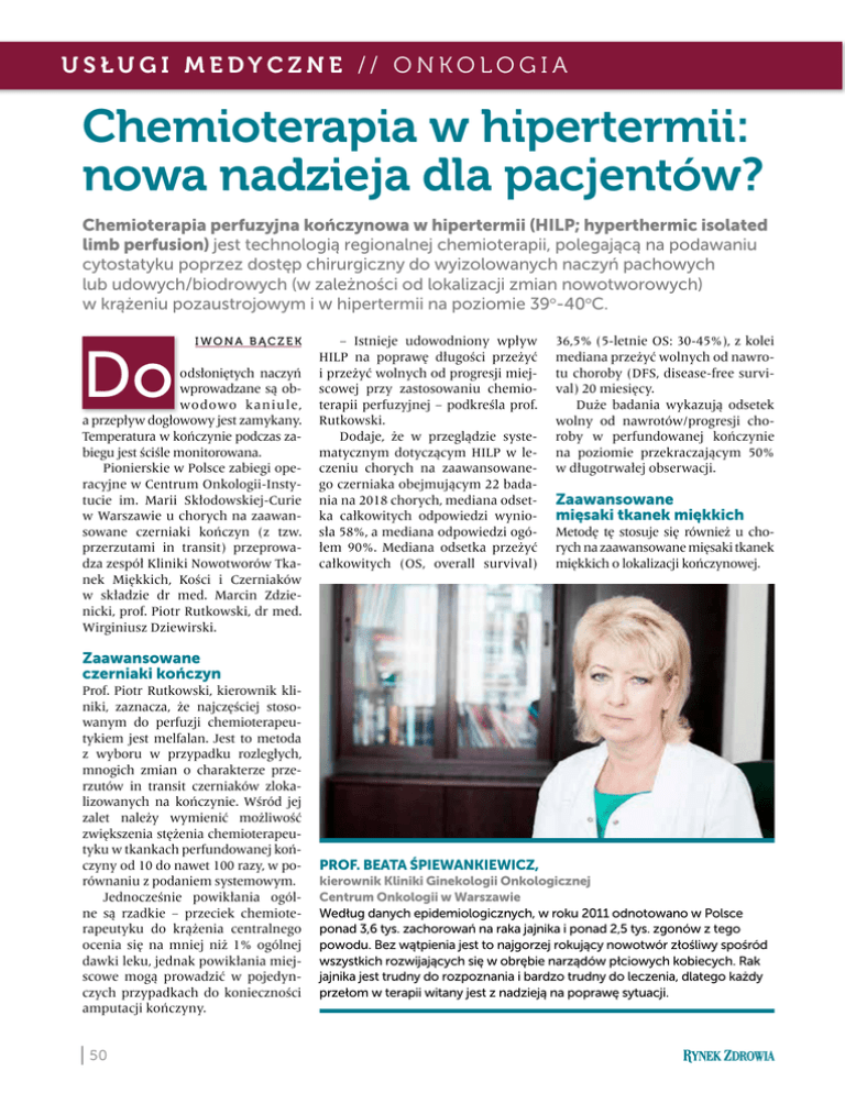USŁUGI MEDYCZNE // Onkologia Chemioterapia w hipertermii: nowa nadzieja dla pacjentów? Chemioterapia perfuzyjna kończynowa w hipertermii (HILP; hyperthermic isolated limb perfusion) jest technologią regionalnej chemioterapii, polegającą na podawaniu cytostatyku poprzez dostęp chirurgiczny do wyizolowanych naczyń pachowych lub udowych/biodrowych (w zależności od lokalizacji zmian nowotworowych) w krążeniu pozaustrojowym i w hipertermii na poziomie 39o-40oC. Do IWONA BĄCZEK odsłoniętych naczyń wprowadzane są obwodowo kaniule, a przepływ dogłowowy jest zamykany. Temperatura w kończynie podczas zabiegu jest ściśle monitorowana. Pionierskie w Polsce zabiegi operacyjne w Centrum Onkologii-Instytucie im. Marii Skłodowskiej-Curie w Warszawie u chorych na zaawansowane czerniaki kończyn (z tzw. przerzutami in transit) przeprowadza zespół Kliniki Nowotworów Tkanek Miękkich, Kości i Czerniaków w składzie dr med. Marcin Zdzienicki, prof. Piotr Rutkowski, dr med. Wirginiusz Dziewirski. – Istnieje udowodniony wpływ HILP na poprawę długości przeżyć i przeżyć wolnych od progresji miejscowej przy zastosowaniu chemioterapii perfuzyjnej – podkreśla prof. Rutkowski. Dodaje, że w przeglądzie systematycznym dotyczącym HILP w leczeniu chorych na zaawansowanego czerniaka obejmującym 22 badania na 2018 chorych, mediana odsetka całkowitych odpowiedzi wyniosła 58%, a mediana odpowiedzi ogółem 90%. Mediana odsetka przeżyć całkowitych (OS, overall survival) 36,5% (5-letnie OS: 30-45%), z kolei mediana przeżyć wolnych od nawrotu choroby (DFS, disease-free survival) 20 miesięcy. Duże badania wykazują odsetek wolny od nawrotów/progresji choroby w perfundowanej kończynie na poziomie przekraczającym 50% w długotrwałej obserwacji. Zaawansowane mięsaki tkanek miękkich Metodę tę stosuje się również u chorych na zaawansowane mięsaki tkanek miękkich o lokalizacji kończynowej. Zaawansowane czerniaki kończyn Prof. Piotr Rutkowski, kierownik kliniki, zaznacza, że najczęściej stosowanym do perfuzji chemioterapeutykiem jest melfalan. Jest to metoda z wyboru w przypadku rozległych, mnogich zmian o charakterze przerzutów in transit czerniaków zlokalizowanych na kończynie. Wśród jej zalet należy wymienić możliwość zwiększenia stężenia chemioterapeutyku w tkankach perfundowanej kończyny od 10 do nawet 100 razy, w porównaniu z podaniem systemowym. Jednocześnie powikłania ogólne są rzadkie – przeciek chemioterapeutyku do krążenia centralnego ocenia się na mniej niż 1% ogólnej dawki leku, jednak powikłania miejscowe mogą prowadzić w pojedynczych przypadkach do konieczności amputacji kończyny. 50 Prof. Beata Śpiewankiewicz, kierownik Kliniki Ginekologii Onkologicznej Centrum Onkologii w Warszawie Według danych epidemiologicznych, w roku 2011 odnotowano w Polsce ponad 3,6 tys. zachorowań na raka jajnika i ponad 2,5 tys. zgonów z tego powodu. Bez wątpienia jest to najgorzej rokujący nowotwór złośliwy spośród wszystkich rozwijających się w obrębie narządów płciowych kobiecych. Rak jajnika jest trudny do rozpoznania i bardzo trudny do leczenia, dlatego każdy przełom w terapii witany jest z nadzieją na poprawę sytuacji. w i ę c e j W p o r ta l u Zespół Centrum Onkologii-Instytutu w Warszawie przygotowuje się obecnie do wprowadzenia tej metody – wymaga ona dołączenia rekombinowanego czynnika martwicy nowotworów (TNF alfa) z monitorowaniem ewentualnego przecieku systemowego za pomocą radioizotopu. Technika ta pozwala na zaoszczędzenie kończyny w ponad 70% przypadków granicznie operacyjnych lub nieresekcyjnych. Duże europejskie badanie (186 chorych) o charakterze retrospektywnym u chorych na wyjściowo nieresekcyjne/granicznie resekcyjne miejscowo zaawansowane mięsaki kończyn (poddane HILP melfalan + TNFalfa) wykazało u 18% chorych całkowite odpowiedzi, u 57% częściowe odpowiedzi oraz u 82% wykonano zabiegi oszczędzające kończynę z radykalnym wycięciem mięsaka. Uzupełniająca radioterapia jest postępowaniem z wyboru (tak jak w przypadku większości mięsaków tkanek miękkich podczas leczenia skojarzonego) po resekcji resztkowego mięsaka po HILP, ponieważ dodatkowo poprawia kontrolę miejscową. Jak informuje prof. Rutkowski, w przeglądzie systematycznym wyników leczenia chorych na zaawansowane mięsaki za pomocą HILP (w większości przypadków melfalan + TNFalfa) uwzględniono 18 badań obejmujących 1030 chorych: odsetek odpowiedzi ogółem 72%, odsetek odpowiedzi całkowitych 22%, odsetek operacji oszczędzających kończynę 81%. Nawroty miejscowe wystąpiły u 27% chorych, a przerzuty odległe u 40% chorych, amputacje z powodu powikłań metody jedynie u 1,2% chorych. 5-letnie przeżycia specyficzne dla mięsaka po resekcji R0 wyniosły 63% (co jest podobne do wyników w populacji chorych na MTM o wysokim stopniu złośliwości histologicznej). Badanie II fazy porównujące HILP z 4 różnymi dawkami TNF-alfa wskazuje, że nie ma różnic w odpowiedziach w zależności od dawki, ale toksyczność systemowa jest znacznie mniejsza przy stosowaniu niższych dawek (1 mg). Przełom w terapii raka jajnika? – Według danych epidemiologicznych, w roku 2011 odnotowano w Polsce ponad 3,6 tys. zachorowań na raka jajnika i ponad 2,5 tys. zgonów z tego powodu. Bez wątpienia jest to najgorzej rokujący nowotwór złośliwy spośród wszystkich rozwijających się w obrębie narządów płciowych kobiecych – mówi prof. Beata Śpiewankiewicz, kierownik Kliniki Ginekologii Onkologicznej Centrum Onkologii-Instytutu im. Marii Skłodowskiej-Curie w Warszawie. Dodaje: – Rak jajnika jest trudny do rozpoznania i bardzo trudny do leczenia, dlatego każdy przełom w terapii witany jest z nadzieją na poprawę sytuacji. Wydaje się, że chemioterapia dootrzewnowa w warunkach hipertermii (HIPEC) jest obiecującym postępowaniem, mogącym odmienić losy chorych na raka jajnika Zapraszamy do lekt
