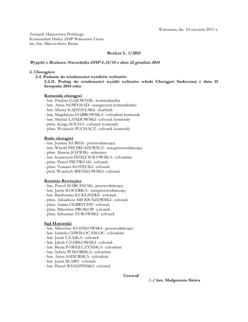 Warszawa, dn. 16 stycznia 2015 r. Związek Harcerstwa Polskiego Komendant Hufca ZHP Warszawa Ursus im. hm. Mieczysława Bema Rozkaz L. 1/2015 Wyjątki z Rozkazu Naczelnika ZHP L.11/14 z dnia 22 grudnia 2014 2. Chorągiew 2.4. Podanie do wiadomości wyników wyborów 2.4.11. Podaję do wiadomości wyniki wyborów władz Chorągwi Stołecznej z dnia 15 listopada 2014 roku Komenda chorągwi - hm. Paulina GAJOWNIK- komendantka - hm. Anna NOWOSAD- zastępczyni komendantki - hm. Maciej KĄDZIELSKI- skarbnik - hm. Magdalena DĄBROWSKA- członkini komendy - hm. Michał LANDOWSKI- członek komendy - phm. Kinga SOCHA- członek komendy - phm. Wojciech PUCHACZ- członek komendy Rada chorągwi - hm. Joanna NUREK- przewodnicząca - hm. Witold PIETRUSZEWICZ- wiceprzewodniczący - phm. Marcin JÓŹWIK- sekretarz - hm. Katarzyna DZIĘCIOŁOWSKA- członkini - phm. Paweł PIETRZAK- członek - phm. Tomasz KOTECKI- członek - pwd. Wojciech BIEŃKOWSKI- członek Komisja Rewizyjna - hm. Paweł MARCINIAK- przewodniczący - hm. Jacek KOCERKA- wiceprzewodniczący - hm. Bartłomiej KUKLIŃSKI- członek - phm. Arkadiusz MIODUSZEWSKI- członek - phm. Adam OLBRYCHT- członek - phm. Mirosław PROKOP- członek - phm. Sebastian ŻURAWSKI- członek Sąd Harcerski - hm. Mirosław KOZIKOWSKI- przewodniczący - hm. Izabela CHWIŁOC-FIŁOC- członkini - hm. Jacek CZAJKA- członek - hm. Jakub CZARKOWSKI- członek - hm. Beata PAWEŁCZYŃSKA- członkini - hm. Sylwia POKORSKA- członkini - hm. Anna SADURSKA- członkini - hm. Jacek SŁABY- członek - hm. Paweł WESZPIŃSKI- członek Czuwaj! /-/ hm. Małgorzata Sinica Wyjątki z Rozkazu Komendantki Chorągwi Stołecznej ZHP L. 1/15 z dnia 16 stycznia 2015r. 7. Harcerska Akcja Letnia i Zimowa 7.1. Zwolnienia i mianowana komendantów 7.1.1. Mianuję komendantów zimowisk i biwaków Harcerskiej Akcji Zimowej’2015: - hm. Iwona GAŁCZYŃSKA – zimowisko 40 WDHiW w Tyliczu, w terminie 16-25.01.15r. - hm. Paweł CHEMPIŃSKI – zimowisko Szczepu 136 w Schronisku Głodówka, w terminie 25-31.01.15r. 13. Odznaka Kadry Kształcącej 13.3 Przedłużenie ważności Odznaki Kadry Kształcącej 13.1.1. Na wniosek Komendantki Szkoły Instruktorskiej „Iluminacja” przedłużam ważność Brązowej Odznaki Kadry Kształcącej do 16 stycznia 2018r. hm. Tomaszowi BARLAKOWI – Hufiec Warszawa Ursynów (BOKK/520/2015) Czuwaj! /-/ hm. Paulina Gajownik 1. Zarządzenie i informacje. 1.2. Informacje 1.2.1. Informuję o przyjętych przez Komendę Hufca uchwałach: - Uchwała Komendy Hufca ZHP Warszawa Ursus nr 2/2014 z dnia 30 grudnia 2014r. w sprawie przyjęcia Regulaminu Pracy Komendanta i Komendy, - Uchwała Komendy Hufca ZHP Warszawa Ursus nr 3/2014 z dnia 30 grudnia 2014r. w sprawie przyjęcia Podziału zadań przypisanych członkom Komendy Hufca. - Uchwała Komendy Hufca ZHP Warszawa Ursus nr 1/2015 z dnia 13 stycznia 2015r. w sprawie przyjęcia Planu Operacyjnego Hufca ZHP Warszawa Ursus na rok 2015. 2. Hufiec 2.2. Mianowania w komendzie hufca 2.2.1. Mianuję druha phm. Michała WINEK na funkcję Pełnomocnika komendanta ds. HALiZ 2.4. Podanie do wiadomości wyników wyborów 2.4.1. Podaję do wiadomości wyniki wyborów Komendanta i Komendy Hufca z dnia 20 grudnia 2014 roku - hm. Paweł CHEMPIŃSKI – komendant - phm. Katarzyna WINEK – skarbnik - pwd. Robert RYBIŃSKI – zastępca ds. programowo-organizacyjnych - hm. Tomasz BARLAK – zastępca ds. pracy z kadrą 13. Inne 13.1. Informuję, że Kurs Przewodnikowski „MANASLU” ukończyli: - Anna ROSTKOWSKA - Ewelina BIAŁEK - Katarzyna KANAR - Piotr MRÓZ 13.2. Informuję, że Kurs Przybocznych „Ogień” ukończyli: - Sylwia DOBKOWSKA - Duchna ŁOSIAK - Małgorzata POPŁAWSKA - Maciej KACZKOWSKI - Krzysztof BRONIAREK 13.3. Na wniosek szefa szkolenia Wędrowniczego kursu I-ej pomocy HSR, przyznaję Brązową odznakę Ratownika ZHP druhnie Ewelinie BIAŁEK Czuwaj! /-/ hm. Paweł Chempiński