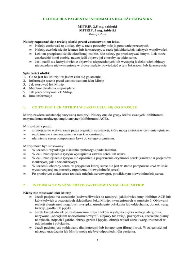 ULOTKA DLA PACJENTA: INFORMACJA DLA UśYTKOWNIKA MITRIP, 2,5 mg, tabletki MITRIP, 5 mg, tabletki Ramiprilum NaleŜy zapoznać się z treścią ulotki przed zastosowaniem leku. • NaleŜy zachować tę ulotkę, aby w razie potrzeby móc ją ponownie przeczytać. • NaleŜy zwrócić się do lekarza lub farmaceuty, w razie jakichkolwiek dalszych wątpliwości. • Lek ten przepisano ściśle określonej osobie. Nie naleŜy go przekazywać innym. Lek moŜe zaszkodzić innej osobie, nawet jeśli objawy jej choroby są takie same. • Jeśli nasili się którykolwiek z objawów niepoŜądanych lub wystąpią jakiekolwiek objawy niepoŜądane niewymienione w ulotce, naleŜy powiedzieć o tym lekarzowi lub farmaceucie. Spis treści ulotki: 1. Co to jest lek Mitrip i w jakim celu się go stosuje 2. Informacje waŜne przed zastosowaniem leku Mitrip 3. Jak stosować lek Mitrip 4. MoŜliwe działania niepoŜądane 5. Jak przechowywać lek Mitrip 6. Inne informacje 1. CO TO JEST LEK MITRIP I W JAKIM CELU SIĘ GO STOSUJE Mitrip zawiera substancję nazywaną ramipryl. NaleŜy ona do grupy leków zwanych inhibitorami enzymu konwertującego angiotensynę (inhibitorami ACE). Mitrip działa przez: • zmniejszenie wytwarzania przez organizm substancji, które mogą zwiększać ciśnienie tętnicze, • rozluźnienie i rozszerzenie naczyń krwionośnych, • ułatwienie sercu pompowania krwi do całego organizmu. Mitrip moŜe być stosowany: • W leczeniu wysokiego ciśnienia tętniczego (nadciśnienia). • W celu zmniejszenia ryzyka wystąpienia zawału serca lub udaru. • W celu zmniejszenia ryzyka lub opóźnienia pogorszenia czynności nerek (zarówno u pacjentów z cukrzycą, jak i bez cukrzycy). • W leczeniu choroby serca, w przypadku której serce nie jest w stanie pompować krwi w ilości wystarczającej na potrzeby organizmu (niewydolność serca). • Po przebytym ataku serca (zawale mięśnia sercowego), powikłanym niewydolnością serca. 2. INFORMACJE WAśNE PRZED ZASTOSOWANIEM LEKU MITRIP Kiedy nie stosować leku Mitrip • JeŜeli pacjent ma uczulenie (nadwraŜliwość) na ramipryl, jakikolwiek inny inhibitor ACE lub którykolwiek z pozostałych składników leku Mitrip, wymienionych w punkcie 6. Objawami reakcji alergicznej mogą być: wysypka, utrudnienie połykania lub oddychania, obrzęk warg, twarzy, gardła lub języka. • JeŜeli kiedykolwiek po zastosowaniu innych leków wystąpiła cięŜka reakcja alergiczna, nazywana „obrzękiem naczynioruchowym”. Objawy to: świąd, pokrzywka, czerwone plamy na rękach, stopach i gardle, obrzęk gardła i języka, obrzęk wokół oczu i warg, trudności w oddychaniu i połykaniu. • JeŜeli pacjent jest poddawany dializoterapii lub innego typu filtracji krwi. W zaleŜności od uŜytego urządzenia lek Mitrip moŜe nie być odpowiedni dla pacjenta. 1 • • • • Jeśli u pacjenta stwierdzono choroby nerek związane ze zmniejszonym dopływem krwi do nerek (zwęŜenie tętnicy nerkowej). JeŜeli stwierdzono zaburzenia dotyczące nerek, w których dopływ krwi do nerek jest zmniejszony (zwęŜenie tętnicy nerkowej). Po 3. miesiącu ciąŜy (naleŜy równieŜ unikać stosowania leku Mitrip we wczesnym okresie ciąŜy, patrz poniŜej punkt “CiąŜa i karmienie piersią”). W przypadku nieprawidłowo niskiego lub niestabilnego ciśnienia tętniczego. Lekarz zaleci wówczas wykonanie odpowiednich badań. Nie naleŜy przyjmować leku Mitrip, jeŜeli którykolwiek z powyŜszych stanów dotyczy pacjenta. W razie wątpliwości naleŜy skontaktować się z lekarzem przed zastosowaniem leku Mitrip. Kiedy naleŜy zachować szczególną ostroŜność stosując lek Mitrip NaleŜy skonsultować się z lekarzem lub farmaceutą przed zastosowaniem leku Mitrip: • JeŜeli stwierdzono zaburzenia dotyczące serca, wątroby lub nerek. • W przypadku znacznej utraty soli lub płynów z organizmu (z powodu wymiotów, biegunki, nadmiernego pocenia się, stosowania diety z ograniczeniem soli, przyjmowania leków moczopędnych (diuretyków) przez długi okres czasu lub dializoterapii). • JeŜeli planowane jest leczenie mające zmniejszyć uczulenie na jad pszczół lub os (leczenie odczulające). • JeŜeli planowane jest podanie leków znieczulających. Mogą być podane przed zabiegiem chirurgicznym lub kaŜdym zabiegiem stomatologicznym. MoŜe być konieczne przerwanie stosowania leku Mitrip jeden dzień wcześniej; naleŜy skonsultować się z lekarzem. • JeŜeli stwierdzono duŜe stęŜenie potasu we krwi (w badaniach krwi). • JeŜeli stwierdzono kolagenozę naczyń taką, jak twardzina skóry lub toczeń rumieniowaty układowy. NaleŜy poinformować lekarza o podejrzeniu lub planowaniu ciąŜy. Nie zaleca się stosowania leku Mitrip we wczesnym okresie ciąŜy i nie wolno go przyjmować po 3. miesiącu ciąŜy, poniewaŜ stosowany w tym okresie moŜe powaŜnie zaszkodzić dziecku, patrz punkt „CiąŜa i karmienie piersią”. Dzieci Nie zaleca się stosowania leku Mitrip u dzieci i młodzieŜy w wieku poniŜej 18 lat, ze względu na brak danych dotyczących tej grupy wiekowej. JeŜeli którykolwiek z powyŜszych stanów dotyczy pacjenta (lub występują wątpliwości), naleŜy skonsultować się z lekarzem przed zastosowaniem leku Mitrip. Stosowanie innych leków NaleŜy powiedzieć lekarzowi lub farmaceucie o wszystkich przyjmowanych aktualnie lub ostatnio lekach, równieŜ tych, które wydawane są bez recepty (w tym o lekach ziołowych). Lek Mitrip moŜe wpłynąć na działanie innych leków. RównieŜ inne leki mogą wpłynąć na działanie leku Mitrip. NaleŜy poinformować lekarza o przyjmowaniu któregokolwiek z poniŜszych leków. Mogą one osłabić działanie leku Mitrip: • Leki przeciwbólowe i przeciwzapalne (np. niesteroidowe leki przeciwzapalne (NLPZ) takie, jak ibuprofen lub indometacyna oraz kwas acetylosalicylowy). • Leki stosowane w leczeniu niskiego ciśnienia tętniczego, wstrząsu, niewydolności serca, astmy l
