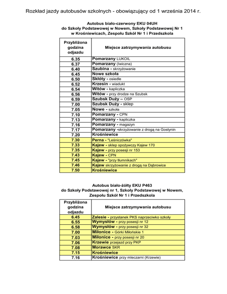 Rozkład jazdy autobusów szkolnych - obowiązujący od 1 września 2014 r. Autobus biało-czerwony EKU 04UH do Szkoły Podstawowej w Nowem, Szkoły Podstawowej Nr 1 w Krośniewicach, Zespołu Szkół Nr 1 i Przedszkola Przybliżona godzina odjazdu 6.35 6.37 6.40 6.45 6.50 6.52 6.54 6.56 6.59 7.00 7.05 7.10 7.13 7.16 7.17 7.20 7.30 7.33 7.35 7.43 7.45 7.46 7.50 Miejsce zatrzymywania autobusu Pomarzany LUKOIL Pomarzany (Iwiczna) Szubina - skrzyżowanie Nowe szkoła Skłóty - osiedle Krzesin - wiadukt Witów - kapliczka Witów - przy drodze na Szubsk Szubsk Duży – OSP Szubsk Duży - sklep Nowe - szkoła Pomarzany - CPN Pomarzany - kapliczka Pomarzany - magazyn Pomarzany -skrzyżowanie z drogą na Gostynin Krośniewice Perna - "Leśniczówka" Kajew - sklep spożywczy Kajew 170 Kajew - przy posesji nr 153 Kajew - CPN Kajew - "przy tłumnikach" Kajew skrzyżowanie z drogą na Dąbrowice Krośniewice Autobus biało-żółty EKU P463 do Szkoły Podstawowej nr 1, Szkoły Podstawowej w Nowem, Zespołu Szkół Nr 1 i Przedszkola Przybliżona godzina odjazdu 6.45 6.55 6.58 7.00 7.03 7.06 7.08 7.15 7.16 Miejsce zatrzymywania autobusu Zalesie - przystanek PKS naprzeciwko szkoły Wymysłów - przy posesji nr 12 Wymysłów - przy posesji nr 32 Miłonice - Górki Miłońskie 1 Miłonice - przy posesji nr 20 Krzewie przejazd przy PKP Morawce SKR Krośniewice Krośniewice przy mleczarni (Krzewie) Rozkład jazdy autobusów szkolnych - obowiązujący od 1 września 2014 r. 7.25 7.28 7.30 7.32 7.34 7.40 7.44 7.46 7.50 Godzięby - bloki Wola Nowska II - skrzyżowanie Wola Nowska - skrzyżowanie na Godzięby Wola Nowska - OSP Wola Nowska/ Nowe 60 Nowe - szkoła Pawlikowice - przy posesji nr 19 Pawlikowice - przy posesji nr 10 Krośniewice Autobus pomarańczowy EKU 54NJ do Szkoły Podstawowej Nr 1 w Krośniewicach, Zespołu Szkół Nr 1 i Przedszkola Przybliżona godzina odjazdu 6.40 6.45 6.50 6.55 7.02 7.08 7.12 7.26 Przybliżona godzina odjazdu 7.30 7.35 7.39 7.43 7.45 7.47 7.55 Miejsce zatrzymywania autobusu Jankowice - przy posesji nr 4 Głogowa - przystanek PKS Wychny - przy posesji nr 3 Wychny - przy posesji nr 19 Franki - przy posesji nr 7 Suchodoły - przy posesji nr 14 Bielice - sklep Krośniewice Miejsce zatrzymywania autobusu Głaznów Bardzinek Teresin - świetlica Kopy - przy posesji nr 36 Kopy - przy posesji nr 19 Kopy - przy kapliczce Krośniewice