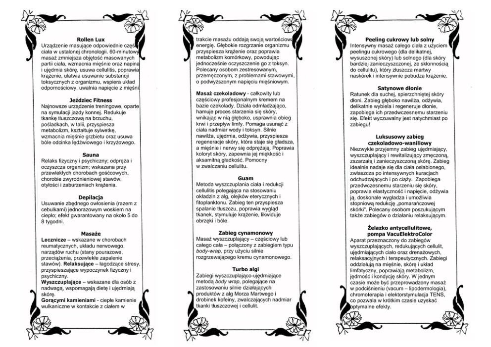 Rollen Lux Urządzenie masujące odpowiednie części ciała w ustalonej chronologii. 60-minutowy masaŜ zmniejsza objętość masowanych partii ciała, wzmacnia mięśnie oraz napina i ujędrnia skórę, usuwa cellulitis, poprawia krąŜenie, ułatwia usuwanie substancji toksycznych z organizmu, wspiera układ odpornościowy, uwalnia napięcie z mięśni. Jeździec Fitness Najnowsze urządzenie treningowe, oparte na symulacji jazdy konnej. Redukuje tkankę tłuszczową na brzuchu, pośladkach, w talii, przyspiesza metabolizm, kształtuje sylwetkę, wzmacnia mięśnie grzbietu oraz usuwa bóle odcinka lędźwiowego i krzyŜowego. Sauna Relaks fizyczny i psychiczny; odpręŜa i oczyszcza organizm; wskazana przy przewlekłych chorobach gośćcowych, chorobie zwyrodnieniowej stawów, otyłości i zaburzeniach krąŜenia. Depilacja Usuwanie zbędnego owłosienia (razem z cebulkami) jednorazowym woskiem na ciepło; efekt gwarantowany na około 5 do 8 tygodni. MasaŜe Lecznicze – wskazane w chorobach reumatycznych, układu nerwowego, narządów ruchu (stany pourazowe, przeciąŜenia, przewlekłe zapalenie stawów). Relaksujące – łagodzące stresy, przyspieszające wypoczynek fizyczny i psychiczny. Wyszczuplające – wskazane dla osób z nadwagą, wspomagają dietę i ujędrniają skórę. Gorącymi kamieniami - ciepłe kamienie wulkaniczne w kontakcie z ciałem w trakcie masaŜu oddają swoją wartościową energię. Głębokie rozgrzanie organizmu przyspiesza krąŜenie oraz poprawia metabolizm komórkowy, powodując jednocześnie oczyszczenie go z toksyn. Polecany osobom zestresowanym, przemęczonym, z problemami stawowymi, o podwyŜszonym napięciu mięśniowym. MasaŜ czekoladowy - całkowity lub częściowy profesjonalnym kremem na bazie czekolady. Działa odmładzająco, hamuje proces starzenia się skóry, wnikając w nią głęboko, usprawnia obieg krwi i przepływ limfy. Pomaga usunąć z ciała nadmiar wody i toksyn. Silnie nawilŜa, ujędrnia, odŜywia, przyspiesza regeneracje skóry, która staje się gładsza, a mięśnie i nerwy się odpręŜają. Poprawia koloryt skóry, zapewnia jej miękkość i aksamitną gładkość. Pomocny w zwalczaniu cellulitu. Guam Metoda wyszczuplania ciała i redukcji cellulitis polegająca na stosowaniu okładzin z alg, olejków eterycznych i fitoplanktonu. Zabieg ten przyspiesza spalanie tłuszczu, poprawia wygląd tkanek, stymuluje krąŜenie, likwiduje obrzęki i bóle. Zabieg cynamonowy MasaŜ wyszczuplający – częściowy lub całego cała – połączony z zabiegiem typu body-wrap, przy uŜyciu silnie rozgrzewającego kremu cynamonowego. Turbo algi Zabiegi wyszczuplająco-ujędrniające metodą body wrap, polegające na zastosowaniu silnie działających produktów z alg Morza Martwego i drobinek kofeiny, zwalczających nadmiar tkanki tłuszczowej i cellulit. Peeling cukrowy lub solny Intensywny masaŜ całego ciała z uŜyciem peelingu cukrowego (dla delikatnej, wysuszonej skóry) lub solnego (dla skóry bardziej zanieczyszczonej, ze skłonnością do cellulitu), który złuszcza martwy naskórek i intensywnie pobudza krąŜenie. Satynowe dłonie Ratunek dla suchej, spierzchniętej skóry dłoni. Zabieg głęboko nawilŜa, odŜywia, delikatnie wybiela i regeneruje dłonie, zapobiega ich przedwczesnemu starzeniu się. Efekt wyczuwalny jest natychmiast po zabiegu! Luksusowy zabieg czekoladowo-waniliowy Niezwykle przyjemny zabieg ujędrniający, wyszczuplający i rewitalizujący zmęczoną, zszarzałą i zanieczyszczoną skórę. Zabieg idealnie nadaje się dla ciała osłabionego, zwłaszcza po intensywnych kuracjach odchudzających i po ciąŜy. Zapobiega przedwczesnemu starzeniu się skóry, poprawia elastyczność i napięcie, odŜywia ją, doskonale wygładza i umoŜliwia stopniową redukcję „pomarańczowej skórki". Polecany osobom poszukującym takŜe zabiegów o działaniu relaksującym. śelazko antycellulitowe, pompa VacuElektroColor Aparat przeznaczony do zabiegów wyszczuplających, redukujących cellulit, ujędrniających ciało oraz drenaŜowych, relaksacyjnych i terapeutycznych. Zabiegi oddziałują na mięśnie, skórę i układ limfatyczny, poprawiają metabolizm, jędrność i kondycję skóry. W jednym czasie moŜe być przeprowadzony masaŜ w podciśnieniu (vacum – lipodermologia), chromoterapia i elektorstymulacja TENS, co pozwala w krótkim czasie uzyskać optymalne efekty. Cennik w zł Sauna 25 MasaŜ ręczny całkowity 85 leczniczy pleców 50 wyszczuplający 50 twarzy 20 MasaŜ gorącymi kamieniami 120 MasaŜ czekoladowy całkowity 100 częściowy 60 MasaŜ podwodny 30 Depilacja nogi 70 nogi + bikini 85 podudzia 40 uda 40 bikini 30-35 pachy 25 twarz 15 ręce 35 Guam 90-135 Turbo algi 1 zabieg 90 6 zabiegów 450 Zabieg cynamonowy 60-100 Zabieg czekoladowy 170 Zabieg miodowy 170 Zabieg bursztynowy 170 Peeling 85 Satynowe dłonie 20 Solarium (10 min) 10 Rollen (60 min) 30 Jeździec fitness (15 min) 12 śelazko antycellulitowe (1 min) 2,50 Karnet powyŜej 200zł 10% taniej Zapraszamy Poniedziałek – Piątek: 9.00-13.00 i 16.30-21.00 Sobota (od X do VI): 9.00-13.00 Gdańsk, Al. Grunwaldzka 244 Przy GOKF Tel: 058 341-80-61 www.studiorelax.gda.pl