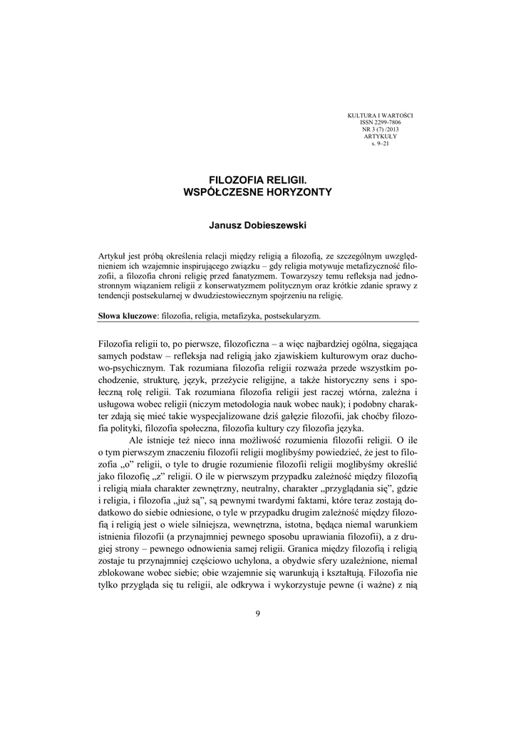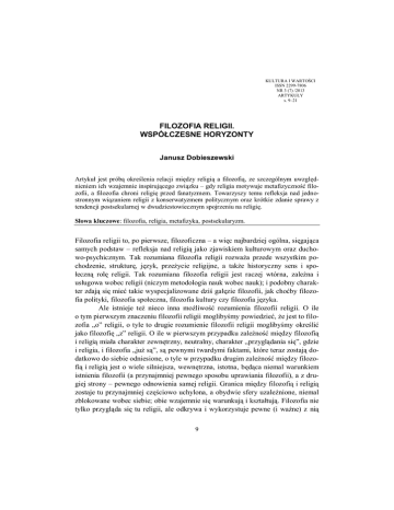 KULTURA I WARTOŚCI ISSN 2299-7806 NR 3 (7) /2013 ARTYKUŁY s. 9–21 FILOZOFIA RELIGII. WSPÓŁCZESNE HORYZONTY Janusz Dobieszewski Artykuł jest próbą określenia relacji między religią a filozofią, ze szczególnym uwzględnieniem ich wzajemnie inspirującego związku – gdy religia motywuje metafizyczność filozofii, a filozofia chroni religię przed fanatyzmem. Towarzyszy temu refleksja nad jednostronnym wiązaniem religii z konserwatyzmem politycznym oraz krótkie zdanie sprawy z tendencji postsekularnej w dwudziestowiecznym spojrzeniu na religię. Słowa kluczowe: filozofia, religia, metafizyka, postsekularyzm. Filozofia religii to, po pierwsze, filozoficzna – a więc najbardziej ogólna, sięgająca samych podstaw – refleksja nad religią jako zjawiskiem kulturowym oraz duchowo-psychicznym. Tak rozumiana filozofia religii rozważa przede wszystkim pochodzenie, strukturę, język, przeżycie religijne, a także historyczny sens i społeczną rolę religii. Tak rozumiana filozofia religii jest raczej wtórna, zależna i usługowa wobec religii (niczym metodologia nauk wobec nauk); i podobny charakter zdają się mieć takie wyspecjalizowane dziś gałęzie filozofii, jak choćby filozofia polityki, filozofia społeczna, filozofia kultury czy filozofia języka. Ale istnieje też nieco inna możliwość rozumienia filozofii religii. O ile o tym pierwszym znaczeniu filozofii religii moglibyśmy powiedzieć, że jest to filozofia „o” religii, o tyle to drugie rozumienie filozofii religii moglibyśmy określić jako filozofię „z” religii. O ile w pierwszym przypadku zależność między filozofią i religią miała charakter zewnętrzny, neutralny, charakter „przyglądania się”, gdzie i religia, i filozofia „już są”, są pewnymi twardymi faktami, które teraz zostają dodatkowo do siebie odniesione, o tyle w przypadku drugim zależność między filozofią i religią jest o wiele silniejsza, wewnętrzna, istotna, będąca niemal warunkiem istnienia filozofii (a przynajmniej pewnego sposobu uprawiania filozofii), a z drugiej strony – pewnego odnowienia samej religii. Granica między filozofią i religią zostaje tu przynajmniej częściowo uchylona, a obydwie sfery uzależnione, niemal zblokowane wobec siebie; obie wzajemnie się warunkują i kształtują. Filozofia nie tylko przygląda się tu religii, ale odkrywa i wykorzystuje pewne (i ważne) z nią 9 J. DOBIESZEWSKI – FILOZOFIA RELIGII. WSPÓŁCZESNE HORYZONTY powinowactwo, być może w efekcie również odnawiając współczesną religijność i współczesne rozumienie religii. Z jednej strony, religia jest wprawdzie czymś zasadniczo od filozofii różnym: religia odwołuje się do wiary i uczucia, filozofia – do wiedzy i rozumu; religia jest oparta na niepodważalnych (akceptowalnych mocą właśnie wiary) dogmatach, filozofia – nieustannie i krytycznie bada wszelkie (w tym własne) przekonania i twierdzenia; religia konstytuuje pewną wspólnotę wiernych (z różnymi tego konsekwencjami, w postaci choćby kultu), filozofia ma wyraźnie nastawienie indywidualistyczne i nonkonformistyczne. Ale też bez trudu daje się wskazać cechy podobne lub wręcz wspólne filozofii i religii. Obydwie mają przede wszystkim nastawienie całościowe; chcą mówić i odnosić człowieka do świata w ogóle, do jego najdalszego sensu i wymiaru, który religia nazywać będzie Bogiem, a filozofia – bytem lub Absolutem (nie unikając tu zresztą również pojęcia Boga); ujmując to nieco inaczej, i filozofia, i religia szukają dla świata i człowieka czegoś podstawowego, wyjściowego, pierwszego, nadającego światu integralność, uniwersalność, właśnie całościowość. W jeszcze innej formule, i filozofia, i religia mają nastawienie światopoglądowe, oferują twierdzenia czy wizje określające najbardziej kluczowe, najbardziej zasadnicze i najbardziej ogólne aspekty kształtu świata i funkcjonowania świata i odnajdywania się w nim człowieka. Wynika z tego dalej, że i filozofia, i religia nie poprzestają, zwracając się do człowieka, na sferze ludzkiej świadomości czy wiedzy; odnoszą się również do samego życia, do ludzkiego działania, wyborów, ich intencji i skutków. Stąd tak ogromna rola w filozofii i religii problematyki aksjologicznej, zwłaszcza moralnej; i filozofia, i religia starają się egzystencjalnie angażować człowieka. Dopiero zresztą wtedy i ujęcie człowieka, i świata, ma charakter całościowy, integralny, odniesiony do bytu czy Boga, a nie do jakichś jedynie relatywnych, a więc cząstkowych jakości. Religia bywała w historii – i bywa dzisiaj – przeszkodą oraz ograniczeniem dla ludzkiej wiedzy, rozwoju, afirmacji życia i świata, dla ludzkiej kreatywności i egzystencjalnego rozmachu; ale też potrafiła być rezerwą dla wolności, głębi i dalekosiężności myślenia – dla filozofii, a zwłaszcza dla jej działu podstawowego, ucieleśniającego całościowy, wolnościowy, twórczy wymiar filozofii, czyli dla metafizyki (ontologii). Właściwie to sama filozofia w pewnym momencie swego rozwoju zaprzeczyła własnemu całościowemu (metafizycznemu) etosowi, ograniczyła swe aspiracje, a gdy spróbowała do nich powrócić, to niejako natknęła się na przechowywane w religii „materiały”, niezbędne do swego całościowego, metafizycznego odrodzenia. To ograniczenie miało miejsce na przełomie XVI–XVII wieku, gdy filozofia przezwyciężała kanony Średniowiecza i kształtowała swój kształt nowożytny. 10 J. DOBIESZEWSKI – FILOZOFIA RELIGII. WSPÓŁCZESNE HORYZONTY Celem, który postawiła wówczas przed sobą filozofia, było osiągnięcie wiedzy pewnej, pozbawionej tej niejednoznaczności, nieprzejrzystości, a zarazem arbitralności i dogmatyczności, które dominowały nad rozumem w epoce średniowiecznej. Zarówno nowożytny racjonalizm, jak i empiryzm – bo szybko w takie dwa nurty uformowała się filozofia nowożytna