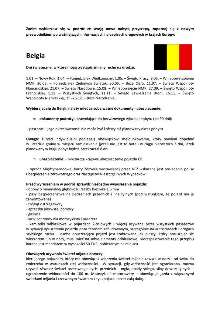 Zanim wybierzesz się w podróż ze swoją nowo nabytą przyczepą, zapoznaj się z naszym przewodnikiem po ważniejszych informacjach i przepisach drogowych w krajach Europy: Belgia Dni świąteczne, w które mogą wystąpić zmiany ruchu na drodze: 1.01. – Nowy Rok, 1.04. – Poniedziałek Wielkanocny, 1.05. – Święto Pracy, 9.05. – Wniebowstąpienie NMP, 20.05. – Poniedziałek Zielonych Świątek, 30.05. – Boże Ciało, 11.07. – Święto Wspólnoty Flamandzkiej, 21.07. – Święto Narodowe, 15.08. – Wniebowzięcie NMP, 27.09. – Święto Wspólnoty Francuskiej, 1.11. – Wszystkich Świętych, 11.11. – Święto Zawieszenia Broni, 15.11. – Święto Wspólnoty Niemieckiej, 25.-26.12. – Boże Narodzenie. Wybierając się do Belgii, należy mieć ze sobą ważne dokumenty i ubezpieczenie: • dokumenty podróży uprawniające do bezwizowego wjazdu i pobytu (do 90 dni): - paszport – jego okres ważności nie może być krótszy niż planowany okres pobytu Uwaga: Turyści indywidualni podlegają obowiązkowi meldunkowemu, który powinni dopełnić w urzędzie gminy w miejscu zamieszkania (jeżeli nie jest to hotel) w ciągu pierwszych 3 dni, jeżeli planowany w kraju pobyt będzie przekraczał 8 dni. • ubezpieczenie: – wystarcza krajowe ubezpieczenie pojazdu OC - oprócz Międzynarodowej Karty Zdrowia wystawianej przez NFZ wskazane jest posiadanie polisy ubezpieczenia zdrowotnego oraz Następstw Nieszczęśliwych Wypadków. Przed wyruszeniem w podróż sprawdź niezbędne wyposażenie pojazdu: - opony o minimalnej głębokości rzeźby bieżnika 1,6 mm - pasy bezpieczeństwa na siedzeniach przednich i na tylnych (pod warunkiem, że pojazd ma je zamontowane) - trójkąt ostrzegawczy - apteczka pierwszej pomocy - gaśnica - kask ochronny dla motocyklisty i pasażera - kamizelki odblaskowe w pojazdach 2-osiowych i więcej używane przez wszystkich pasażerów w sytuacji opuszczenia pojazdu poza terenem zabudowanym, szczególnie na autostradach i drogach szybkiego ruchu – osoba opuszczająca pojazd jest traktowana jak pieszy, który poruszając się wieczorem lub w nocy, musi mieć na sobie elementy odblaskowe. Nierespektowanie tego przepisu karane jest mandatem w wysokości 50 EUR, pobieranym na miejscu. Obowiązek używania świateł mijania dotyczy: kierującego pojazdem, który ma obowiązek włączenia świateł mijania zawsze w nocy i od świtu do zmierzchu w warunkach złej widoczności. W sytuacji, gdy widoczność jest ograniczona, można używać również świateł przeciwmgielnych: przednich – mgła, opady śniegu, silny deszcz; tylnych – ograniczenie widoczności do 100 m. Motocykle i motorowery – obowiązuje jazda z włączonymi światłami mijania i czerwonym światłem z tyłu pojazdu przez całą dobę. Zespoły jezdne powinny mieć następujące wymiary: - wysokość zewnętrzna – 4,0 m - szerokość zewnętrzna – 2,55 m - długość zewnętrzna zespołu pojazdów (samochód + przyczepa) – 18,0 m. Uprawnienia do prowadzenia pojazdu mają tylko osoby pełnoletnie, które ukończyły 18 lat. Zasady przewozu dzieci: Przewóz dzieci do 3. roku życia na przednim siedzeniu pojazdu jest dozwolony, ale pod warunkiem, że fotelik dziecka posiada świadectwo homologacji zezwalające na jego zamocowanie na przednim siedzeniu. Na tylnym siedzeniu wymagany jest fotelik specjalnie przystosowany do wymiarów i wagi dziecka. Obowiązuje zakaz przewozu dzieci w wieku 3-12 lat na przednim i tylnym siedzeniu pojazdu, o ile nie jest wyposażone w odpowiedni system zabezpieczający lub pasy. Na drodze należy poruszać się zgodnie z tabelą ograniczenia prędkości, km/h: - na terenie zabudowanym – do 50 km/h, o ile znaki nie wskazują inaczej - teren niezabudowany autostrady, szybkiego drogi ruchu inne drogi motocykl/samochód osobowy z przyczepą lub bez, inny pojazd do 3,5 tony 120 90 autokar 90 75 pojazd o DMC między 3,5 a 7,5 t 90 60 Uwaga: Minimalna prędkość na autostradzie – 70 km/h. Maksymalna prędkość przy holowaniu – 25 km/h. Na autostradzie holowanie dozwolone jest tylko do najbliższego zjazdu. Zakaz wjazdu na autostradę dla pojazdów 3-4-kołowych bez nadwozia o masie poniżej 400 kg. Strefy ze specjalnymi ograniczeniami prędkości : - strefa zamieszkania – 20 km/h - inne strefy, oznaczone odpowiednimi znakami – 30 km/h. Kwestia opłat drogowych na terytorium Belgii – sieć drogowa Belgii jest bardzo dobrze rozwinięta – liczy 1747 km autostrad. Dla pojazdów do 3,5 t nie obowiązuje viaTOLL, czyli nie pobiera się winietek opłat drogowych, których cena zależy od kategorii pojazdu i okresu pobytu. Opłaty pobierane są jedynie za przejazd tunelem Liefkenhoek (połączenie drogowe pod rzeką Scheldt k/Antwerpii). 6,0 19,00 Euro Euro Aktualne i szczegółowe informacje na temat utrudnień w ruchu można znaleźć na stronie: www.inforoutes.be Ograniczony ruch pojazdów handlowych – pojazdy powyżej 12 ton przewożące towary powinny wykupić w biurach celnych eurowinietki uprawniające do poruszania się po autostradach, obwodnicach Brukseli, Antwerpii, Charleroi, Gandawy i Courtrai oraz po drogach o numerach: 1,2, 3, 6, 7, 8, 9, 10, 20, 30, 40, 50, 60, 70, 80 i 90. Eurowinietki zachowują także ważność na poruszanie się po drogach Szwecji, Danii, Luksemburga i Holandii. Ceny eurowinietek (w EUR): pojazd/przyczepa do maks. 3 osi 4-o i więcej osiowe Euro0 EuroI EuroII Euro0 EuroI EuroII 1-dniowa 8 8 8 8 8 8 tygodniowa 26 23 20 41 37 33 miesięczna 96 85 75 155 140 125 roczna 850 750 1550 1400 1250 960 Zimowe wyposażenie pojazdu – łańcuchów przeciwślizgowych można używać wyłącznie na drogach pokrytych warstwą śniegu wystarczającą do zabezpieczenia nawierzchni drogi. Używanie opon okolcowanych dla pojazdów o ciężarze do 3,5 t jest dozwolone w okresie od 1 listopada do 31 marca. W przypadku gdy pojazd holujący jest wyposażony w opony okolcowane, ciągnięta przez niego przyczepa powinna też