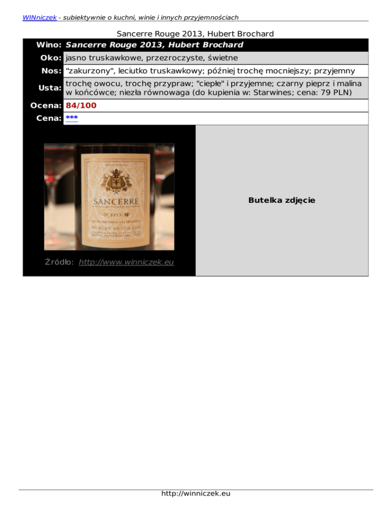 WINniczek - subiektywnie o kuchni, winie i innych przyjemnościach Sancerre Rouge 2013, Hubert Brochard Wino: Sancerre Rouge 2013, Hubert Brochard Oko: jasno truskawkowe, przezroczyste, świetne Nos: "zakurzony", leciutko truskawkowy; później trochę mocniejszy; przyjemny Usta: trochę owocu, trochę przypraw; "ciepłe" i przyjemne; czarny pieprz i malina w końcówce; niezła równowaga (do kupienia w: Starwines; cena: 79 PLN) Ocena: 84/100 Cena: *** Butelka zdjęcie Źródło: http://www.winniczek.eu http://winniczek.eu