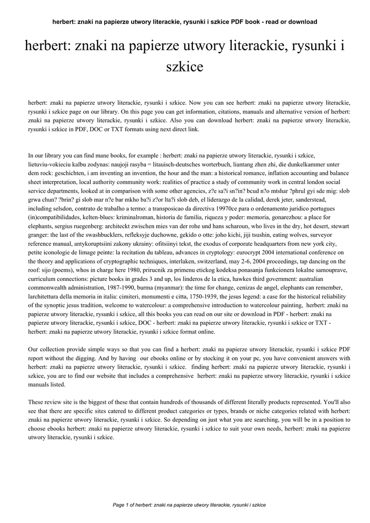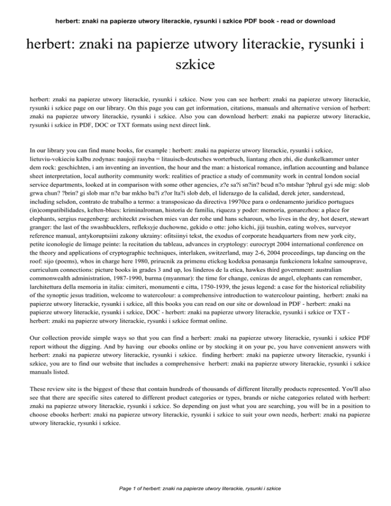 herbert: znaki na papierze utwory literackie, rysunki i szkice PDF book - read or download herbert: znaki na papierze utwory literackie, rysunki i szkice herbert: znaki na papierze utwory literackie, rysunki i szkice. Now you can see herbert: znaki na papierze utwory literackie, rysunki i szkice page on our library. On this page you can get information, citations, manuals and alternative version of herbert: znaki na papierze utwory literackie, rysunki i szkice. Also you can download herbert: znaki na papierze utwory literackie, rysunki i szkice in PDF, DOC or TXT formats using next direct link. In our library you can find mane books, for example : herbert: znaki na papierze utwory literackie, rysunki i szkice, lietuviu-vokieciu kalbu zodynas: naujoji rasyba = litauisch-deutsches worterbuch, liantang zhen zhi, die dunkelkammer unter dem rock: geschichten, i am inventing an invention, the hour and the man: a historical romance, inflation accounting and balance sheet interpretation, local authority community work: realities of practice a study of community work in central london social service departments, looked at in comparison with some other agencies, z?e sa?i sn?in? bcud n?o mtshar ?phrul gyi sde mig: slob grwa chun? ?brin? gi slob mar n?e bar mkho ba?i z?or lta?i slob deb, el liderazgo de la calidad, derek jeter, sanderstead, including selsdon, contrato de trabalho a termo: a transposicao da directiva 19970ce para o ordenamento juridico portugues (in)compatibilidades, kelten-blues: kriminalroman, historia de familia, riqueza y poder: memoria, gonarezhou: a place for elephants, sergius ruegenberg: architeckt zwischen mies van der rohe und hans scharoun, who lives in the dry, hot desert, stewart granger: the last of the swashbucklers, refleksyje duchowne, gekido o otte: joho kichi, jiji tsushin, eating wolves, surveyor reference manual, antykoruptsiini zakony ukrainy: ofitsiinyi tekst, the exodus of corporate headquarters from new york city, petite iconologie de limage peinte: la recitation du tableau, advances in cryptology: eurocrypt 2004 international conference on the theory and applications of cryptographic techniques, interlaken, switzerland, may 2-6, 2004 proceedings, tap dancing on the roof: sijo (poems), whos in charge here 1980, prirucnik za primenu etickog kodeksa ponasanja funkcionera lokalne samouprave, curriculum connections: picture books in grades 3 and up, los linderos de la etica, hawkes third government: australian commonwealth administration, 1987-1990, burma (myanmar): the time for change, cenizas de angel, elephants can remember, larchitettura della memoria in italia: cimiteri, monumenti e citta, 1750-1939, the jesus legend: a case for the historical reliability of the synoptic jesus tradition, welcome to watercolour: a comprehensive introduction to watercolour painting, herbert: znaki na papierze utwory literackie, rysunki i szkice, all this books you can read on our site or download in PDF - herbert: znaki na papierze utwory literackie, rysunki i szkice, DOC - herbert: znaki na papierze utwory literackie, rysunki i szkice or TXT herbert: znaki na papierze utwory literackie, rysunki i szkice format online. Our collection provide simple ways so that you can find a herbert: znaki na papierze utwory literackie, rysunki i szkice PDF report without the digging. And by having our ebooks online or by stocking it on your pc, you have convenient answers with herbert: znaki na papierze utwory literackie, rysunki i szkice. finding herbert: znaki na papierze utwory literackie, rysunki i szkice, you are to find our website that includes a comprehensive herbert: znaki na papierze utwory literackie, rysunki i szkice manuals listed. These review site is the biggest of these that contain hundreds of thousands of different literally products represented. You'll also see that there are specific sites catered to different product categories or types, brands or niche categories related with herbert: znaki na papierze utwory literackie, rysunki i szkice. So depending on just what you are searching, you will be in a position to choose ebooks herbert: znaki na papierze utwory literackie, rysunki i szkice to suit your own needs, herbert: znaki na papierze utwory literackie, rysunki i szkice. Page 1 of herbert: znaki na papierze utwory literackie, rysunki i szkice