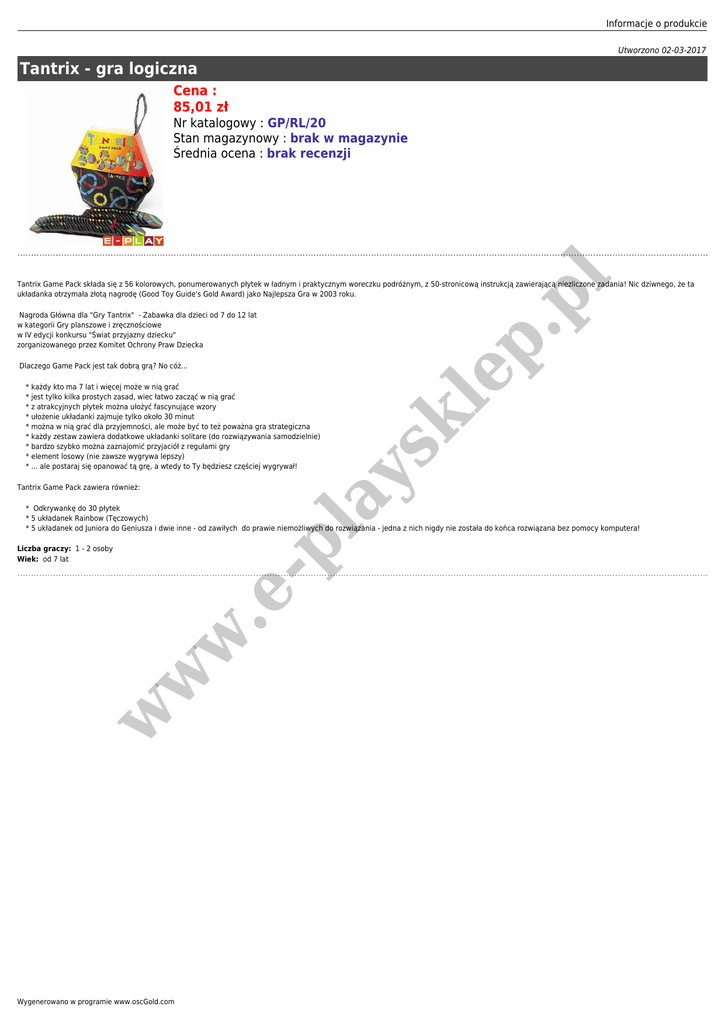 Informacje o produkcie Utworzono 02-03-2017 Tantrix - gra logiczna Cena : 85,01 zł p. pl Nr katalogowy : GP/RL/20 Stan magazynowy : brak w magazynie Średnia ocena : brak recenzji Tantrix Game Pack składa się z 56 kolorowych, ponumerowanych płytek w ładnym i praktycznym woreczku podróżnym, z 50-stronicową instrukcją zawierającą niezliczone zadania! Nic dziwnego, że ta układanka otrzymała złotą nagrodę (Good Toy Guide's Gold Award) jako Najlepsza Gra w 2003 roku. Nagroda Główna dla "Gry Tantrix" - Zabawka dla dzieci od 7 do 12 lat w kategorii Gry planszowe i zręcznościowe w IV edycji konkursu "Świat przyjazny dziecku" zorganizowanego przez Komitet Ochrony Praw Dziecka ay sk le Dlaczego Game Pack jest tak dobrą grą? No cóż... * każdy kto ma 7 lat i więcej może w nią grać * jest tylko kilka prostych zasad, wiec łatwo zacząć w nią grać * z atrakcyjnych płytek można ułożyć fascynujące wzory * ułożenie układanki zajmuje tylko około 30 minut * można w nią grać dla przyjemności, ale może być to też poważna gra strategiczna * każdy zestaw zawiera dodatkowe układanki solitare (do rozwiązywania samodzielnie) * bardzo szybko można zaznajomić przyjaciół z regułami gry * element losowy (nie zawsze wygrywa lepszy) * ... ale postaraj się opanować tą grę, a wtedy to Ty będziesz częściej wygrywał! Tantrix Game Pack zawiera również: pl * Odkrywankę do 30 płytek * 5 układanek Rainbow (Tęczowych) * 5 układanek od Juniora do Geniusza i dwie inne - od zawiłych do prawie niemożliwych do rozwiązania - jedna z nich nigdy nie została do końca rozwiązana bez pomocy komputera! w w w .e - Liczba graczy: 1 - 2 osoby Wiek: od 7 lat Wygenerowano w programie www.oscGold.com