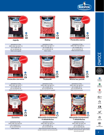 OŚĆ! OŚĆ! NOW NOW Jagody Maliny Porzeczka czarna gramatura 2,5 kg EAN 5 902 162 334 113 szt. w opak. zb. 4 szt. na warstwie 36 gramatura 2,5 kg EAN 5 902 162 365 117 szt. w opak. zb. 4 szt. na warstwie 36 gramatura 2,5 kg EAN 5 902 162 334 212 szt. w opak. zb. 4 szt. na warstwie 36 Skład: czarne jagody Skład: maliny OWOCE Skład: porzeczki czarne OŚĆ! NOW Porzeczka czerwona Truskawki Wiśnie bez pestek gramatura 2,5 kg EAN 5 902 162 334 311 szt. w opak. zb. 4 szt. na warstwie 36 gramatura 2,5 kg EAN 5 902 162 365 513 szt. w opak. zb. 4 szt. na warstwie 36 gramatura 2,5 kg EAN 5 902 162 365 612 szt. w opak. zb. 4 szt. na warstwie 36 Skład: porzeczki czerwone Skład: truskawki bez szypułek Skład: wiśnie bez pestek produkty mrożone produkty chłodzone produkty suche OŚĆ! NOW patelnia garnek mikrofala frytownica Żurawina Mieszanka kompotowa 4-składnikowa Mieszanka kompotowa 7-składnikowa gramatura 2,5 kg EAN 5 902 162 334 410 szt. w opak. zb. 4 szt. na warstwie 36 gramatura 2,5 kg EAN 5 902 162 393 219 szt. w opak. zb. 4 szt. na warstwie 36 gramatura 2,5 kg EAN 5 902 162 393 318 szt. w opak. zb. 4 szt. na warstwie 36 Skład: żurawina Skład: śliwki bez pestek, wiśnie bez pestek, truskawki, czerwone porzeczki Skład: śliwki bez pestek, wiśnie bez pestek, truskawki, czarne porzeczki, agrest, aronia, czerwone porzeczki piekarnik piec konwekcyjny 7