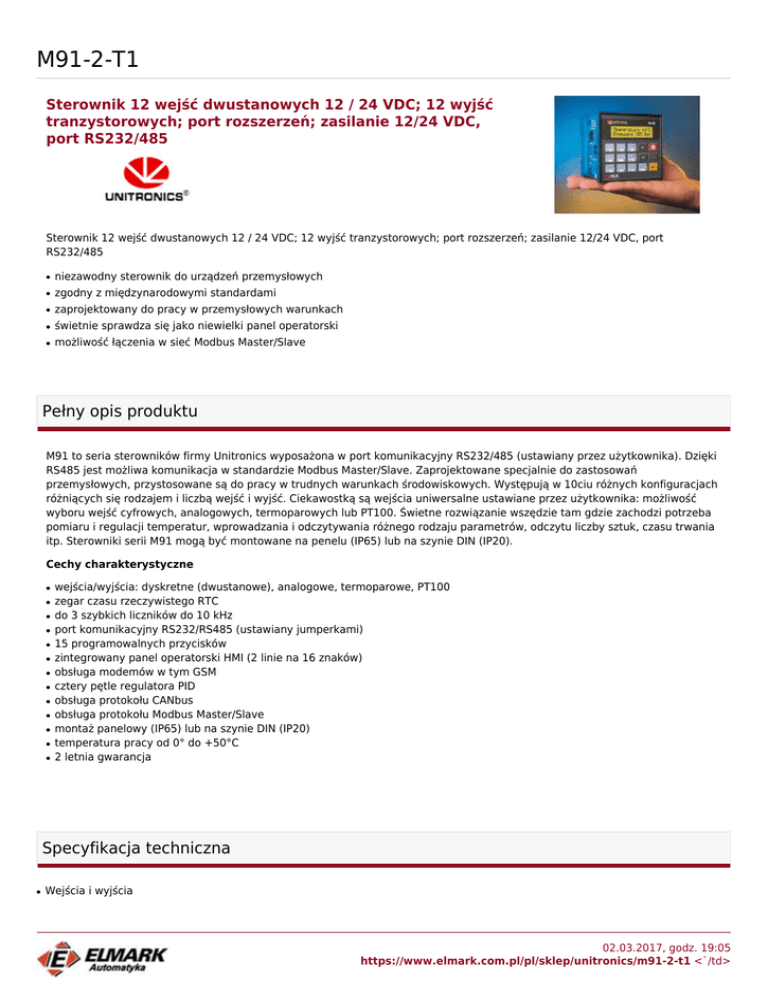 M91-2-T1 Sterownik 12 wejść dwustanowych 12 / 24 VDC; 12 wyjść tranzystorowych; port rozszerzeń; zasilanie 12/24 VDC, port RS232/485 Sterownik 12 wejść dwustanowych 12 / 24 VDC; 12 wyjść tranzystorowych; port rozszerzeń; zasilanie 12/24 VDC, port RS232/485 ● niezawodny sterownik do urządzeń przemysłowych ● zgodny z międzynarodowymi standardami ● zaprojektowany do pracy w przemysłowych warunkach ● świetnie sprawdza się jako niewielki panel operatorski ● możliwość łączenia w sieć Modbus Master/Slave Pełny opis produktu M91 to seria sterowników firmy Unitronics wyposażona w port komunikacyjny RS232/485 (ustawiany przez użytkownika). Dzięki RS485 jest możliwa komunikacja w standardzie Modbus Master/Slave. Zaprojektowane specjalnie do zastosowań przemysłowych, przystosowane są do pracy w trudnych warunkach środowiskowych. Występują w 10ciu różnych konfiguracjach różniących się rodzajem i liczbą wejść i wyjść. Ciekawostką są wejścia uniwersalne ustawiane przez użytkownika: możliwość wyboru wejść cyfrowych, analogowych, termoparowych lub PT100. Świetne rozwiązanie wszędzie tam gdzie zachodzi potrzeba pomiaru i regulacji temperatur, wprowadzania i odczytywania różnego rodzaju parametrów, odczytu liczby sztuk, czasu trwania itp. Sterowniki serii M91 mogą być montowane na penelu (IP65) lub na szynie DIN (IP20). Cechy charakterystyczne ● ● ● ● ● ● ● ● ● ● ● ● ● wejścia/wyjścia: dyskretne (dwustanowe), analogowe, termoparowe, PT100 zegar czasu rzeczywistego RTC do 3 szybkich liczników do 10 kHz port komunikacyjny RS232/RS485 (ustawiany jumperkami) 15 programowalnych przycisków zintegrowany panel operatorski HMI (2 linie na 16 znaków) obsługa modemów w tym GSM cztery pętle regulatora PID obsługa protokołu CANbus obsługa protokołu Modbus Master/Slave montaż panelowy (IP65) lub na szynie DIN (IP20) temperatura pracy od 0° do +50°C 2 letnia gwarancja Specyfikacja techniczna ● Wejścia i wyjścia 02.03.2017, godz. 19:05 https://www.elmark.com.pl/pl/sklep/unitronics/m91-2-t1 <`/td> Wejścia cyfrowe 12 w tym 2 szybkie 5kHz Wyjścia tranzystorowe 12 w tym 2 szybkie ● Ogólne Zasilanie 12/24VDC Bateria Żywotność: 7 lat przy temperaturze 25 stopni celcjusza Pamięć na drabinkę 36K Ilość elementów drabinki 256 cewek, 256 rejestrów, 64 timery Baza danych 1024 wartości typu integer Stopień ochrony IP65/NEM4X (od frontu) ● Klawiatura 15 Liczba przycisków ● Panel operatorski Typ STN LCD Wielkość 2 linie po 16 znaków Modele Symbol Opis M91-2-T1 Sterownik 12 wejść dwustanowych 12 / 24 VDC; 12 wyjść tranzystorowych; port rozszerzeń; zasilanie 12/24 VDC, port RS232/485 Produkty podobne Symbol Opis M91-2-R1 Sterownik 10 wejść dwustanowych 12/24 VDC; 6 wyjść przekaźnikowych; 1 wejście analogowe; port rozszerzeń; zasilanie 12/24 VDC, port RS232/485 02.03.2017, godz. 19:05 https://www.elmark.com.pl/pl/sklep/unitronics/m91-2-t1 <`/td> Symbol Opis M91-2-R2C Sterownik 10 wejść dwustanowych 12/ 24 VDC; 6 wyjść przekaźnikowych; 2 wejścia analogowe; port rozszerzeń; port CAN; zasilanie 12/24 VDC, port RS232/485 M91-2-R34 Sterownik 20 wejścia 24VDC, 2 wejścia uniwersalne analogowo/cyfrowe, 12 wyjść przekaźnikowych + możliwość rozbudowy - zasilanie 24 VDC; port RS232/485 M91-2-R6C Sterownik 6 wejść 24VDC, 6 wyjść przekaźnikowych, 6 wejść analogowych (2wejścia: 0-10V, 0/4-20mA; i 4 wejścia: 0/4-20mA) + możliwość rozbudowy + CANbus - zasilanie 24 VDC; port RS232/485 M91-2-RA22 Sterownik 12 wejść 24VDC w tym 2 uniwersalne wejścia (cyfrowo/analogowe) oraz 2 uniwersalne wejścia (PT100 / termoparowe / analogowe 14bit (14 bitowe: oprócz 4-20mA) / lub 24 VDC); 8 wyjść przekaźnikowych; 2 wyjścia analogowe (0-10V, 4-20mA)+rozszerzeni M91-2-T2C Sterownik 10 wejść 24VDC, 12 wyjść tranzystorowych, 2 wejścia analogowo/cyfrowe + możliwość rozbudowy - zasilanie 12/24 VDC; port RS232/485 M91-2-T38 Sterownik 22 wejścia dwustanowe 24 VDC; 16 wyjść tranzystorowych; port rozszerzeń; zasilanie 12/24VDC, port RS232/485 M91-2-UA2 Sterownik 12 wejść 12/24VDC w tym 2 uniwersalne wejścia (termoparowe / analogowe 14bit (oprócz 4-20mA) / lub 12/24 VDC); 10 wyjść tranzystorowych; 2 wyjścia analogowe+ możliwość rozbudowy - zasilanie 12/24 VDC; port RS232/485 M91-2-UN2 Sterownik 12 wejść 12/24VDC w tym 2 uniwersalne wejścia (PT100 / termoparowe / analogowe 14bit (oprócz 4-20mA) / lub 12/24 VDC), 12 wyjść tranzystorowych+ możliwość rozbudowy zasilanie 12/24 VDC; port RS232/485 Zawartość zestawu Sterownik serii M91 dostarczany jest w pakietach zawierających właściwy model sterownika, kabel do programowania, uszczelkę do montażu panelowego, zaciski wejść/wyjść oraz elementy (złączki) umożliwiające montaż panelowy. 02.03.2017, godz. 19:05 https://www.elmark.com.pl/pl/sklep/unitronics/m91-2-t1 <`/td>