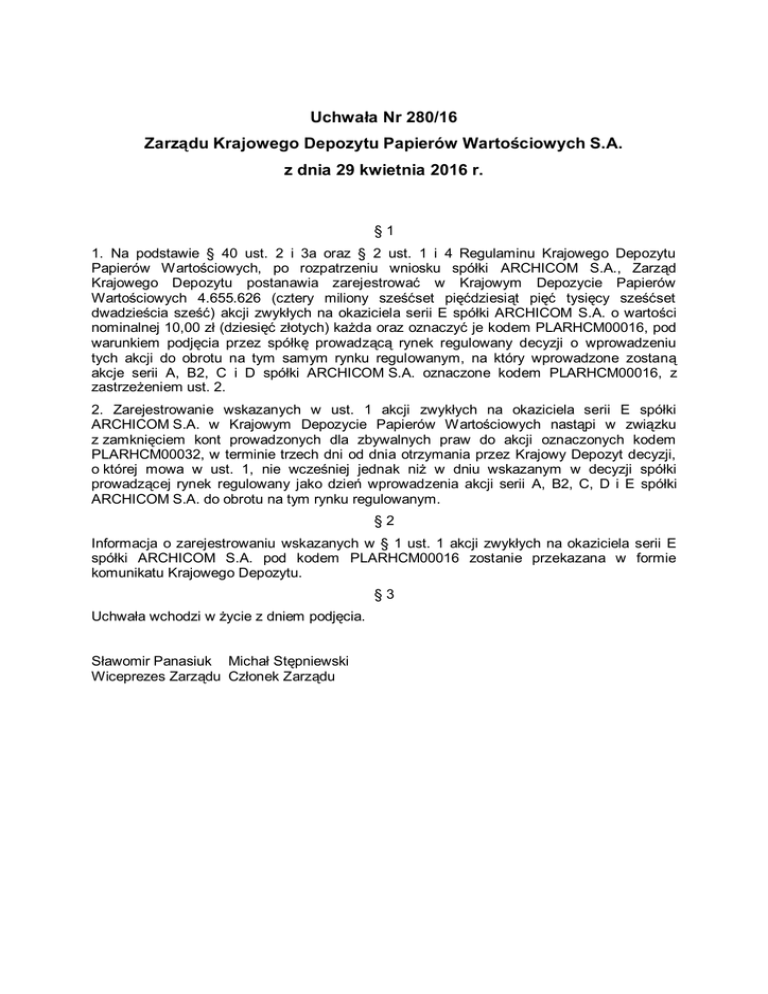 Uchwała Nr 280/16 Zarządu Krajowego Depozytu Papierów Wartościowych S.A. z dnia 29 kwietnia 2016 r. §1 1. Na podstawie § 40 ust. 2 i 3a oraz § 2 ust. 1 i 4 Regulaminu Krajowego Depozytu Papierów Wartościowych, po rozpatrzeniu wniosku spółki ARCHICOM S.A., Zarząd Krajowego Depozytu postanawia zarejestrować w Krajowym Depozycie Papierów Wartościowych 4.655.626 (cztery miliony sześćset pięćdziesiąt pięć tysięcy sześćset dwadzieścia sześć) akcji zwykłych na okaziciela serii E spółki ARCHICOM S.A. o wartości nominalnej 10,00 zł (dziesięć złotych) każda oraz oznaczyć je kodem PLARHCM00016, pod warunkiem podjęcia przez spółkę prowadzącą rynek regulowany decyzji o wprowadzeniu tych akcji do obrotu na tym samym rynku regulowanym, na który wprowadzone zostaną akcje serii A, B2, C i D spółki ARCHICOM S.A. oznaczone kodem PLARHCM00016, z zastrzeżeniem ust. 2. 2. Zarejestrowanie wskazanych w ust. 1 akcji zwykłych na okaziciela serii E spółki ARCHICOM S.A. w Krajowym Depozycie Papierów Wartościowych nastąpi w związku z zamknięciem kont prowadzonych dla zbywalnych praw do akcji oznaczonych kodem PLARHCM00032, w terminie trzech dni od dnia otrzymania przez Krajowy Depozyt decyzji, o której mowa w ust. 1, nie wcześniej jednak niż w dniu wskazanym w decyzji spółki prowadzącej rynek regulowany jako dzień wprowadzenia akcji serii A, B2, C, D i E spółki ARCHICOM S.A. do obrotu na tym rynku regulowanym. §2 Informacja o zarejestrowaniu wskazanych w § 1 ust. 1 akcji zwykłych na okaziciela serii E spółki ARCHICOM S.A. pod kodem PLARHCM00016 zostanie przekazana w formie komunikatu Krajowego Depozytu. §3 Uchwała wchodzi w życie z dniem podjęcia. Sławomir Panasiuk Michał Stępniewski Wiceprezes Zarządu Członek Zarządu