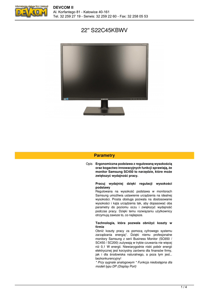 DEVCOM II Al. Korfantego 81 - Katowice 40-161 Tel. 32 259 27 19 - Serwis: 32 259 22 60 - Fax: 32 258 05 53 22'' S22C45KBWV Parametry Opis Ergonomiczna podstawa z regulowaną wysokością oraz bogactwo innowacyjnych funkcji sprawiają, że monitor Samsung SC450 to narzędzie, które może zwiększyć wydajność pracy. Pracuj wydajniej dzięki regulacji wysokości podstawy Regulowana na wysokość podstawa w monitorach Samsung umożliwia ustawienie urządzenia na idealnej wysokości. Prosta obsługa pozwala na dostosowanie wysokości i kąta urządzenia tak, aby dopasować oba parametry do poziomu oczu i zwiększyć wydajność podczas pracy. Dzięki temu rozwiązaniu użytkownicy otrzymują zawsze to, co najlepsze. Technologia, która pozwala obniżyć koszty w firmie Obniż koszty pracy za pomocą cyfrowego systemu zarządzania energią*. Dzięki niemu profesjonalne monitory Samsung z serii Business Monitor (SC650 / SC450 / SC200) zużywają w trybie czuwania nie więcej niż 0,1 W energii. Niewiarygodnie niski pobór energii elektrycznej jest korzystny zarówno dla finansów firmy, jak i dla środowiska naturalnego, a poza tym jest... bezkonkurencyjny! * Przy sygnale analogowym * Funkcja niedostępna dla modeli typu DP (Display Port) 1/4 DEVCOM II Al. Korfantego 81 - Katowice 40-161 Tel. 32 259 27 19 - Serwis: 32 259 22 60 - Fax: 32 258 05 53 Wydajny monitor – wydajne wykorzystanie przestrzeni Jeśli szukasz monitora, który zajmuje mało miejsca, model Samsung LED Business Monitor SC650 / SC450 jest doskonałym rozwiązaniem. Od możliwości przenoszenia przy użyciu uchwytu po szybkość montażu, SC650 / SC450 zapewnia wydajność i umożliwia uporządkowanie miejsca pracy. Dzięki profesjonalnemu monitorowi Samsung LED Business Monitor SC650 / SC450 optymalizacja stanowiska pracy stała się znacznie łatwiejsza. Maksymalne wykorzystanie przestrzeni dzięki łatwemu montażowi na ścianie Uchwyt ścienny VESA umożliwia perfekcyjne ustawienie monitora. Łatwość montażu i instalacji zapewnia wygodę, bezpieczeństwo i kompatybilność oraz czyni ten uchwyt doskonałym partnerem dla twojego monitora. Zawsze uzyskasz idealny kąt widzenia, a dzięki wąskiej obudowie maksymalnie wykorzystasz dostępną przestrzeń. Minimalistyczny design – maksymalny efekt Zmaksymalizuj swoje doznania za pomocą eleganckiej, wąskiej obudowy. Wąska obudowa oznacza mniej rozproszeń przy patrzeniu na ekran monitora, co ułatwia koncentrację. Dodatkowo dzięki niej zwiększa się powierzchnia ekranu, umożliwiając łatwe dostawienie drugiego monitora, który z pewnością podniesie wydajność pracy. W przypadku osób poszukujących po prostu monitora w eleganckiej obudowie, to urządzenie będzie wyglądać stylowo na każdym biurku. Przejdź do kolejnego wymiaru z funkcją Mega Dynamic Contrast Współczynnik Mega Dynamic Contrast Ratio zapewnia nową jakość, wyświetlając obrazy i kolory, które wyglądają tak, jak w rzeczywistości. Zapierający dech w piersiach współczynnik kontrastu wyświetla absolutnie najciemniejszą czerń i nieskazitelną biel, nie zapominając o innych niuansach. Z pewnością zauważysz krystaliczną czystość obrazu. To jak eksplozja kolorów, która sprawia, że inne monitory po prostu bledną. Oglądaj swoje multimedialne treści z profesjonalizmem, na który zasługują. Obracanie Zmień perspektywę monitora, korzystając z innowacyjnej funkcji regulacji obracania w monitorze Samsung. Funkcja ta umożliwia obrót ekranu nawet o 90 stopni, dzięki czemu z pewnością znajdziesz kąt odpowiadający twoim potrzebom. Funkcja przekręcania Monitory Samsung wyposażone są w możliwość przekręcania, dzięki czemu można szybko i łatwo zmieniać ich położenie, co jest szczególnie przydatne podczas pracy w grupie. Pochylanie Funkcja pochylania umożliwia perfekcyjne ustawienie 2/4 DEVCOM II Al. Korfantego 81 - Katowice 40-161 Tel. 32 259 27 19 - Serwis: 32 259 22 60 - Fax: 32 258 05 53 monitora, zapewniając wysoki komfort użytkowania. Certyfikat EPEAT Bądź bardziej proekologiczny – zacznij korzystać z monitora Samsung LED Business Monitor, który otrzymał certyfikat wydany przez EPEAT. Dzięki obniżeniu zużycia energii ten przyjazny dla środowiska monitor idealnie nadaje się do zastosowań biznesowych. Tworzywo sztuczne z recyklingu Profesjonalne monitory Samsung z serii Business Monitor (SC650 / SC450) podążają z duchem trendów proekologicznych dzięki zastosowaniu w procesie produkcji tworzyw sztucznych pochodzących z recyklingu. Certyfikat Energy Star Profesjonalne monitory z serii Samsung LED Business Monitor otrzymały certyfikat Energy Star, co oznacza, że dzięki nim możesz obniżyć koszty swojej działalności. Niższe zużycie energii zwiększa zyski, jednocześnie chroniąc środowisko naturalne. Certyfikat zgodności z normą TCO Display Spełnienie bardzo restrykcyjnej normy środowiskowej TCO Display oznacza, że monitory Samsung łączą w sobie nie tylko bardzo zaawansowane technologie projektowania i produkcji, ale również proekologiczne nastawienie do środowiska, chroniąc zarówno użytkownika, jak i zasoby naturalne. Model S22C45KBWV Proporcje obrazu Przekątna ekranu Typ matrycy Powierzchnia matrycy Ekran dotykowy Technologia podświetlania Obszar widzialny w pionie 16:10 22" TFT-TN Brak danych Nie Diody LED 296.1 Obszar widzialny w poziomie 473.76 Plamka matrycy 0.282 Rozdzielczość 1680 x 1050 (WSXGA+) Czas reakcji 5 Jasność 250 Kontrast statyczny 1 000:1 Kontrast dynamiczny Brak danych Kąt widzenia poziomy 170 Kąt widzenia pionowy 160 Ilość kolorów 16,7 mln Gniazda we/wy 1 x DVI Gniazda we/wy 1 x 15-pin D-Sub 3/4 DEVCOM II Al. Korfantego 81 - Katowice 40-161 Tel. 32 259 27 19 - Serwis: 32 259 22 60 - Fax: 32 258 05 53 Wbudowane głośniki Wbudowany tuner TV Pivot Certyfikaty Standard VESA Pobór mocy Nie Nie Tak Energy Star 100 x 100 21 Kolor Czarny Wysokość 329.8 Wysokość z podstawą 453.5 Szero