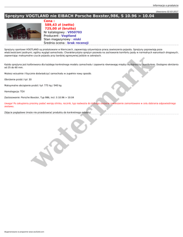 Informacje o produkcie Utworzono 02-03-2017 Sprężyny VOGTLAND nie EIBACH Porsche Boxster,986, S 10.96 > 10.04 Cena : 589,43 zł (netto) 725,00 zł (brutto) Nr katalogowy : V950703 Producent : Vogtland Stan magazynowy : niski Średnia ocena : brak recenzji Sprężyny sportowe VOGTLAND są produkowane w Niemczech, zapewniają sztywniejsza pracę zawieszenia pojazdu. Sprężyny poprawiają poza właściwościami jezdnymi, ogólny wygląd samochodu. Charakterystyka sprężyn pozwala na zachowanie komfortu jazdy w normalnych warunkach drogowych, zapewniając maksymalne czucie pojazdu przy bardziej agresywnej jeździe w zakrętach. er m ar k Każda sprężyna jest kalibrowana dla każdego konkretnego modelu samochodu i zapewnia równowagę między wydajnością i komfortem. Dostępne obniżenia od 25 do 60 mm. Możesz wizualnie i fizycznie doświadczyć samochodu w zupełnie nowy sposób. Obniżenie przód / tył: 30 Maksymalne obciążenie przód / tył: 775 kg / 940 kg Homologacja: TÜV Zastosowanie: Porsche Boxster, Typ 986, incl. S 10.96 > 10.04 Uwaga! Po zakupieniu prosimy podać wersję silnika, rocznik, typ nadwozia do którego zostanie zawieszenie zamontowane w celu dobrania odpowiedniego zestawu. w at Zdjęcie poglądowe (może nie przedstawiać produktu do konkretnego modelu) Wygenerowano w programie www.oscGold.com