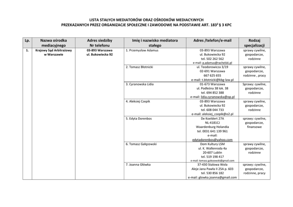 LISTA STAŁYCH MEDIATORÓW ORAZ OŚRODKÓW MEDIACYJNYCH PRZEKAZANYCH PRZEZ ORGANIZACJE SPOŁECZNE I ZAWODOWE NA PODSTAWIE ART. 1832 § 3 KPC Lp. 1. Nazwa ośrodka mediacyjnego Krajowy Sąd Arbitrażowy w Warszawie Adres siedziby Nr telefonu 03-893 Warszawa ul. Bukowiecka 92 Imię i nazwisko mediatora stałego 1. Przemysław Adamus 2. Tomasz Błotnicki 3. Cyranowska Lidia 4. Aleksiej Czepik 5. Edyta Dorenbos 6. Tomasz Gałęzowski 7. Joanna Główka Adres /telefon/e-mail Rodzaj specjalizacji 03-893 Warszawa ul. Bukowiecka 92 tel. 502 262 562 sprawy cywilne, gospodarcze, rodzinne ul. Teodorowicza 3/19 02-691 Warszawa 667 625 655 e-mail: t.bł[email protected] 01-673 Warszawa ul. Podleśna 38 lok. 38 tel. 694 852 388 e-mail: [email protected] 03-893 Warszawa ul. Bukowiecka 92 tel. 608 044 733 e-mail: [email protected] De Koeldert 27A NL-4181CJ Waardenburg Holandia tel. 0031 641 139 961 e-mail: [email protected] Dom Kultury LSM ul. K. Wallenroda 4a 20-607 Lublin tel. 519 198 417 sprawy cywilne, gospodarcze, rodzinne , pracy e-mail: [email protected] e-mail: [email protected] 37-430 Stalowa Wola Aleje Jana Pawła II 25A p. 603 tel. 530 856 182 e-mail: [email protected] Sprawy: cywilne, gospodarcze, rodzinne sprawy cywilne, gospodarcze, rodzinne sprawy: cywilne, gospodarcze, finansowe sprawy cywilne, gospodarcze, rodzinne sprawy: cywilne, gospodarcze, rodzinne, pracy 8. Szymon Hatłas 9. Paweł Jagodziński 10. Piotr Janicki 11. Marta Jastrzębska 12. Aleksandra Stępień-Kaliszczak 13. Joanna Kamieńska 14. Jarosław Kamiński 15. Wioletta Kaźmierczak 16. Michał Kluska 03-893 Warszawa ul. Bukowiecka 92 tel. 608 159 867 e-mail: [email protected] Suisse Legiste Sp. z o.o. Ul. Lucjana Rydla 52 A 01-850 Warszawa tel. (22) 628 78 95 e-mail:[email protected] sprawy cywilne, gospodarcze sprawy: cywilne, gospodarcze, rodzinne 659 Navaho Trail Drive Franklin Lakes NJ 07417, USA tel. 001 646 286 4948 e-mail: [email protected] ul. Nowolipki 14/105 01 – 019 Warszawa 602 254 882 [email protected] 78-400 Szczecinek ul. Kołobrzeska 24D/7 tel. 517 900 462 sprawy: cywilne, gospodarcze, rodzinne Kancelaria Radców Prawnych 15-084 Białystok ul. Orzeszkowej 32 lok. 502 tel. 606 885 885 sprawy cywilne, gospodarcze, rodzinne Kancelaria KB&G s.c uUl. Obrzeżna 5 02-691 Warszawa (budynek Park Projekt Group) Tel. 609 652 649 e-mail: [email protected] 03-893 Warszawa ul. Bukowiecka 92 tel. 601 699 317 sprawy: cywilne, gospodarcze, rodzinne, pracy e-mail: [email protected] e-mail: [email protected] e-mail: [email protected] Kancelaria Olesiński i Wspólnicy Prosta Tower XVI Piętro sprawy cywilne, gospodarcze, sprawy: cywilne, rodzinne sprawy: cywilne, gospodarcze, rodzinne Sprawy cywilne, 17. Anna Kowalska 18. Kucharska-Szydelska Małgorzata 19. Michał Lenarczyk 20. Lenart Tomasz 21. Małgorzata Magdziarczyk 22. Walentyna Nowak 23. Wojciech Ostrowski Ul. Prosta 32 00-838 Warszawa, 662 190 844, [email protected] 03-893 Warszawa ul. Bukowiecka 92 tel. 607 224 937 e-mail: [email protected] gospodarcze, rodzinne, pracy sprawy: cywilne, gospodarcze, pracy 03-893 Warszawa ul. Bukowiecka 92 tel. 603 794 218 sprawy cywilne, gospodarcze, rodzinne Kancelaria Prawnicza Lenar&Lawyers 00-539 Warszawa ul. Mokotowska 14 p. 707 tel. 508 164 678 sprawy cywilne, gospodarcze, rodzinne Kancelaria Radcy Prawnego 30-304 Kraków ul. Zduńska 18 / 1 tel. 604 062 174 sprawy cywilne, gospodarcze, pracy Kancelaria Radcy Prawnego 45-032 Opole ul. Kard. B. Kominka 2A/1 ul. 605 730 408 sprawy cywilne, gospodarcze, rodzinne 00-377 Warszawa ul. Czerwonego Krzyża 6/30 tel. 601 302 222 sprawy cywilne, gospodarcze, rodzinne Rachelski i Wspólnicy, Kancelaria Prawnicza, Spółka Komandytowa 00-515 Warszawa ul. Żurawia 22 tel. (22) 438 94 03 e-mail: [email protected] sprawy cywilne, gospodarcze, rodzinne e-mail: [email protected] e-mail: [email protected] e-mail: [email protected] e-mail: [email protected] e-mail: [email protected] 24. Mariusz Paradowski 25. Natalia Petryszyn 26. Roman Pietrowski 27. Franciszka Pniewska 28. Stanisław Rachelski 29. Magdalena Radzik 30. Piotr Rola 31. Dobrosława Rozpędowska 42-200 Częstochowa ul. Sieroszewskiego 10 m 14 Tel. 530 850 118 e-mail:[email protected] Kancelaria Adwokacka ul. Grottgera 17 / 4 65-415 Zielona Góra tel. 503 167 459 e-mail: [email protected] 85-110 Bydgoszcz ul. Dworcowa 110 tel. 606 320 500 sprawy: cywilne, gospodarcze, rodzinne, pracy Kancelaria Radcy Prawnego 75-509 Koszalin ul. Piłsudskiego 2/6 tel. 502 340 344 (94) 346 24 99 e-mail: [email protected] Rachelski i Wspólnicy Kancelaria Prawnicza 00-515 Warszawa ul. Żurawia 22 tel. (22) 438 94 03 e-mail: [email protected] 03-893 Warszawa ul. Bukowiecka 92 tel. 505 455 802 sprawy cywilne, gospodarcze, rodzinne 03-893 Warszawa ul. Bukowiecka 92 tel. 515 797 259 sprawy cywilne, gospodarcze, rodzinne Kancelaria Radcy Prawnego ul. Polna 48 lok.19, 00-644 Warszawa tel. 603 379 694 sprawy cywilne, gospodarcze, rodzinne e-mail: [email protected] e-mail: [email protected] e-mail: [email protected] e-mail: [email protected] sprawy: cywilne, gospodarcze, rodzinne sprawy cywilne, gospodarcze, sprawy cywilne, gospodarcze, rodzinne sprawy cywilne, gospodarcze, rodzinne 32. Maja Sujkowska 33. Jan Szczepański 34. Tomasz Urbański 35. Maciej Wojcieski 36. Bożena Wojtukiewicz 37. Agnieszka Zasikowska 38. Krystian Ziemski 39. Katarzyna Zych 03-893 Warszawa ul. Bukowiecka 92 tel. 601 262 527 e-mail: [email protected] 03-893 Warszawa ul. Bukowiecka 92 tel. 500 231 503 sprawy cywilne, gospodarcze, rodzinne 81-572 Gdynia ul. Damroki 15D/8 tel.691 369 143 e-mail: [email protected] Kancelaria Doradztwa Podatkowego 62-800 Kalisz ul. Fabryczna 1 tel. (62) 503 10 70 e-mail: [email protected] 03-893 Warszawa ul. Bukowiecka 92 tel. 506 984 234 sprawy cywilne, gospodarcze, rodzinne 03-893 Warszawa ul. Bukowiecka 92 tel. 605 674 987 sprawy cywilne, gospodarcze, rodzinne Dr Krystian Ziemski&Partners Kancelaria Prawna 60-711 Poznań ul. Strusia 10 tel. (61) 866 2