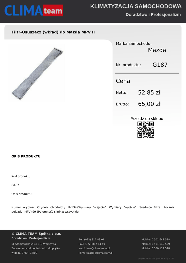 Filtr-Osuszacz (wkład) do Mazda MPV II Marka samochodu: Mazda Nr. produktu: G187 Cena Netto: 52,85 zł Brutto: 65,00 zł Przejdź do sklepu OPIS PRODUKTU Kod produktu: G187 Opis produktu: Numer oryginału:Czynnik chłodniczy: R-134aWymiary "wejscie": Wymiary "wyjście": Średnica filtra: Rocznik pojazdu: MPV (99-)Pojemność silnika: wszystkie © CLIMA TEAM Spółka z o.o. Doradztwo i Profesjonalizm Tel: (022) 817 83 01 Mobile: 0 501 642 528 ul. Staniewicka 2 03-310 Warszawa Fax: (022) 817 84 49 Mobile: 0 501 642 529 Zapraszamy od poniedziałku do piątku [email protected] Mobile: 0 500 119 528 w godz. 9:00 - 17:00 [email protected] projekt GRAFCOM | Netler Shop 1.020