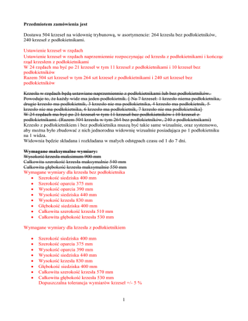 Przedmiotem zamówienia jest Dostawa 504 krzeseł na widownię trybunową, w asortymencie: 264 krzesła bez podłokietników, 240 krzeseł z podłokietnikami. Ustawienie krzeseł w rzędach Ustawienie krzeseł w rzędach naprzemiennie rozpoczynając od krzesła z podłokietnikami i kończąc rząd krzesłem z podłokietnikami W 24 rzędach ma być po 21 krzeseł w tym 11 krzeseł z podłokietnikami i 10 krzeseł bez podłokietników Razem 504 szt krzeseł w tym 264 szt krzeseł z podłokietnikami i 240 szt krzeseł bez podłokietników Krzesła w rzędach będą ustawiane naprzemiennie z podłokietnikami lub bez podłokietników. Powoduje to, że każdy widz ma jeden podłokietnik. [ Na 7 krzeseł: 1 krzesło niema podłokietnika, drugie krzesło ma podłokietnik, 3 krzesło nie ma podłokietnika, 4 krzesło ma podłokietnik, 5 krzesło nie ma podłokietnika, 6 krzesło ma podłokietnik, 7 krzesło nie ma podłokietnika] W 24 rzędach ma być po 21 krzeseł w tym 11 krzeseł bez podłokietników i 10 krzeseł z podłokietnikami. (Razem 504 krzesła w tym 264 bez podłokietników, 240 z podłokietnikami) Krzesło z podłokietnikiem i bez podłokietnika muszą być takie same wizualnie, oraz systemowo, aby można było zbudować z nich jednorodna widownię wizualnie posiadająca po 1 podłokietniku na 1 widza. Widownia będzie składana i rozkładana w małych odstępach czasu od 1 do 7 dni. Wymagane maksymalne wymiary: Wysokość krzesła maksimum 900 mm Całkowita szerokość krzesła maksymalnie 540 mm Całkowita głębokość krzesła maksymalnie 550 mm Wymagane wymiary dla krzesła bez podłokietnika Szerokość siedziska 400 mm Szerokość oparcia 375 mm Wysokość oparcia 390 mm Wysokość siedziska 440 mm Wysokość krzesła 830 mm Głębokość siedziska 400 mm Całkowita szerokość krzesła 510 mm Całkowita głębokość krzesła 530 mm Wymagane wymiary dla krzesła z podłokietnikiem Szerokość siedziska 400 mm Szerokość oparcia 375 mm Wysokość oparcia 390 mm Wysokość siedziska 440 mm Wysokość krzesła 830 mm Głębokość siedziska 400 mm Całkowita szerokość krzesła 570 mm Całkowita głębokość krzesła 530 mm Dopuszczalna tolerancja wymiarów krzeseł +/- 5 % 1 Krzesło klasyfikowane, jako trudno zapalne oraz niewydzielające produktów rozkładu i spalania określonych, jako bardzo toksyczne. Zgodnie z Polską Normą dotyczącą badań wydzielania produktów toksycznych oraz przepisami bhp i ppoż.; (określenie trudno zapalny przypisuje się siedzeniom, które nie ulegają postępującemu tleniu i spalaniu płomieniowemu w warunkach określonych Polską Normą dotyczącą badania zapalności mebli tapicerowanych, przeznaczone do stosowania na trybunach widowniach) Cechy techniczne: Krzesła wygodne i lekkie. Siedzisko i oparcie musi posiadać oddzielne, tapicerowane miękkie nakładki polepszające komfort siedzenia widza. Krzesła tapicerowane materiałem zmywalnym z widoczną wytłoczoną fakturą wyglądająca jak tkanina pleciona z nici Uwaga: ( nie dopuszcza się materiału powlekanego o wyglądzie skóry) Kubełek krzesła sklejkowy obustronnie pokryty laminatem CPL w kolorze antracytowym Krzesło ma mieć 4 nogi. Siedzisko wraz z oparciem wykonane ma być, jako jeden element. Funkcja sztaplowania do 12 sztuk krzeseł. Z sztaplowane krzesła jedne na drugie muszą mieć jakieś zabezpieczenie przed zniszczeniem, uszkodzeniem krzesła chroniące kształt czy tapicerkę. Zabezpieczenie to winno być opisane i wskazane jego cechy techniczne, które taką właściwość sztaplowi krzeseł nadają. Siedzisko i oparcie krzesła mają być ze sklejki o grubości minimum 8 mm pokryte obustronnie warstwą ochronną podwyższającą trwałość krzesła na uszkodzenia mechaniczne i odporność na działanie wody laminowane. Krzesło o konstrukcji nośnej szkieletowej metalowej malowanej proszkowo na kolor Ral 7022 Mat Kubełek na oparcie ma dla wygody siedzącego widza mieć ukształtowanie stanowiące podparcie lędźwiowe lub inne rozwiązanie techniczne, które taką wygodę siedzącego widza zapewnia. Nogi zaślepione stopkami chroniącymi podłoże. Nogi mogą wystawać poza obrys siedziska Uwaga: ze względu na parametry użytkowe krzesła na widowni, nie dopuszcza się sklejki lakierowanej. Uwaga: Nie dopuszcza się plastikowej maskownicy na oparciu i siedzisku. Parametry i właściwości materiałów z jakich zrobione jest krzesło Pianka zastosowana na siedzisku i oparciu o właściwościach trudnopalnych Metalowy stelaż krzesła powinien mieć certyfikat potwierdzający wysoka wytrzymałość, co najmniej zgodną z PN – EN 15373: 2010 poziom 2; Parametry materiału do tapicerowania 1. Odporność na ścieranie Wytrzymałość /na ścieranie/ określana w cyklach w skali Martindala (rozumiane zgodnie z PN-EN ISO 12947-2: 2000/) minimum 300 tyś cykli Martindala wg normy EN 12947: 1999 Part 2 Stopień podatności na pilling co najmniej taki sam jak oceniony na 5 wg normy PN-EN ISO 12945-2 w skali 1-5, (5 oznacza maksymalną odporność.) 2 Trudnopalność (w rozumieniu norm BS EN 1021: 1, BS EN 1021:2), dotyczy sklejki oraz układu tapicerskiego pianka + tkanina i spełnianie normy w zakresie toksycznych produktów spalania sklejki PN-88/B-02855:1988 Właściwości zmywalne w tym łagodnymi środkami chemicznymi Bariera przed drobnoustrojami, przeciwbakteryjna i przeciwgrzybicza Sztywne łączenie rzędów siedzeń Krzesła postawione w rzędzie muszą mieć system łączenia krzeseł listwami na sztywno w rzędy oraz miedzy nimi. Za pomocą systemu właściwego dla danego krzesła jego nogi tylne maja być zespolone w rzędzie. Liczba urządzeń do takiego zespolenia ma być ustalona przez dostawce i zapewniać nadanie sztywności, o której mowa wyżej 504 krzesłom. Ma zapobiegać przesuwaniu krzeseł w rzędzie po podłożu zgodnie z przepisami bhp i ppoż. Sposób łączenia krzeseł w ten system musi być łatwy i szybki. System musi być łatw