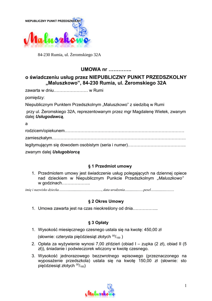 NIEPUBLICZNY PUNKT PRZEDSZKOLNY 84-230 Rumia, ul. Żeromskiego 32A UMOWA nr ………….. o świadczeniu usług przez NIEPUBLICZNY PUNKT PRZEDSZKOLNY „Maluszkowo”, 84-230 Rumia, ul. Żeromskiego 32A zawarta w dniu…………………… w Rumi pomiędzy: Niepublicznym Punktem Przedszkolnym „Maluszkowo” z siedzibą w Rumi przy ul. Żeromskiego 32A, reprezentowanym przez mgr Magdalenę Wietek, zwanym dalej Usługodawcą, a rodzicem/opiekunem………………………………………………………………………… zamieszkałym…………………………………………………………………………………. legitymującym się dowodem osobistym (seria i numer)………………………………….. zwanym dalej Usługobiorcą § 1 Przedmiot umowy 1. Przedmiotem umowy jest świadczenie usług polegających na dziennej opiece nad dzieckiem w Niepublicznym Punkcie Przedszkolnym „Maluszkowo” w godzinach……………….. imię i nazwisko dziecka................................................, data urodzenia.....................pesel.......................... § 2 Okres Umowy 1. Umowa zawarta jest na czas nieokreślony od dnia……………... § 3 Opłaty 1. Wysokość miesięcznego czesnego ustala się na kwotę: 450,00 zł (słownie: czterysta pięćdziesiąt złotych 00/100 ) 2. Opłata za wyżywienie wynosi 7,00 zł/dzień (obiad I – zupka (2 zł), obiad II (5 zł)), śniadanie i podwieczorek wliczony w kwotę czesnego. 3. Wysokość jednorazowego bezzwrotnego wpisowego (przeznaczonego na wyposażenie przedszkola) ustala się na kwotę 150,00 zł (słownie: sto pięćdziesiąt złotych 00/100) 1 4. Roczne ubezpieczenie dla dziecka od następstw nieszczęśliwych wypadków zgodnie z cennikiem na dany rok. Cennik dostępny w placówce. 5. W przypadku zmiany opłat Usługodawca jest zobowiązany powiadomić Usługobiorcę z jedno miesięcznym wyprzedzeniem. 6. W przypadku nieobecności dziecka zwracana jest stawka żywieniowa w całości. 7. Czesne jest płatne przez 12 miesięcy w roku kalendarzowym i nie jest zwracane w przypadku nieobecności dziecka w placówce. § 4 Płatności 1. Czesne wraz z opłatą za wyżywienie jest płatne z góry, do 10 dnia każdego miesiąca: gotówką w siedzibie Usługodawcy, przelewem na konto: NIEPUBLICZNY PUNKT PRZEDSZKOLNY – MALUSZKOWO 84-230 Rumia, ul. Żeromskiego 32A Millennium Bank nr rachunku: 16 1160 2202 0000 0002 3429 3734 Tytułem przelewu: imię i nazwisko dziecka, czesne za m-c: 2. Wpisowe jest płatne w dniu podpisania umowy: a) gotówką w siedzibie Usługodawcy, b) przelewem na konto: NIEPUBLICZNY PUNKT PRZEDSZKOLNY – MALUSZKOWO 84-230 Rumia, ul. Żeromskiego 32A Millennium Bank nr rachunku: 16 1160 2202 0000 0002 3429 3734 Tytułem przelewu: imię i nazwisko dziecka, wpisowe. 3. Ubezpieczenie jest płatne do 7 dni od daty zawarcia umowy: gotówką w siedzibie Usługodawcy, przelewem na wyżej wymienione konto Tytułem przelewu: imię i nazwisko dziecka, ubezpieczenie. 4. Za dzień zapłaty przyjmuje się datę wpływu środków na rachunek bankowy Usługodawcy. 5. Usługodawca zastrzega sobie możliwość rozwiązania umowy w przypadku zalegania z opłatami dłużej niż dwa miesiące. § 5 Obowiązki Usługodawcy 1. Usługodawca zobowiązuje się do zapewnienia fachowej opieki dydaktyczno wychowawczo opiekuńczej podczas pobytu dziecka w placówce. 2. Usługodawca zapewnia realizację podstawy programowej wychowania przedszkolnego zatwierdzonej przez Ministerstwo Edukacji Narodowej. 2 3. Usługodawca zapewnia w ramach czesnego zajęcia z j. angielskiego, spotkania z logopedą, zajęcia z rytmiki, gry i zabawy rozwijające wszystkie typy inteligencji. 4. Usługodawca zapewnia bezpieczeństwo podczas całego pobytu dziecka w placówce. 5. Usługodawca zapewnia wybrane pomoce dydaktyczne m.in. zestawy do zajęć plastycznych, muzycznych i innych. § 6 Obowiązki Usługobiorcy 1. Usługobiorca zobowiązuje się do terminowego uiszczania płatności zgodnie z paragrafem § 3 i § 4 niniejszej umowy. 2. Usługobiorca zobowiązany jest do wypełnienia formularza zgłoszeniowego i podania imiennie osób upoważnionych do odbioru dziecka z placówki. 3. Usługobiorca zobowiązany jest do zapoznania się z Organizacją wychowania przedszkolnego w Niepublicznym Punkcie Przedszkolnym „Maluszkowo” oraz do przestrzegania wszystkich jej punktów. 4. Usługobiorca zobowiązany jest do telefonicznego powiadomienia placówki o nieobecności dziecka (sprawy rodzinne, choroba) nie później niż pierwszego dnia nieobecności do godziny 8 30 rano. 5. Usługobiorca zobowiązuje się do współpracy z Usługodawcą we wszystkich kwestiach dotyczących procesu edukacji i wychowania dziecka. 6. Usługobiorca interesuje się działalnością w prawidłowym jej funkcjonowaniu. placówki i uczestniczy § 7 Postanowienia końcowe 1. Każda zmiana zakresu lub warunków umowy może nastąpić jedynie za zgodą obu Stron wyrażoną pod rygorem nieważności w formie aneksu do niniejszej umowy. 2. Wszelkie zmiany w niniejszej umowie wymagają formy pisemnej pod rygorem nieważności. 3. Umowa może być wypowiedziana przez każdą ze stron z co najmniej 1-miesięcznym wyprzedzeniem ze skutkiem na koniec miesiąca. 4. W sprawach nieustalonych w niniejszej umowie Strony obowiązują przepisy Kodeksu Cywilnego. 5. Umowa została sporządzona w dwóch jednobrzmiących egzemplarzach, po jednym dla każdej ze stron. ……………………………….. Usługobiorca …………………………………… Usługodawca 3