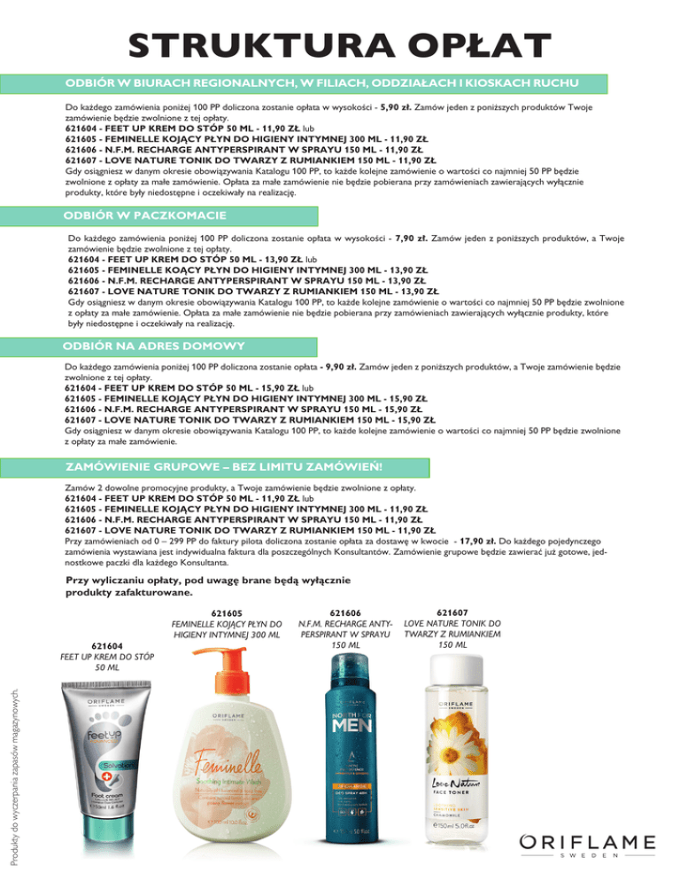 STRUKTURA OPŁAT ODBIÓR W BIURACH REGIONALNYCH, W FILIACH, ODDZIA¸ACH I KIOSKACH RUCHU Do ka˝dego zamówienia poni˝ej 100 PP doliczona zostanie opłata w wysokoÊci - 5,90 zł. Zamów jeden z poni˝szych produktów Twoje zamówienie b´dzie zwolnione z tej opłaty. 621604 - FEET UP KREM DO STÓP 50 ML - 11,90 ZŁ lub 621605 - FEMINELLE KOJÑCY PŁYN DO HIGIENY INTYMNEJ 300 ML - 11,90 ZŁ 621606 - N.F.M. RECHARGE ANTYPERSPIRANT W SPRAYU 150 ML - 11,90 ZŁ 621607 - LOVE NATURE TONIK DO TWARZY Z RUMIANKIEM 150 ML - 11,90 ZŁ Gdy osiàgniesz w danym okresie obowiàzywania Katalogu 100 PP, to ka˝de kolejne zamówienie o wartoÊci co najmniej 50 PP b´dzie zwolnione z opłaty za małe zamówienie. Opłata za małe zamówienie nie b´dzie pobierana przy zamówieniach zawierajàcych wyłàcznie produkty, które były niedost´pne i oczekiwały na realizacj´. ODBIÓR W PACZKOMACIE Do ka˝dego zamówienia poni˝ej 100 PP doliczona zostanie op∏ata w wysokoÊci - 7,90 z∏. Zamów jeden z poni˝szych produktów, a Twoje zamówienie b´dzie zwolnione z tej op∏aty. 621604 - FEET UP KREM DO STÓP 50 ML - 13,90 ZŁ lub 621605 - FEMINELLE KOÑCY PŁYN DO HIGIENY INTYMNEJ 300 ML - 13,90 ZŁ 621606 - N.F.M. RECHARGE ANTYPERSPIRANT W SPRAYU 150 ML - 13,90 ZŁ 621607 - LOVE NATURE TONIK DO TWARZY Z RUMIANKIEM 150 ML - 13,90 ZŁ Gdy osiàgniesz w danym okresie obowiàzywania Katalogu 100 PP, to ka˝de kolejne zamówienie o wartoÊci co najmniej 50 PP b´dzie zwolnione z opłaty za małe zamówienie. Opłata za małe zamówienie nie b´dzie pobierana przy zamówieniach zawierajàcych wyłàcznie produkty, które były niedost´pne i oczekiwały na realizacj´. ODBIÓR NA ADRES DOMOWY Do ka˝dego zamówienia poni˝ej 100 PP doliczona zostanie opłata - 9,90 zł. Zamów jeden z poni˝szych produktów, a Twoje zamówienie b´dzie zwolnione z tej opłaty. 621604 - FEET UP KREM DO STÓP 50 ML - 15,90 ZŁ lub 621605 - FEMINELLE KOJÑCY PŁYN DO HIGIENY INTYMNEJ 300 ML - 15,90 ZŁ 621606 - N.F.M. RECHARGE ANTYPERSPIRANT W SPRAYU 150 ML - 15,90 ZŁ 621607 - LOVE NATURE TONIK DO TWARZY Z RUMIANKIEM 150 ML - 15,90 ZŁ Gdy osiàgniesz w danym okresie obowiàzywania Katalogu 100 PP, to ka˝de kolejne zamówienie o wartoÊci co najmniej 50 PP b´dzie zwolnione z opłaty za małe zamówienie. ZAMÓWIENIE GRUPOWE – BEZ LIMITU ZAMÓWIE¡! Zamów 2 dowolne promocyjne produkty, a Twoje zamówienie b´dzie zwolnione z opłaty. 621604 - FEET UP KREM DO STÓP 50 ML - 11,90 ZŁ lub 621605 - FEMINELLE KOJÑCY PŁYN DO HIGIENY INTYMNEJ 300 ML - 11,90 ZŁ 621606 - N.F.M. RECHARGE ANTYPERSPIRANT W SPRAYU 150 ML - 11,90 ZŁ 621607 - LOVE NATURE TONIK DO TWARZY Z RUMIANKIEM 150 ML - 11,90 ZŁ Przy zamówieniach od 0 – 299 PP do faktury pilota doliczona zostanie opłata za dostaw´ w kwocie - 17,90 zł. Do ka˝dego pojedynczego zamówienia wystawiana jest indywidualna faktura dla poszczególnych Konsultantów. Zamówienie grupowe b´dzie zawieraç ju˝ gotowe, jednostkowe paczki dla ka˝dego Konsultanta. Przy wyliczaniu opłaty, pod uwag´ brane b´dà wyłàcznie produkty zafakturowane. 621605 FEMINELLE KOJÑCY PŁYN DO HIGIENY INTYMNEJ 300 ML Produkty do wyczerpania zapasów magazynowych. 621604 FEET UP KREM DO STÓP 50 ML 621606 N.F.M. RECHARGE ANTYPERSPIRANT W SPRAYU 150 ML 621607 LOVE NATURE TONIK DO TWARZY Z RUMIANKIEM 150 ML