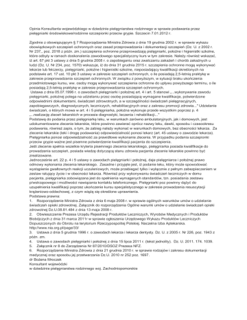 Opinia Konsultanta wojewódzkiego w dziedzinie pielęgniarstwa rodzinnego w sprawie podawania przez pielęgniarki środowiskowe/rodzinne szczepionki przeciw grypie. Szczecin 7.01.2012 r. Zgodnie z obowiązującym § 7 Rozporządzenia Ministra Zdrowia z dnia 19 grudnia 2002 r. w sprawie wykazu obowiązkowych szczepień ochronnych oraz zasad przeprowadzania i dokumentacji szczepień (Dz. U. z 2002 r. Nr 237,, poz. 2018 z późn. zm.) szczepienia ochronne przeprowadzają pielęgniarki, położne i higienistki szkolne, które odbyły w ramach doskonalenia zawodowego specjalistyczny kurs w tym zakresie. Należy również wskazać, iż art. 67 pkt 3 ustawy z dnia 5 grudnia 2008 r. o zapobieganiu oraz zwalczaniu zakażeń i chorób zakaźnych u ludzi (Dz. U. Nr 234, poz. 1570) wskazuje, iż do dnia 31 grudnia 2015 r. szczepienia ochronne mogą wykonywać lekarze lub felczerzy, pielęgniarki, położne i higienistki szkolne, nieposiadający kwalifikacji określonych na podstawie art. 17 ust. 10 pkt 3 ustawy w zakresie szczepień ochronnych, o ile posiadają 2,5-letnią praktykę w zakresie przeprowadzania szczepień ochronnych. W związku z powyższym, w sytuacji braku ukończenia przedmiotowego kursu, ww. osoby mogą wykonywać szczepienia ochronne do upływu powyższego terminu, o ile posiadają 2,5-letnią praktykę w zakresie przeprowadzania szczepień ochronnych. Ustawa z dnia 05.07.1996 r. o zawodach pielęgniarki i położnej art. 4 i art. 5 stanowi „...wykonywanie zawodu pielęgniarki, położnej polega na udzielaniu przez osobę posiadającą wymagane kwalifikacje, potwierdzone odpowiednimi dokumentami, świadczeń zdrowotnych, a w szczególności świadczeń pielęgnacyjnych, zapobiegawczych, diagnostycznych, leczniczych, rehabilitacyjnych oraz z zakresu promocji zdrowia..." Udzielanie świadczeń, o których mowa w art. 4 i 5 pielęgniarka, położna wykonuje przede wszystkim poprzez p. 4 „...realizację zleceń lekarskich w procesie diagnostyki, leczenia i rehabilitacji..." Podstawą do podania przez pielęgniarkę leku, w warunkach zarówno ambulatoryjnych, jak i domowych, jest udokumentowane zlecenie lekarskie, które powinno zawierać oprócz nazwy leku, dawki, sposobu i czasookresu podawania, również zapis, o tym, że zabieg należy wykonać w warunkach domowych, bez obecności lekarza. Za zlecenie lekarskie (leki i drogę podawania) odpowiedzialność ponosi lekarz (art. 45 ustawy o zawodzie lekarza). Pielęgniarka ponosi odpowiedzialność za prawidłowe wykonanie zlecenia. W przypadku podania szczepionki przeciw grypie ważne jest pisemne potwierdzenie kwalifikacji pacjenta do szczepienia. Jeśli zlecenie spełnia wszelkie kryteria pisemnego zlecenia lekarskiego, pielęgniarka posiada kwalifikacje do prowadzenia szczepień, posiada wiedzę dotyczącą stanu zdrowia pacjenta zlecenie lekarskie powinno być zrealizowane. Jednocześnie art. 22 p. 4 i 5 ustawy o zawodach pielęgniarki i położnej, daje pielęgniarce i położnej prawo odmowy wykonania zlecenia lekarskiego. Zasadne i przyjęte jest, iż podanie leku, który może spowodować wystąpienie gwałtownych reakcji uczuleniowych, może przebiegać tylko i wyłącznie z pełnym zabezpieczeniem w zestaw ratujący życie i w obecności lekarza. Również przy wykonywaniu świadczeń leczniczych w domu pacjenta, pielęgniarka zobowiązana jest do spełnienia wymaganych standardów, tzn. posiadania zestawu p/wstrząsowego i możliwości nawiązania kontaktu telefonicznego. Pielęgniarki poz powinny dążyć do uzupełnienia kwalifikacji poprzez ukończenie kursu specjalistycznego w zakresie prowadzenia resuscytacji krążeniowo-oddechowej, z czym wiążą się określone uprawnienia. Podstawa prawna: 1. Rozporządzenie Ministra Zdrowia z dnia 6 maja 2008 r. w sprawie ogólnych warunków umów o udzielanie świadczeń opieki zdrowotnej. Załącznik do rozporządzenia Ogólne warunki umów o udzielanie świadczeń opieki zdrowotnej Dz.U.08.81.484 z dnia 13 maja 2008 r. 2. Obwieszczenie Prezesa Urzędu Rejestracji Produktów Leczniczych, Wyrobów Medycznych i Produktów Biobójczych z dnia 31 marca 2011r w sprawie ogłoszenia Urzędowego Wykazu Produktów Leczniczych Dopuszczonych do Obrotu na terytorium Rzeczypospolitej Polskiej. Naczelna Izba Aptekarska. http://www.nia.org.pl/page/33/ 3. Ustawa z dnia 5 grudnia 1996 r. o zawodach lekarza i lekarza dentysty. Dz. U. z 2005 r. Nr 226, poz. 1943 z późn. zm. 4. Ustawa o zawodach pielęgniarki i położnej z dnia 15 lipca 2011 r. (tekst jednolity). Dz. U. 2011. 174. 1039. 5. Załącznik nr 8 do Zarządzenia Nr 87/2010/DSOZ Prezesa NFZ. 6. Rozporządzenie Ministra Zdrowia z dnia 21 grudnia 2010 r. w sprawie rodzajów i zakresu dokumentacji medycznej oraz sposobu jej przetwarzania Dz.U. 2010 nr 252 poz. 1697. dr Bożena Mroczek Konsultant wojewódzki w dziedzinie pielęgniarstwa rodzinnego woj. Zachodniopomorskie