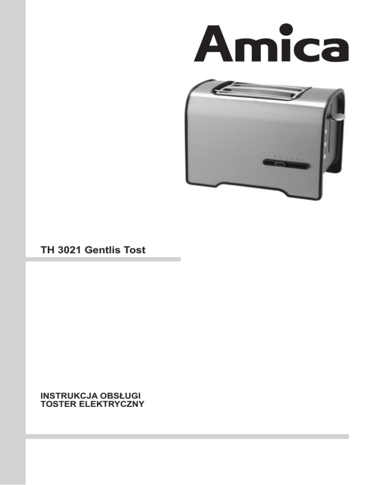 TH 3021 Gentlis Tost INSTRUKCJA OBSŁUGI TOSTER ELEKTRYCZNY 1 SZANOWNY KLIENCIE, Urządzenie marki Amica to połączenie wyjątkowej łatwości obsługi i doskonałej efektywności. Po prze czytaniu niniejszej instrukcji, obsługa urządzenia nie będzie problemem. Prosimy Państwa o uważną lekturę instrukcji obsługi przed uruchomieniem urządzenia. Przestrzeganie zawartych w niej wskazówek uchroni Państwa przed niewłaściwym użytkowaniem. Instrukcję należy zachować i przechowywać tak, aby mieć ją zawsze pod ręką. Należy dokładnie przestrzegać instrukcji obsługi w celu uniknięcia nieszczęśliwych wypadków. Uwaga! Urządzenie przeznaczone jest wyłącznie do użytku domowego. Producent zastrzega sobie możliwość dokonywania zmian niewpływających na działanie urządzenia. spis treści Wskazówki dotyczące bezpieczeństwa użytkowania....................4 Budowa i wyposażenie urządzenia..........................................................5 Obsługa..............................................................................................................5 Czyszczenie i konserwacja.........................................................................6 DANE TECHNICZNE I SPECYFIKACJA URZĄDZENIA........................................7 GWARANCJA, OBSŁUGA POSPRZEDAŻNA......................................................7 Masz wątpliwości? Nie wszystko, co przeczytałeś w instrukcji jest zrozumiałe? - zadzwoń do Centrum Serwisowego, gdzie uzyskasz wszechstronną pomoc. tel.0-801 801 800 3 WSKAZÓWKI DOTYCZĄCE BEZPIECZEŃSTWA UŻYTKOWANIA Uwaga! Aby zminimalizować ryzyko powstania pożaru, porażenia prądem lub uszkodzenia ciała: lUważnie przeczytaj tą instrukcję przed użytkowaniem urządzenia. l Dzieci nie zdają sobie sprawy z niebezpieczeństw, które mogą powstać podczas używania urządzeń elektrycznych; dlatego trzymaj to urządzenie poza zasięgiem dzieci. l Nie zanurzaj korpusu urządzenia w wodzie lub innych cieczach. Zanurzenie w wodzie może spowodować porażenie prądem elektrycznym. l W przypadku zalania wodą zewnętrznych elementów urządzenia, przed ponownym włącze niem urządzenia do sieci dokładnie je wysusz. l Nie używaj urządzenia, jeżeli wykazuje ono jakiekolwiek oznaki uszkodzenia przewodu przy łączeniowego lub jeżeli urządzenie zostało upuszczone na podłogę. l Po użyciu zawsze wyciągaj wtyczkę z gniazdka a także w przypadku jakiegokolwiek niewła ściwego działania oraz przed czyszczeniem. l Przy wyciąganiu wtyczki z gniazdka ściennego nigdy nie ciągnij za przewód tylko za wtyczkę jednocześnie trzymając drugą ręką gniazdko sieciowe. l Urządzenie jest wykonane w I klasie ochrony przeciwporażeniowej i dlatego gniazdo zasilają ce, do którego zostanie podłączony musi być bezwzględnie wyposażone w bolec ochronny. l Nie próbuj usuwać żadnych części obudowy. l Aby uniknąć uszkodzenia przewodu zasilającego nie umieszczaj go ponad ostrymi krawędzia mi, ani w pobliżu gorących powierzchni. l Nie wystawiaj urządzenia na deszcz lub wilgoć i nie używaj urządzenia na zewnątrz. Nie ob sługuj urządzenia mokrymi rękoma. l Jeżeli przewód sieciowy lub wtyczka ulegną uszkodzeniu, to powinny one być wymienione przez specjalistyczny zakład naprawczy w celu uniknięcia zagrożenia. lNigdy nie zostawiaj urządzenia podłączonego do sieci bez nadzoru. l Niniejszy sprzęt nie jest przeznaczony do użytkowania przez osoby (w tym dzieci) o ograni czonej zdolności fizycznej, czuciowej lub psychicznej, lub osoby o braku doświadczenia lub znajomości sprzętu, chyba że odbywa się to pod nadzorem lub zgodnie z instrukcją użytkowa nia sprzętu, przekazaną przez osoby odpowiadające za ich bezpieczeństwo. Należy zwracać uwagę na dzieci, by nie bawiły się urządzeniem. lUżywanie akcesoriów, które nie zostały dostarczone wraz z produktem może doprowadzić do uszkodzenia urządzenia. l Przed użyciem rozwinąć i wyprostować przewód sieciowy. l Urządzenia używaj na płaskiej, stabilnej powierzchni. l Nie używaj przedłużacza, który nie spełnia obowiązujących norm i przepisów elektrycznych. l Nie włączaj urządzenia bez prawidłowo zamontowanej tacki na okruchy. l Nie umieszczaj wewnątrz urządzenia folii aluminiowej ani innych przedmiotów, może to spo wodować porażenie lub pożar. l Nie używaj urządzenia do ogrzewania pomieszczeń. l Nie używaj urządzenia do innych celów niż jest przeznaczone. l Zachowaj wszelkie środki ostrożności, nie dotykaj żadnych gorących powierzchni tostera. Nie chowaj urządzenia ani nie nakrywaj go, dopóki całkowicie nie wystygnie. l Nie umieszczaj urządzenia na gorącym palniku gazowym, elektrycznym lub w ich pobliżu ani w miejscach, gdzie mogłoby zetknąć się z innymi źródłami ciepła. l Uwaga: pieczywo może się spalić. Korzystając z tostera zapewnij odpowiednią przestrzeń nad urządzeniem i ze wszystkich stron dla odpowiedniego obiegu powietrza. Urządzenie podczas pracy nie może dotykać zasłon, dekoracji ściennych, odzieży, ręczników papierowych ani in nych materiałów palnych. Na powierzchniach, które mogą być wrażliwe na wysokie tempera tury zaleca się korzystanie z izolowanej podkładki termicznej. l Nie używaj tostera bez zamontowanej wysuwanej tacki na okruchy. Tackę na okruchy należy regularnie czyścić. Nie dopuścić do nadmiernego gromadzenia się okruchów na tacce. l Nie używaj urządzenia do opiekania produktów żywnościowych zawierających cukier ani pro duktów z zawartością przetworów owocowych lub konserwantów. l Ostrzeżenie! Nie wolno wyciągać zaciętego pieczywa nożem lub innym przedmiotem, ponie waż zetknięcie z elementami pod napięciem może spowodować śmiertelne porażenie prądem elektrycznym. Należy odczekać, aż urządzenie ostygnie, odłączyć je od zasilania i ostrożnie wyjąć pieczywo. l Uwaga! Sprzęt nie jest przeznaczony do pracy z