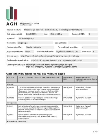 Nazwa modułu: Prezentacja danych i multimedia II, Technologia internetowa Rok akademicki: Wydział: Kierunek: 2014/2015 Kod: HSO-1-305-s Punkty ECTS: 4 Humanistyczny Socjologia Poziom studiów: Specjalność: Studia I stopnia Język wykładowy: Polski Profil kształcenia: - Forma i tryb studiów: Ogólnoakademicki (A) Semestr: 3 Strona www: http://www.wh.agh.edu.pl/main/pl/programy-zajec-i-sylabusy Osoba odpowiedzialna: mgr inż. Brzegowy Ryszard ([email protected]) Osoby prowadzące: Piskor-Ignatowicz Cezary ([email protected]) mgr inż. Brzegowy Ryszard ([email protected]) Opis efektów kształcenia dla modułu zajęć Kod EKM Student, który zaliczył moduł zajęć wie/umie/potrafi Powiązania z EKK Sposób weryfikacji efektów kształcenia (forma zaliczeń) M_W001 Zna podstawową terminologię z zakresu metodologii badań socjologicznych oraz zasady projektowania i stosowania narzędzi analizy zarówno ilościowej jak jakościowej oraz posiada podstawową wiedzę na temat technologii informatycznych i audiowizualnych SO1A_W11 Wykonanie ćwiczeń laboratoryjnych M_W002 Posiada podstawową wiedzę na temat technologii informatycznych i audiowizualnych SO1A_W11 Wykonanie ćwiczeń M_U001 Potrafi dokonać analizy zgromadzonego materiału badawczego z wykorzystaniem odpowiadających im technik analitycznych i wspomagających programów komputerowych SO1A_U14 Wykonanie ćwiczeń laboratoryjnych M_U002 Potrafi dobrać odpowiednią technologię do realizowanego zadania, zna jej kluczowe zalety i ograniczenia. SO1A_U10 Wykonanie ćwiczeń Wiedza Umiejętności Kompetencje społeczne 1/5 Karta modułu - Prezentacja danych i multimedia II, Technologia internetowa M_K001 na zakres posiadanej przez siebie wiedzy i umiejętności, rozumie potrzebę ciągłego dokształcania się i rozwoju zawodowego SO1A_K02 Zaliczenie laboratorium Matryca efektów kształcenia w odniesieniu do form zajęć Konwersatori um Zajęcia seminaryjne Zajęcia praktyczne Zajęcia terenowe Zajęcia warsztatowe Zna podstawową terminologię z zakresu metodologii badań socjologicznych oraz zasady projektowania i stosowania narzędzi analizy zarówno ilościowej jak jakościowej oraz posiada podstawową wiedzę na temat technologii informatycznych i audiowizualnych - - + + - - - - - - - M_W002 Posiada podstawową wiedzę na temat technologii informatycznych i audiowizualnych - - + + - - - - - - - M_U001 Potrafi dokonać analizy zgromadzonego materiału badawczego z wykorzystaniem odpowiadających im technik analitycznych i wspomagających programów komputerowych - - + + - - - - - - - M_U002 Potrafi dobrać odpowiednią technologię do realizowanego zadania, zna jej kluczowe zalety i ograniczenia. - - + + - - - - - - - - - + + - - - - - - - E-learning Ćwiczenia projektowe M_W001 Inne Ćwiczenia laboratoryjne Forma zajęć Ćwiczenia audytoryjne Student, który zaliczył moduł zajęć wie/umie/potrafi Wykład Kod EKM Wiedza Umiejętności Kompetencje społeczne M_K001 na zakres posiadanej przez siebie wiedzy i umiejętności, rozumie potrzebę ciągłego dokształcania się i rozwoju zawodowego Treść modułu zajęć (program wykładów i pozostałych zajęć) Ćwiczenia laboratoryjne 2/5 Karta modułu - Prezentacja danych i multimedia II, Technologia internetowa Prezentacja danych i multimedia <strong>Przetwarzanie danych – program Excel</strong> – 4 godz. Omówienie zagadnień związanych z przetwarzaniem danych z wykorzystaniem programu Excel, tworzenie formuł, funkcje matematyczne i statystyczne, sortowanie oraz filtrowanie. Prezentacja danych w postaci tabel i wykresów. <strong>Przetwarzanie dźwięku</strong> – 2 godz. Podstawowe pojęcia związane z dźwiękiem,formaty zapisu plików audio, programy narzędziowe oraz ich funkcje. <strong>Obróbka cyfrowa filmów</strong> – 3 godz. Podstawowe pojęcia, formaty zapisu filmów, efekty specjalne, dodawanie scieżki dźwiękowej, napisów, montaż, efekty przejścia. <strong>Matlab</strong> – 2 godz. Interfejs środowiska Matlab, podstawowe operacje na wektorach i macierzach, instrukcje, skrypty oraz funkcje. <strong>XML</strong> – 2 godz. Zasady stosowania XML, pojęcie dokumentu, składnia, atrybuty, walidacja dokumentów, rozszerzenia XML. <strong>SQL i bazy danych</strong> – 2 godz. Pojęcie bazy danych, wprowadzenie do SQL, tworzenie baz danych, podstawowe klauzule SQL, formuły, warunki, selekcja i sortowanie wyników.<strong>Edycja złożonych wzorów matematycznych</strong> Zasady edycji złożonych wzorów matematycznych (Word, MathType, Latex) <strong>Obliczania numeryczne</strong> Realizowanie obliczeń numerycznych z zastosowaniem formuł i funkcji (Excel) <strong>Prezentacja danych</strong> Prezentacja danych – formatowanie tabel, tworzenie wykresów funkcji (Excel) <strong>Zaawansowane funkcje pakietu MS Office</strong> Integracja tekstu, grafiki, plików multimedialnych, opracowanie worca szablonu (PowerPoint) <strong>Przetwarzanie dźwięku</strong> Użycie programów narzędziowych edycji plików audio (Audacity). <strong>Obróbka cyfrowa filmów</strong> Realizacja prostego film (VirtualDub, Windows Movie Maker) <strong>Matlab</strong> Operacje na wektorach i macierzach, przetwarzanie obrazów – funkcje podstawowe. <strong>XML</strong> Zasady stosowania XML, składnia, atrybuty, walidacja dokumentów. <strong>SQL</strong> Tworzenie baz danych, podstawowe klauzule SQL, formuły, warunki, selekcja i sortowanie wyników. Ćwiczenia projektowe Technologia internetowa Program zajęć obejmuje: Protokoły i usługi internetowe. Język HTML i konstrukcja stron internetowych. Dynamiczne modyfikacje stron przy pomocy JavaScript. Formatowanie stron za pomocą kaskadowych arkuszy stylów (CSS). Podstawy dynamicznie generowanych stron (przez serwer). Zagrożenia w internecie – metody ataków na użytkowników i serwisy internetowe oraz sposoby przeciwdziałania nim. W ramach zajęć laboratoryjnych studenci mają za zadanie przygotowanie wł