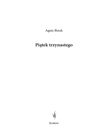 Agata Bizuk Piątek trzynastego Kraków 1 © Copyright by Agata Bizuk Zdjęcie na okładce © PicciaNeri, fotolia.com Edycja © Copyright by Księgarnia Wydawnictwo Skrzat Stanisław Porębski, Kraków 2012 Projekt okładki: Paweł Maślarz Redakcja: Sylwia Marszał Korekta: Agnieszka Sabak Skład: Paweł Maślarz ISBN 978-83-7437- 822-2 Księgarnia Wydawnictwo Skrzat Stanisław Porębski ul. Prądnicka 77, 31-202 Kraków Tel. (12) 414 28 51 Odwiedź naszą księgarnię internetową: www.skrzat.com.pl – Wszystkiego najlepszego, skarbie – Dawid wydawał się bardzo poruszony. Mimo zniekształceń obrazu kamery doskonale było widać, że ma oczy pełne łez. I chociaż z całych sił starał się grać twardziela, jego smutek był naprawdę szczery. Mnie też było przykro. Kolejne urodziny spędzałam całkiem sama, gapiąc się na niego jedynie przez ekran monitora. W takich chwilach bardzo mi go brakowało. Jego śmiechu, porannego roztrzepania i zapachu jego włosów, w które z rozkoszą zanurzałam swoje palce. Cholernie za nim tęskniłam. Ileż bym dała, żeby się znów do niego przytulić. Niestety, jedyne, co mi pozostało, to czekanie i nadzieja, że kiedyś to wszystko się zmieni. Wyłączyłam komputer i pociągnęłam łyk wina prosto z butelki. Była prawie pusta, a mnie już porządnie szumiało w głowie. – Trzydziestka na karku, a ty ciągle sama – powiedziałam do swojego odbicia w lustrze. – Cóż, wszystkiego najlepszego, ofermo – rzuciłam się na łóżko, nie zastanawiając się nawet nad sensem kąpieli. Chciałam, żeby ta cała urodzinowa farsa była jedynie koszmarnym snem. * 3 Obudziłam się z ogromnym kacem i poczuciem osamotnienia jeszcze większym niż wieczorem. Niestety, to wszystko wydarzyło się naprawdę. Mam już 30 lat, wymięte ubranie, pustą butelkę ulubionego Barbaresco z bólem głowy w promocji i cztery puste ściany. Nie ma nawet wiernego psa, który merdałby do mnie ogonem. Wielkie nic. Mam za to ogromny dom z ogrodem w podwałbrzyskim Szczawnie, w którym spędzam samotne chwile, zamknięta niczym w szklanej kuli, i mogę rozmawiać jedynie sama ze sobą. Już przestało mi to wystarczać. Dawid za każdym razem, kiedy przyjeżdżał z tych swoich bardzo ważnych zagranicznych kontraktów, przywoził mi mnóstwo bibelotów, drogich czy mniej drogich prezentów i nadzieję, że może tym razem zostanie na dłużej. Niestety, zostawały po nim jedynie te podarunki, rozpacz, kiedy znów wyjeżdżał, i obietnice, że jeszcze trochę, że już niedługo. Znałam to na pamięć i coraz mniej w to wszystko wierzyłam. Dawid jest najbardziej czułym i kochanym facetem, jakiego znam. Wydaje się, że nie ma wad, jest idealny, tak jak wszystko, co go otacza. Niestety, najczęściej jest daleko i mogę swój ideał podziwiać jedynie przez skype’a. skacowane ciało z wymiętej pościeli i powlokłam się do łazienki. Wyglądałam żałośnie – z mojego wczorajszego makijażu została jedynie rozmazana plama, włosy zdawały się mieć własne plany na dzisiejsze przedpołudnie, a ubranie wyglądało tak, jakby ktoś siłą próbował je ze mnie zedrzeć. Szczerze mówiąc, żałowałam, że to sprawka zbyt szybko wypitego wina, a nie Dawida, ale na razie niewiele mogłam na to poradzić. Szybki prysznic nieznacznie poprawił sytuację. Może rzeczywiście wyglądałam nieco lepiej, ale ból głowy nie dawał zapomnieć o wczorajszym wieczorze. Kończyłam właśnie tuszować rzęsy, dopijając jednocześnie mocną kawę, którą zrobiłam, żeby jakoś postawić się do pionu, kiedy jak burza wpadła Aśka. – Zbieraj się, zbieraj, nie ma czasu na głupoty – grzmiała już od progu, chociaż ja miałam jedynie ochotę, żeby z powrotem znaleźć się w łóżku. – Starość nie radość – wymamrotałam pod nosem i powlokłam się za nią do samochodu. * Dzwonek telefonu wyrwał mnie z depresyjnych myśli. – Cześć, staruszko! – Aśka prawie krzyczała do słuchawki. – Zabieram cię na szaloną rundę po mieście i nie chcę słyszeć żadnego marudzenia. Za pół godziny jestem u ciebie! – trzaśnięcie słuchawką nie dało mi szansy, żeby zaprotestować. Tak naprawdę nie miałam siły ani chęci na żadne zakupy, a już na pewno nie na włóczenie się po knajpach. Niestety, z Aśką nie sposób dyskutować. Pozbierałam więc swoje Ledwo otworzyłam drzwi, na kolana z impetem wskoczyła mi puchata kulka, głośno miaucząc. Kot, najprawdziwszy żywy kot w Aśki samochodzie. Skąd on się tu wziął, u licha? Przytulił się pewnie do ciepłego silnika i teraz ni stąd, ni zowąd wyskoczył na mnie, przyprawiając niemalże o zawał. Czy koty naprawdę muszą zawsze wyskakiwać tak niespodziewanie? Czy nie byłoby milej, gdyby przynajmniej zechciały łaskawie zapowiedzieć swój atak? Ale nie, najlepiej wskoczyć na Bogu ducha winną, skacowaną, trzydziestoletnią kobietę w depresji i upaćkać jej białą kurtkę. – Niespodzianka! – radośnie wrzasnęła Aśka, aż przechodnie zaczęli się za nami oglądać. 4 5 * Otrzepałam się z kurzu i spojrzałam na nią z przerażeniem. Że niby co? Ten futrzasty stwór miał być ową niespodzianką? Ten sam, który właśnie wbił się pazurami w moją rękę i zwisał z niej jak w cyrku? To przecież jakaś masakra. – Przywitaj się – uśmiechnęła się moja przyjaciółka – to twój nowy kompan. Pomyślałam, że od tego przesiadywania przed komputerem zdziczejesz do reszty, więc znalazłam ci prawdziwe towarzystwo – Aśka była tak uradowana własnym pomysłem, że miałam ochotę palnąć ją w łeb. Co ja zrobię z tym nieszczęsnym stworzeniem? Nawet nie wiem, co jedzą takie małe potwory. Myszy – oczywiście, ale jak można dać małą, bezradną myszkę na pożarcie takiej krwiożerczej bestii??? Fakt, jeszcze niewyrośniętej, ale krwiożerczej na pewno. Czy Aśka do reszty zwariowała? Ogromne oczyska, nieproporcjonalnie duże w stos