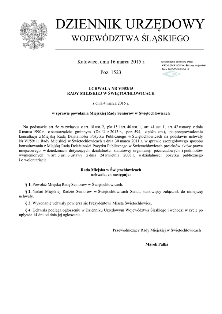 DZIENNIK URZĘDOWY WOJEWÓDZTWA ŚLĄSKIEGO Katowice, dnia 16 marca 2015 r. Elektronicznie podpisany przez: KRZYSZTOF NOWAK; Śląski Urząd Wojewódzki Data: 2015-03-16 09:34:10 Poz. 1523 UCHWAŁA NR VI/53/15 RADY MIEJSKIEJ W ŚWIĘTOCHŁOWICACH z dnia 4 marca 2015 r. w sprawie powołania Miejskiej Rady Seniorów w Świętochłowicach Na podstawie art. 5c w związku z art. 18 ust. 2, pkt 15 i art. 40 ust. 1, art. 41 ust. 1, art. 42 ustawy z dnia 8 marca 1990 r. o samorządzie gminnym (Dz. U. z 2013 r., poz. 594, z późn. zm.), po przeprowadzeniu konsultacji z Miejską Radą Działalności Pożytku Publicznego w Świętochłowicach na podstawie uchwały Nr VI/59/11 Rady Miejskiej w Świętochłowicach z dnia 30 marca 2011 r. w sprawie szczegółowego sposobu konsultowania z Miejską Radą Działalności Pożytku Publicznego w Świętochłowicach projektów aktów prawa miejscowego w dziedzinach dotyczących działalności statutowej organizacji pozarządowych i podmiotów wymienionych w art. 3 ust. 3 ustawy z dnia 24 kwietnia 2003 r. o działalności pożytku publicznego i o wolontariacie Rada Miejska w Świętochłowicach uchwala, co następuje: § 1. Powołać Miejską Radę Seniorów w Świętochłowicach. § 2. Nadać Miejskiej Radzie Seniorów w Świętochłowicach Statut, stanowiący załącznik do niniejszej uchwały. § 3. Wykonanie uchwały powierza się Prezydentowi Miasta Świętochłowice. § 4. Uchwała podlega ogłoszeniu w Dzienniku Urzędowym Województwa Śląskiego i wchodzi w życie po upływie 14 dni od dnia jej ogłoszenia. Przewodniczący Rady Miejskiej w Świętochłowicach Marek Palka –2– Poz. 1523 Dziennik Urzędowy Województwa Śląskiego _______________________________________________________________________________________________________________ Załącznik do Uchwały Nr VI/53/15 Rady Miejskiej w Świętochłowicach z dnia 4 marca 2015 r. Statut Miejskiej Rady Seniorów w Świętochłowicach § 1. Niniejszy Statut określa tryb wyboru członków oraz zasady działania Miejskiej Rady Seniorów w Świętochłowicach. § 2. Ilekroć w niniejszym Statucie jest mowa o: 1) Radzie, należy przez to rozumieć Miejską Radę Seniorów w Świętochłowicach, 2) Gminie, należy przez to rozumieć Miasto Świętochłowice, 3) Radzie Miejskiej, należy przez to rozumieć Radę Miejską w Świętochłowicach, 4) Prezydencie, należy przez to rozumieć Prezydenta Miasta Świętochłowice, 5) Urzędzie, należy przez to rozumieć Urząd Miejski w Świętochłowicach, 6) Przewodniczącym, należy w Świętochłowicach, przez to rozumieć Przewodniczącego Miejskiej Rady Seniorów 7) Wiceprzewodniczącym, należy przez to rozumieć Wiceprzewodniczącego Miejskiej Rady Seniorów w Świętochłowicach, 8) Biuletynie Informacji Publicznej, należy przez to rozumieć Biuletyn Informacji Publicznej Urzędu Miejskiego w Świętochłowicach 9) osobie starszej, należy przez to rozumieć osobę która ukończyła 60 rok życia. § 3. 1. Rada liczy 11 członków. 2. Członkami Rady mogą być wyłącznie pełnoletnie osoby mające miejsce zamieszkania na terenie Gminy, które zostały prawidłowo zgłoszone zgodnie z dalszymi postanowieniami niniejszego Statutu. 3. Członkami Rady mogą być: 1) przedstawiciele podmiotów działających na rzecz osób starszych wybrani zgodnie z zasadami określonymi w § 4, 2) osoby posiadające poparcie co najmniej 25 osób starszych posiadających miejsce zamieszkania na terenie Gminy wybrane zgodnie z zasadami określonymi w § 5. § 4. 1. Każdy podmiot działający na rzecz osób starszych może zgłosić swojego kandydata lub kandydatów do Rady spośród swoich członków lub innych mieszkańców Gminy według następujących zasad: 1) podmiot działający na rzecz osób starszych, posiadający mniej niż 50 członków (lub nie posiadający członków) może delegować jednego kandydata do Rady, 2) podmiot działający na rzecz osób starszych, posiadający więcej niż 50 członków może delegować nie więcej niż dwóch kandydatów do Rady. 2. Przedstawiciele podmiotów działających na rzecz osób starszych wybierani są w trybie ustalonym w statucie lub innym dokumencie wewnętrznym (np. regulaminie). § 5. 1. Każda osoba starsza posiadająca miejsce zamieszkania na terenie Gminy może udzielić poparcia nie więcej niż dwóm kandydatom do Rady. 2. Udzielenie poparcia, przez tę samą osobę, więcej niż dwóm kandydatom do Rady skutkować będzie nieuwzględnieniem głosu poparcia tej osoby przy wszystkich zgłoszonych kandydatach. § 6. 1. Prezydent w drodze zarządzenia ogłasza nabór kandydatów do Rady oraz określa wzory formularza zgłoszeniowego wraz z wymaganymi załącznikami oraz ustala termin zgłaszania kandydatów do Rady. –3– Poz. 1523 Dziennik Urzędowy Województwa Śląskiego _______________________________________________________________________________________________________________ 2. Zarządzenie, o których mowa w ust. 1 podaje się do publicznej wiadomości poprzez ogłoszenie w Biuletynie Informacji Publicznej oraz na stronie internetowej Urzędu. § 7. 1. Zgłoszenie kandydata do Rady następuje poprzez wypełnienie i złożenie w biurze podawczym Urzędu formularza zgłoszeniowego wraz z załącznikami. 2. W przypadku kandydatów do Rady zgłaszanych przez podmioty działające na rzecz osób starszych, formularz zgłoszeniowy powinien być podpisany zgodnie z zasadą reprezentacji wynikającą ze statutu lub innego aktu wewnętrznego regulującego zasady funkcjonowania danego podmiotu. 3. W przypadku osób posiadających poparcie co najmniej 25 osób starszych zamieszkujących na terenie Gminy, formularz zgłoszeniowy powinien być podpisany przez wyżej wymienione osoby popierające. Do formularza zgłoszeniowego dołącza się oświadczenie o wyrażeniu zgody na kandydowanie do Rady. 4. Zgłoszenia podlegają weryfikacji formalnej przez Prezydenta polegającej na sprawdzeniu kompletności i p