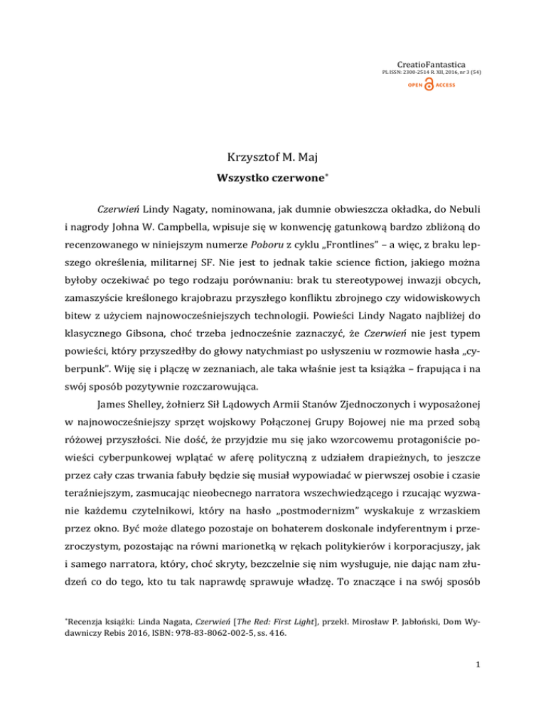 CreatioFantastica PL ISSN: 2300-2514 R. XII, 2016, nr 3 (54) Krzysztof M. Maj Wszystko czerwone Czerwień Lindy Nagaty, nominowana, jak dumnie obwieszcza okładka, do Nebuli i nagrody Johna W. Campbella, wpisuje się w konwencję gatunkową bardzo zbliżoną do recenzowanego w niniejszym numerze Poboru z cyklu „Frontlines” – a więc, z braku lepszego określenia, militarnej SF. Nie jest to jednak takie science fiction, jakiego można byłoby oczekiwać po tego rodzaju porównaniu: brak tu stereotypowej inwazji obcych, zamaszyście kreślonego krajobrazu przyszłego konfliktu zbrojnego czy widowiskowych bitew z użyciem najnowocześniejszych technologii. Powieści Lindy Nagato najbliżej do klasycznego Gibsona, choć trzeba jednocześnie zaznaczyć, że Czerwień nie jest typem powieści, który przyszedłby do głowy natychmiast po usłyszeniu w rozmowie hasła „cyberpunk”. Wiję się i plączę w zeznaniach, ale taka właśnie jest ta książka – frapująca i na swój sposób pozytywnie rozczarowująca. James Shelley, żołnierz Sił Lądowych Armii Stanów Zjednoczonych i wyposażonej w najnowocześniejszy sprzęt wojskowy Połączonej Grupy Bojowej nie ma przed sobą różowej przyszłości. Nie dość, że przyjdzie mu się jako wzorcowemu protagoniście powieści cyberpunkowej wplątać w aferę polityczną z udziałem drapieżnych, to jeszcze przez cały czas trwania fabuły będzie się musiał wypowiadać w pierwszej osobie i czasie teraźniejszym, zasmucając nieobecnego narratora wszechwiedzącego i rzucając wyzwanie każdemu czytelnikowi, który na hasło „postmodernizm” wyskakuje z wrzaskiem przez okno. Być może dlatego pozostaje on bohaterem doskonale indyferentnym i przezroczystym, pozostając na równi marionetką w rękach politykierów i korporacjuszy, jak i samego narratora, który, choć skryty, bezczelnie się nim wysługuje, nie dając nam złudzeń co do tego, kto tu tak naprawdę sprawuje władzę. To znaczące i na swój sposób Recenzja książki: Linda Nagata, Czerwień [The Red: First Light], przekł. Mirosław P. Jabłoński, Dom Wydawniczy Rebis 2016, ISBN: 978-83-8062-002-5, ss. 416. 1 zabawne, gdyż głównym bohaterem powieści Nagaty jest tak naprawdę tytułowa Czerwień – tajemnicza AI skryta w chmurze, jak każdy porządny deus absconditus, czy może raczej Diabeł, jak woli nazywać ją psychotyczna ThelmaSheridan, prezes korporacji wojskowej Vanda-Sheridan. Czerwień otóż zdaje się darzyć szczególną atencją naszego bohatera o doskonale umykających w niepamięć personaliach, ratując go od rozmaitych opresji i pozostawiając go przy życiu zupełnie tak, jakby miał pozostać narratorem pierwszoosobowym w nadchodzących tomach cyklu. To oczywiście płoche żarty, ale najwyraźniej chwytu deus ex machina, ładnie rezonującego z problematyką cyberpunkowych augmentacji, nie sposób jednak stosować dziś w sposób niebudzący czytelniczego sceptycyzmu. Nagata jednakże odważnie prowadzi narrację w obranym przez siebie stylu, nie stroniąc – uwaga, uwaga! – od niespiesznego odkrywania fabularnych kart i precyzyjnego prowadzenia akcji tak, jakby nie rozgrywała się ona na froncie, lecz za stołem w pokoju dowodzenia, pełnego oparów dymu z drogich cygar i woni pewnego likieru, który nieodparcie kojarzy się z nazwiskiem ThelmySheridan. Jeśli więc poszukiwać formalnego i artystycznego novum w nurcie militarnej SF – styl pisarski Lindy Nagaty z pewnością czyni ją jednym z mocniejszych kandydatów do niełatwej roli prekursora odważnych zmian w poetyce gatunku. Dość rzecz, że najdłuższą, najbardziej interesującą i wstrząsającą zarazem częścią powieści jest szczegółowy opis adaptacji… jak mu tam było…? Cherry’ego… Shella… Shelleya do wszczepionych mu wskutek rozmaitych zaszłości fabularnych protez – które nie wskakują na swoje miejsce z radosnym szczękiem godnym wszczepów Adama Jensena, lecz odmawiają posłuszeństwa i skazują na tortury związane z dostrojeniem sygnałów sprzężenia zwrotnego między układem cybernetycznym protez i nerwowym człowieka. W tej partii powieści bodaj najwyraźniej uwydatnia się ambicja Nagaty do kreowania wyrazistych, przejmujących portretów psychologicznych – i to nawet dla tych postaci, które pokarała nieskończenie przeciętnymi imionami. Fantastycznie wypadają również opisy adaptacji zarówno Swinneya, jak i innych członków grupy bojowej do nowych technologii, hackowanych, przechwytywanych, wykorzystywanych do kontrataków cybernetycznych – słowem, pełniących pełnoprawną funkcję na polu bitwy i będących tyleż błogosławieństwem, co przekleństwem. I tak też przedstawiona zostaje również rola Chmury i sprawującego nad nią kontrolę Nadzoru, umożliwiających monitorowanie żołnierzy za pośrednictwem swoistej sieci neuronowej, z jednej strony dającej niebywałą przewagę na polu bitwy, jednakże z drugiej wygłuszającej naturalne instynkty, mogące w krytycznej sytuacji uratować przecież życie. To zaś 2 przestaje być wartością w świecie Nagaty – to zmagania wielkich korporacji i polityczne rozgrywki między marionetkowymi oficjelami dają się najlepiej monetyzować, choć niestety aż do samego końca nie trafiają bezpośrednio na karty powieści. I to właśnie, jeśli oczywiście pominąć to, że przecież nie każdemu eksperymenty narracyjne Czerwieni mogą przypaść do gustu, jest najsłabszym jej ogniwem – stawka, o którą toczy się fabularna intryga, nigdy bowiem nie ujawnia się na taką skalę, by faktycznie wstrząsnąć czytelnikiem i kazać mu pochłaniać kolejne strony w łapczywym zniecierpliwieniu i kompulsywnym oczekiwaniu na rozwiązania zagadki finał. Trudno powiedzieć w dodatku, czy jest to celowy zabieg autorki, zamiarującej jakąś rozleglejszą grę z konwenansami powieści akcji, czy też defekt powieści, niedostarczającej tradycyjnie rozumianego punktu kul