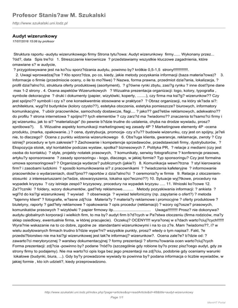 Profesor Stanis?aw M. Szukalski http://www.szukalski.uni.lodz.pl Audyt wizerunkowy 17/07/2016 15:06 by profesor Struktura raportu -audytu wizerunkowego firmy Strona tytu?owa: Audyt wizerunkowy firmy...... Wykonany przez... ?ód?, data Spis tre?ci 1. Streszczenie kierownicze ? przedstawiamy wszystkie kluczowe zagadnienia, które omawiane s? w audycie, ? przygotowywane jest na ko?cu sporz?dzania audytu, powinno by? krótkie 0,5-1,5 strony!!!!!!!!!!!!!. 2. Uwagi wprowadzaj?ce ? Kto sporz?dza, po co, kiedy, jakie metody pozyskania informacji (baza materia?owa)? 3. Informacje o firmie (przedmiocie oceny, o ile to mo?liwe) ? Nazwa, forma prawna, przedmiot dzia?ania, lokalizacja, ? profil dzia?alno?ci, struktura oferty produktowej (asortyment), ? g?ówne rynki zbytu, zasi?g rynku ? inne dost?pne dane max 1-2 strony . 4. Ocena aspektów Wizerunkowych ? Wizualna prezentacja organizacji: logo, kolory, typografia , symbole dekoracyjne ? druki i dokumenty (papier, wizytówki, koperty, ........), czy firma ma ksi?g? wizerunkow?? Czy jest spójno?? symboli i czy s? one konsekwentnie stosowane w praktyce? ? Obraz organizacji, na który sk?ada si?: architektura, wygl?d budynków (kolory czysto??), estetyka otoczenia, estetyka pomieszcze? biurowych, informatory komunikacyjne, ? ubiór pracowników, samochody dostawcze, flagi.... ? jako?? gad?etów reklamowych, adekwatno?? do profilu ? strona internetowa ? spójno?? tych elementów ? czy zarz?d ma ?wiadomo?? znaczenia to?samo?ci firmy i jej wizerunku, jak to si? "materializuje" (to pewnie b?dzie trudne do ustalenia, chyba na drodze wywiadu, prosz? spróbowa?). 5. Wizualne aspekty komunikacji marketingowej wg zasady 4P ? Marketingowe elementy 4P -ocena produktu, (marka, opakowanie..) ? cena, dystrybucja, promocja- czy s?u?? budowie wizerunku, czy jest on spójny, je?eli nie, to dlaczego? Ocena z punktu widzenia wizerunkowego 6. Obs?uga klienta, gwarancje, reklamacje, zwroty ? Czy istniej? procedury w tym zakresie? ? Zachowanie i kompetencje sprzedawców, przedstawicieli firmy, dystrybutorów, ? Ekspozycja stoisk, styl kontaktów podczas wystaw, spotka? biznesowych 7. Polityka PR, ? relacje z mediami (czy jest osoba do kontaktu) ? style, projekty notatek prasowych, ? komunikaty, serwisy fotograficzne ? konferencje prasowe, artyku?y sponsorowane ? zasady sponsoringu - kogo, dlaczego, w jakiej formie? Typ sponsoringu? Czy jest formalna umowa sponsoringowa? ? Organizacja wydarze? publicznych (jakie?) 8. Komunikacja wewn?trzna ? styl kierowania firm? i zasobami ludzkimi ? sposób komunikowania si? z pracownikami ? ?wiadczenia kafeteryjne ? informowanie pracowników o wydarzeniach, dost?pno?? raportów z dzia?alno?ci ? ceremonia?y w firmie 9. Relacje z otoczeniemstosunki z interesariuszami (w?adze, stowarzyszenia, lokalna spo?eczno??) 10. Sytuacje wyj?tkowe, procedury na wypadek kryzysu ? czy istnieje zespó? kryzysowy, procedury na wypadek kryzysu ..... 11. Wnioski ko?cowe 12. Za??czniki ? foldery, wzory dokumentów, gad?ety reklamowe.......... Metody pozyskiwania informacji: ? ankieta ? wgl?d do ksi?gi wizerunkowej ? wywiad ? obserwacja ? wywiad telefoniczny (np. zapytanie o ofert?) ? metoda "tajemny klient" ? fotografie, w?asne zdj?cia Materia?y ? materia?y reklamowe i promocyjne ? oferty produktowe ? biuletyny, raporty ? gad?ety reklamowe ? opakowania ? opis procedur (reklamacji) ? wzory og?osze? prasowych, komunikatów prasowych ? wizytówki ? papier firmowy itp.................................. Uwaga!!!!!!!!! Prosz? nie dokonywa? audytu globalnych korporacji i wielkich firm, to ma by? audyt firm b?d?cych w Pa?stwa otoczeniu (firma rodziców, ma?y sklep osiedlowy, ewentualnie firma, w której pracujecie). Oczekuj? OCENY!!!! wyra?onej w s?dach warto?ciuj?cych!!!!!! Wyra?nie wskazanie na to co dobre, zgodne ze standardami wizerunkowymi i na to co z?e. Mam ?wiadomo??, i? w wielu audytowanych firmach trudno b?dzie wype?ni? wszystkie punkty, prosz? wtedy o tym napisa?. Fakt, ?e przedsi?biorstwo nie ma ksi?gi wizerunkowej jest tak?e informacj? wizerunkow?. Ocena zale?e? b?dzie od: ? zawarto?ci merytorycznej ? warstwy dokumentacyjnej ? formy prezentacji ? sformu?owania ocen warto?ciuj?cych Forma prezentacji: zdj?cia -powinno by? podane ?ród?o (szczególnie gdy robione by?o przez pisz?cego audyt, gdy ze strony firmy to podajemy). Nie ma warto?ci opis loga bez jego prezentacji na zdj?ciu, podobnie gdy oceniamy warunki lokalowe (budynki, biura, ...). Gdy by?y prowadzone wywiady to powinna by? podana informacja o liczbie wywiadów, w jakiej formie , kto ich udzieli?, kiedy przeprowadzono. http://www.szukalski.uni.lodz.pl/index.php?page=articles&op=readArticle&id=48&title=audyt-wizerunkowy Page 1/1 MemHT Portal