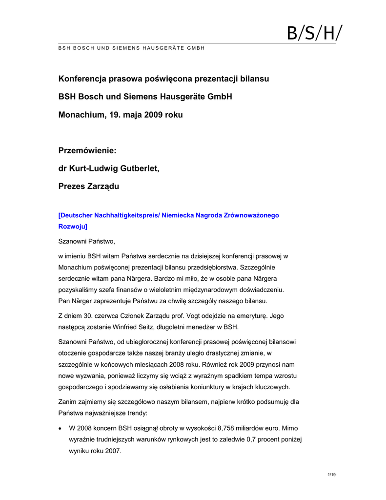 H BSH BOSCH UND SIEMENS HAUSGERÄ TE GMBH Konferencja prasowa poświęcona prezentacji bilansu BSH Bosch und Siemens Hausgeräte GmbH Monachium, 19. maja 2009 roku Przemówienie: dr Kurt-Ludwig Gutberlet, Prezes Zarządu [Deutscher Nachhaltigkeitspreis/ Niemiecka Nagroda ZrównowaŜonego Rozwoju] Szanowni Państwo, w imieniu BSH witam Państwa serdecznie na dzisiejszej konferencji prasowej w Monachium poświęconej prezentacji bilansu przedsiębiorstwa. Szczególnie serdecznie witam pana Närgera. Bardzo mi miło, Ŝe w osobie pana Närgera pozyskaliśmy szefa finansów o wieloletnim międzynarodowym doświadczeniu. Pan Närger zaprezentuje Państwu za chwilę szczegóły naszego bilansu. Z dniem 30. czerwca Członek Zarządu prof. Vogt odejdzie na emeryturę. Jego następcą zostanie Winfried Seitz, długoletni menedŜer w BSH. Szanowni Państwo, od ubiegłorocznej konferencji prasowej poświęconej bilansowi otoczenie gospodarcze takŜe naszej branŜy uległo drastycznej zmianie, w szczególnie w końcowych miesiącach 2008 roku. RównieŜ rok 2009 przynosi nam nowe wyzwania, poniewaŜ liczymy się wciąŜ z wyraźnym spadkiem tempa wzrostu gospodarczego i spodziewamy się osłabienia koniunktury w krajach kluczowych. Zanim zajmiemy się szczegółowo naszym bilansem, najpierw krótko podsumuję dla Państwa najwaŜniejsze trendy: • W 2008 koncern BSH osiągnął obroty w wysokości 8,758 miliardów euro. Mimo wyraźnie trudniejszych warunków rynkowych jest to zaledwie 0,7 procent poniŜej wyniku roku 2007. 1/19 H BSH BOSCH UND SIEMENS HAUSGERÄ TE GMBH • BSH udało się jeszcze bardziej umocnić swoją pozycję w Niemczech i Europie Zachodniej. • BSH zwiększyła swoje obroty na rynkach wschodzących Europy Wschodniej i Azji oraz w Australii i Kanadzie. • BSH odniosła większe korzyści niŜ konkurenci dzięki wprowadzeniu szerokiego portfolio produktów energooszczędnych. • BSH od lat utrzymuje na stałym poziomie zatrudnienie w Niemczech, który wynosi ok. 14.000 osób. • I na zakończenie, jeszcze coś, co wprawdzie nie ma bezpośredniego wpływu na nasz bilans, ale jesteśmy z tego szczególnie dumni: BSH została pod koniec ubiegłego roku odznaczona – nadawaną po raz pierwszy pod patronatem Prezydenta Niemiec Horsta Köhlera – Niemiecką Nagrodą ZrównowaŜonego Rozwoju. Konsekwentne zarządzanie z uwzględnieniem problematyki zrównowaŜonego rozwoju na kaŜdym etapie tworzenia wartości dodanej w BSH przekonało cały skład jury i wybrało nas na jako „Przedsiębiorstwo najbardziej dbające o zrównowaŜony rozwój w Niemczech“ spośród 350 kandydatów – w tym ponad połowę stanowiły przedsiębiorstwa giełdowe wchodzące w skład indeksu giełdowego DAX 30. Szanowni Państwo, poniŜej wskaŜę, jak zmieniał się w ubiegłym roku światowy rynek sprzętu gospodarstwa domowego i naszkicuję na tym tle obraz BSH. [Marktvolumen weltweiter Hausgerätemarkt / Wielkość światowego rynku sprzętu gospodarstwa domowego] Rozwój światowego rynku sprzętu gospodarstwa domowego Szanowni Państwo, światowy rynek sprzętu gospodarstwa domowego, ma wielkość około 95 miliardów euro – w tym sprzęt mały i duŜy. 2/19 H BSH BOSCH UND SIEMENS HAUSGERÄ TE GMBH Niestety kryzys rynków finansowych i jego rozszerzanie się od połowy roku 2008 wywarły wpływ takŜe na przemysł dóbr konsumpcyjnych, a tym samym takŜe na branŜę sprzętu AGD. Skutkiem tego na większości rynków osłabła konsumpcja wynikająca z wstrzymywania się od zakupów. Równolegle kryzys na rynku nieruchomości szczególnie boleśnie dotknął branŜę sprzętów do zabudowy. Spadek cen surowców pod koniec roku przyniósł tylko lekką poprawę. W efekcie w ujęciu całościowym, w wielu regionach świata odnotowano znaczny spadek – w niektórych nawet powaŜne załamanie – sprzedaŜy AGD. [Marktentwicklung Hausgeräte Welt/ Rozwój światowego rynku sprzętu gospodarstwa domowego] W bardziej szczegółowym ujęciu wygląda to tak: • Rynek niemiecki w roku 2008 był jeszcze stosunkowo stabilny. Łącznie liczba sprzedanego sprzętu osiągnęła ok. 16 milionów sztuk duŜego AGD i 62 miliony małego AGD. Był to mniej więcej poziom roku 2007. Wartościowo rynek wzrósł o 3 procent, poniewaŜ nadal utrzymywał się trend kupowania urządzeń wysokiej jakości z segmentu premium, w szczególności energooszczędnych. • Za wyjątkiem Francji, która wykazała jeszcze niewielki pozytywny trend, na niemal wszystkich innych waŜnych rynkach Europy Zachodniej zanotowano spadki sprzedaŜy, a w niektórych krajach nawet znaczne. Szczególnie w Wielkiej Brytanii, Włoszech, Skandynawii oraz Hiszpanii, gdzie budownictwo w ubiegłym roku doznało silnej zapaści, a popyt spadł nawet o wartość dwucyfrową. Na negatywny rozwój sytuacji w Wielkiej Brytanii dodatkowo miało wpływ osłabienie funta. • Natomiast wyraźnie pozytywny rozwój odnotowały w roku 2008 rynki Europy Wschodniej. Szczególnie Rosja i Polska, podobnie jak w latach poprzednich, odnotowały ponadprzeciętne wskaźniki wzrostu. JednakŜe w drugiej połowie roku w obu tych krajach zauwaŜono pierwsze symptomy spowolnienia gospodarek. • Łącznie w roku 2008 w Europie włącznie z Turcją i Rosją odnotowano wartościowo spadek rynku licząc w euro rzędu 3 procent. 3/19 H BSH BOSCH UND SIEMENS HAUSGERÄ TE GMBH Co się działo w regionach poza Europą? • W związku z dalszym zaostrzeniem kryzysu na rynku nieruchomości w USA popyt na sprzęt gospodarstwa domowego spadał jeszcze bardziej niŜ w roku poprzednim. Znaczne ograniczenie popytu odczuwalne było zwłaszcza w bardzo uzaleŜnionym od budownictwa mieszkaniowego sprzęcie do zabudowy. Z powodu słabego dolara cały rynek sprzętu AGD w USA odnotował w roku 2008 wartościowo licząc w euro spadek obrotów w wysokości 11 procent. • W Ameryce Łacińskiej rynek AGD skurczył się w ubiegłym roku o ok. 2 procent. • Podczas gdy w chińskich mias