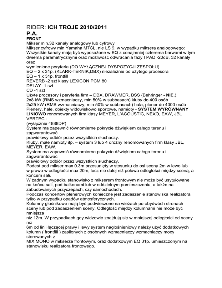 RIDER: ICH TROJE 2010/2011 P.A. FRONT Mikser min.32 kanały analogowy lub cyfrowy Mikser cyfrowy min Yamaha M7CL, nie LS 9, w wypadku miksera analogowego: Wszystkie kanały mają być wyposażone w EQ z conajmniej czterema barwami w tym dwiema parametrycznymi oraz możliwość odwracania fazy I PAD -20dB, 32 kanały oraz wymienione peryferia (DO WYŁĄCZNEJ DYSPOZYCJI ZESPOŁU) EQ – 2 x 31p. (KLARK-TEKNIK,DBX) niezależnie od użytego procesora EQ – 1 x 31p. frontfill REVERB -2 szt klasy LEXICON PCM 80 DELAY -1 szt CD -1 szt Użyte procesory i peryferia firm – DBX, DRAWMER, BSS (Behringer - NIE.) 2x8 kW (RMS wzmacniaczy, min 50% w subbasach) kluby do 400 osób 2x25 kW (RMS wzmacniaczy, min 50% w subbasach) hala, plener do 4000 osób Plenery, hale, obiekty widowiskowo sportowe, namioty - SYSTEM WYRÓWNANY LINIOWO renomowanych firm klasy MEYER, L’ACOUSTIC, NEXO, EAW, JBL VERTEC (wyłącznie 4888DP) System ma zapewnić równomierne pokrycie dźwiękiem całego terenu i zagwarantować prawidłowy odbiór przez wszystkich słuchaczy. Kluby, małe namioty itp. – system 3 lub 4 drożny renomowanych firm klasy JBL, MEYER, EAW. System ma zapewnić równomierne pokrycie dźwiękiem całego terenu i zagwarantować prawidłowy odbiór przez wszystkich słuchaczy. Podest pod mikser max 0.3m przesunięty w stosunku do osi sceny 2m w lewo lub w prawo w odległości max 20m, lecz nie dalej niż połowa odległości między sceną, a końcem sali. W żadnym wypadku stanowisko z mikserem frontowym nie może być usytułowane na końcu sali, pod balkonami lub w oddzielnym pomieszczeniu, a także na zabudowanych przyczepach, czy samochodach. Podczas koncertów plenerowych konieczne jest zadaszenie stanowiska realizatora tylko w przypadku opadów atmosferycznych. Kolumny głośnikowe mają być podwieszone na wieżach po obydwóch stronach sceny lub pod zadaszeniem sceny. Odległość między kolumnami nie może być mniejsza niż 12m. W przypadkach gdy widzowie znajdują się w mniejszej odległości od sceny niż 6m od linii łączącej prawy i lewy system nagłośnieniowy należy użyć dodatkowych kolumn ( frontfill ) zasilonych z osobnych wzmacniaczy wzmacniaczy mocy sterowanych z MIX MONO w mikserze frontowym, oraz dodatkowym EQ 31p. umieszczonym na stanowisku realizatora frontowego. MONITOR Mikser monitorowy analogowy, lub cyfrowy (nie Yamaha O1 i mniejsze) minimum 24 kanały EQ – 31p – 10 szt Monitory 600W – 10szt nisko profilowe 12’+1’ lub 12’+2’ Drumfill min.800W - 1 szt Sidefill x4 - 2 z przodu sceny 2 miedzy linią muzyków a frontem sceny każdy min 1,5kW Mikser monitorowy umieszczony poza sceną SCENA Minimalne wymiary sceny 10X10m wys. 1.2m Scena i zadaszenie powinno zagwarantować prawidłowy występ zespołu w każdych warunkach atmosferycznych. Podest pod perkusję i klawisze ( wspólny ) 6X2.5m wys. 0.5m Front i boki sceny, oraz podestu pod perkusję powinny być wysłonięte czarnym materiałem. ZASILANIE Minimalne napięcie zasilania przy pełnym obciążeniu 230V OBSŁUGA 1 osoba przy stanowisku realizatora znająca system 1 realizator monitorów 1 technik sceny 1 realizator światła 1 osoba do obsługi spota 1 osoba odpowiedzialna za przyłącze energetyczne W przypadku koncertów plenerowych, odpowiednia ochrona sceny, oraz min 2 osoby przy stanowisku realizatora. Zespół jest w stanie zapewnić całościowe nagłośnienie imprezy, osobne negocjacje cenowe Janusz Baka www.actionsound.pl [email protected] Rider jest załącznikiem do umowy, wszelkie zmiany sprzętowe muszą być konsultowane Janusz Baka 0602 28 70 21, [email protected] Wszystkie ustalenia niezależnie od kontaktu telefonicznego proszę przesłać mailem INPUT LIST: ICH TROJE 2010/2011 1 Kick Beta 52 gate 2 Sn up SM 57 3 Sn down SM 57 4 H/H Rode NT 5 5 1 tom E 604 gate 6 2 tom E 604 gate 7 3 tom E 604 gate 8 O-H Rode NT 5 9 O-H Rode NT 5 10 BAS XLR comp 11 GTR SM 57 12 AC GTR XLR comp 13 KEY L di-box 14 KEY P di-box 15 Mini disc 1 mono di-box cinch 16 Mini disc 2 L di-box cinch 17 Mini disc 2 P di-box cinch 18 SAX XLR comp 19 VOC SM 58 comp 20 VOC SM 58 comp 21 VOC SM 58 comp 22 VOC SM 58 comp 23 Reverb 1 L 24 Reverb 1 R 25 Reverb 2 L 25 Reverb 2 P 27 tap delay L 28 tap delay P wireless wireless wireless wireless Rider jest załącznikiem do umowy, wszelkie zmiany sprzętowe muszą być konsultowane Janusz Baka 0602 28 70 21, [email protected] Wszystkie ustalenia niezależnie od kontaktu telefonicznego proszę przesłać mailem MONITORY: ICH TROJE 2010/2011 10 torów monitorowych 1 voc 2 voc 3 voc 4 sidefill przedni 5 sidefill tylni 6 key2 7 gtr 8 bas 9 key1 10 drums Rider jest załącznikiem do umowy, wszelkie zmiany sprzętowe muszą być konsultowane Janusz Baka 0602 28 70 21, [email protected] Wszystkie ustalenia niezależnie od kontaktu telefonicznego proszę przesłać mailem