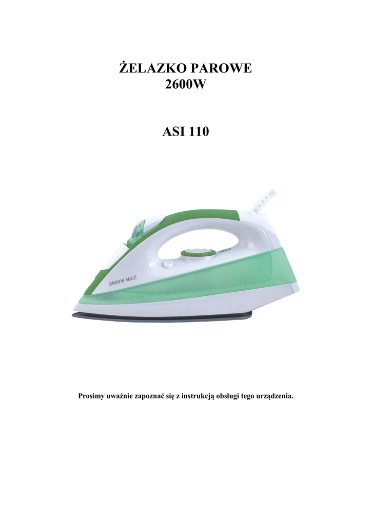ŻELAZKO PAROWE 2600W ASI 110 Prosimy uważnie zapoznać się z instrukcją obsługi tego urządzenia. 1. ŚRODKI OSTROŻNOŚCI Podczas używania urządzeń elektrycznych, podstawy bezpieczeństwa powinny zawsze zostać zachowane, wg. poniższych: PRZECZYTAJ WSZYSTKIE PODPUNKTY Jeśli kabel zasilający został uszkodzony, musi zostać wymieniony przez producenta, bądź autoryzowany serwis, czy też inne wykwalifikowane osoby. Nigdy nie pozostawiaj urządzenia w zasięgu dzieci, gdy nie jest ono pilnowane. Wtyczka musi zostać usunięta z gniazdka, przed umieszczeniem w żelazku wody. Nigdy nie korzystaj z urządzenia, gdy nie pracuje ono poprawnie, zostało upuszczone lub gdy zauważona została jakakolwiek usterka. Nie próbuj wyciągać urządzenia, które wpadło do wody, bądź do innych płynów. Żelazko powinno stać na twardej, stabilnej powierzchni. Powinna zostać zachowana szczególna uwaga, urządzenie emituje gorącą pare. Nie dotykaj gorących powierzchni. Korzystaj z pokręteł. By uchronić się przed niebezpieczeństwem porażenia prądem, nie zanurzaj urządzenia, bądź żadnej z jego części w wodzie, czy też innych płynach. Urządzenie powinno zostać odłączone od zasilania przed rozpoczęciem czyszczenia. Pozwól mu ostygnąć nim rozpoczniesz czyszczenie. Korzystanie z dodatków nie zalecanych przez producenta może grozić urazem. Nie używaj poza domem. Nie pozwól, by przewód zwisał luźno ze stołu, bądź dotykał gorących powierzchni. Nie umieszczaj urządzenia w pobliżu źródeł ciepła, np. kuchenki. By odłączyć urządzenie, wyciągnij wtyczkę z gniazdka. Pozwól, by urządzenie ostygło. Zwiń kabel luźno na czas przechowywania. Dotykanie nagrzanych części urządzenia bądź pary, czy wody, może grozić poparzeniem. Zachowaj ostrożność przechylając urządzenie. Może wylać się z niego woda. Jeśli istnieje potrzeba wykorzystania przedłużki, wybierz tylko 10A. Urządzenie przeznaczone jest tylko do użytku domowego. Korzystaj z urządzenia tylko w sposób opisany w instrukcji. Urządzenie to nie jest przeznaczone dla ludzi (w tym dzieci) z obniżonymi zdolnościami manualnymi, psychicznymi i sensorycznymi, brakiem doświadczenia, bądź z brakiem wystarczającej wiedzy chyba, że korzystają z urządzenia pod nadzorem osób odpowiedzialnych za ich bezpieczeństwo. 2. WSKAZÓWKI PRZED UŻYCIEM Niektóre części żelazka mogą być pokryte powłoką. Może to być przyczyną wydobywania się niewielkich ilości dymu z urządzenia po włączeniu żelazka. Sytuacja ta powinna ustąpić po jakimś czasie. Przed pierwszym użyciem usuń wszelkie naklejki oraz folie z urządzenia miękką ściereczką. Utrzymuj powierzchnię prasującą żelazka w dobrej kondycji. Unikaj zarysowań przedmiotami takimi jak np. podstawka, guziki, zamki itp.) Ubrania z wełny (100% wełny) najlepiej prasować przez inną tkaninę. A. Dysza B. Wlew wody C. Regulator pary D. Przycisk uderzenia pary E. Przycisk spryskiwacza F. Ustawienia termostatu G. Zbiornik wody H. Wskaźnik zasilania I. Przycisk autoczyszczenia J. Stopa żelazka USTAWIANIE TEMPERATURY Zawsze sprawdzaj metkę prasowanych ubrań i umieszczone na niej oznaczenia. Kieruj się tymi oznaczeniami. Jeśli ubranie nie posiada metki, ale znasz materiał, z którego został wykonany, kieruj się tabelą podaną niżej. Odzież tekstylną i jej domieszki, należy prasować w niższych temperaturach. Posortuj odzież wg. temperatury prasowania: wełniane z wełnianymi, bawełna z bawełną itd. Żelazko nagrzewa się szybciej, niż stygnie. Zacznij więc od prasowania ubrań wymagających niższych temperaturę, np. ubrań z tworzywa sztucznego. Następnie przechodź do ubrań wymagających wyższej temperatury. Ustaw temperaturę przekręcając pokrętło na odpowiedni znacznik temperatury. PRASOWANIE SUCHE: 1. Przed uruchomieniem żelazka, proszę sklasyfikować ubrania, według metki. Początkowo należy prasować tkaniny na niższej temperaturze (np. tkaniny syntetyczne, jedwab itp.), a następnie prasować ubrania (np. z wełny, bawełny i lnu itp) o wyższej temperaturze. 2. Postaw żelazko na pod koniec prasowania, i obrócić pokrętło termostatu w pozycji MIN. PRASOWANIE NA PARZE Siła pary podczas prasowania umożliwia pozbycie się upornych fałdów na ubraniach. Wypełnij żelazko wodą. Wepnij wtyczkę do gniazdka. Pokrętło temperatury powinno zostać ustawione na poziom maksymalny, przy prasowaniu na mniejszych poziomach woda może wyciekać z żelazka. Ustaw pokrętło temperatury na temperaturę odpowiadającą danej tkaninie. Lampka kontrolna zgaśnie, gdy odpowiednia temperatura zostanie osiągnięta. Aby uwolnić strumień pary, ustaw jej regulację na pożądanym poziomie. Odczekaj kilka sekund, aż para skończy penetrować włókna tkaniny, by ponownie uwolnić kolejny strumień pary. Uwaga: Tkaniny syntetyczne, nylon, syntetyczny jedwab i jedwab nie może być prasowany z funkcją uderzenia pary, gdyż może to uszkodzić materiał. Uderzenie pary: Funkcja ta będzie w stanie zapewnić więcej pary, aby usunąć uporczywe zagniecenia. 1. Ustaw przycisk wybierania termostatu do pozycji MAX, aż wskaźnik zgaśnie. 2. Zwolnij parę naciskając przycisk kilkakrotnie. 3. Odczekaj chwilkę, tak żeby para mogła przeniknąć przez tkaninę, a następnie zwolnij przycisk. Uwaga: 1. Aby uzyskać najlepszą jakość prasowania przytrzymaj żelazko na tkaninie 2. Napełnij zbiornik wodą do pozycji MAX przed użyciem funkcji pary 3. W celu uniknięcia wycieku wody z żelazka, nie należy przytrzymywać przycisku pary dłużej niż 5 sekund. Metoda rozpylania: 1. Napełnij wodą zbiornik w żelazku. 2. Naciśnij przycisk spryskiwacza. 3. Uwaga: Bez względu na to, jaką metodę prasowania wybierzesz, funkcja spryskiwacza jest zawsze dostępna. Samooczyszczenie: Aby usunąć zabrudzenia i kurz, żelazko powinno być czyszczone co najmniej raz w miesiącu. 1. Wypełnij połowę zbiornik