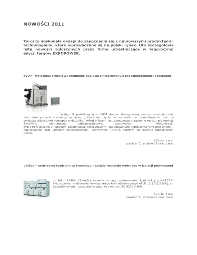 NOWOŚCI 2011 Targi to doskonała okazja do zapoznania się z najnowszymi produktami i technologiami, które wprowadzane są na polski rynek. Oto szczegółowa lista nowości zgłoszonych przez firmy uczestniczące w tegorocznej edycji targów EXPOPOWER. eVD4 - wyłącznik próŜniowy średniego napięcia zintegrowany z zabezpieczeniem i sensorami Wyłącznik próŜniowy typu eVD4 stanowi zintegrowany system zabezpieczenia sieci elektrycznych średniego napięcia, gotowy do uŜycia bezpośrednio po zainstalowaniu. Jest to ewolucja tradycyjnej koncepcji wyłącznika, której efektem jest pojedyncze urządzenie realizujące funkcje ZAŁ/WYŁ, pomiarowe, zabezpieczenowe, sterowania i komunikacji. eVD4 to wyłącznik z napędem zasobnikowo-spręŜynowym, zabudowanymi kombisensorami prądowymi i napięciowymi oraz układem zabezpieczenia i sterowania RBX615 opartym na rodzinie zabezpieczeń Relion. ABB sp. z o.o. pawilon 7, stoisko 29 oraz pasaŜ UniSec - wnętrzowa rozdzielnica średniego napięcia rozdziału wtórnego w izolacji powietrznej do 24kV, 1250A, 25kA(2s), wszechstronnego zastosowania. Spełnia kryteria LSC2APM, odporna na działanie wewnętrznego łuku elektrycznego AFLR 12,5/16/21kA(1s). Zaprojektowana i przebadana zgodnie z normą IEC 62271-200. ABB sp. z o.o. pawilon 7, stoisko 29 oraz pasaŜ ARS 00/100 mm pro rozłącznik izolacyjny bezpiecznikowy listwowy • • • • nowoczesny i funkcjonalny opatentowany system blokady pokrywy przyjazny dla uŜytkownika - nowa konstrukcja umoŜliwia intuicyjne manewrowanie rozłącznikiem wykonany z tworzywa o klasie palności V0 i CTI 600 V APATOR SA pawilon 7A, stoisko 4 RBK 1 pro - rozłącznik izolacyjny bezpiecznikowy skrzynkowy • • • • • • łączenie obciąŜeń indukcyjnych – kategoria uŜytkowania AC-23B, 250 A przy 690 V montaŜ na moście szynowym o rozstawie szyn 60 mm oraz 100 mm, przy pomocy zacisków hakowych system Apator 60 mm umoŜliwiający montowanie na jednym moście szynowym rozłączników wielkości 000, 00, 1 oraz 2 pełna ochrona przed dotykiem komory dejonizacyjne uzbrojone w metalowe płytki wykonany z tworzywa o klasie palności V0 i CTI 600 V APATOR SA pawilon 7A, stoisko 4 RBK 00 pro - rozłącznik izolacyjny bezpiecznikowy skrzynkowy • • • • • • • jednorodne tory prądowe – bezpośrednie zamocowanie rozłącznika na moście szynowym przy pomocy zacisków hakowych widoczne zablokowanie i odblokowanie ruchu suwaka otwory pomiarowe o duŜej średnicy Ø 7 mm, moŜliwość podłączenia dwóch końcówek kablowych do jednego zacisku, montaŜ na dwóch szynach TH-35 o rozstawie 125 mm lub 150 mm komory dejonizacyjne uzbrojone w metalowe płytki wykonany z tworzywa o klasie palności V0 i CTI 600V APATOR SA pawilon 7A, stoisko 4 Obudowy wykonane w technologii gięcia i frezowania Materiał z którego tworzona jest obudowa (ABS, PS, PC) moŜe mieć grubość od 2mm do 12mm. Materiał posiadają certyfikaty ognioodporności do UL94V0 włącznie. W zakresie uszlachetniania produktu oferujemy róŜne procesy takie jak lakierowanie, sitodruk, klawiatury lub folie, napisy grawerowane. Na Ŝyczenie montujemy całą elektronikę do obudowy wraz z akcesoriami. APRA-OptiNET Sp. z o.o. pawilon 7A, stoisko 42A Obudowa produkowana w technologii SYN-PRO SYN-Pro Tech jest to próŜniowa technologia odlewania produktów z tworzywa sztucznego stosowana do produkcji małych serii lub prototypów. Technologia Syn-Pro pozwala na uniknięcie niepotrzebnych kosztów związanych z budową narzędzia metalowego do wtrysku wysokociśnieniowego do kaŜdego projektu. Materiał: dwu częściowe silikonowe formy odlewcze, zatwierdzona przez FDA, odporność temperaturowa do 180° C, przezroczystość. Od materiałów bardzo miękkich przez gumo podobne i twarde po uderzenio odporne. Nietoksyczne ( moŜliwość wykorzystywania w przemyśle Ŝywieniowym ). MoŜliwość wybrania własnego indywidualnego koloru, lakierowania oraz nadruku. APRA-OptiNET Sp. z o.o. pawilon 7A, stoisko 42A Oplotowe złączki mostkujące BELOS-PLP PREFORMED Splice Shunt Sprawdzony sposób na stare połączenia prasowane w liniach elektroenergetycznych. Budowa: Druty spiralne ze spręŜystego stopu aluminium. Działanie: Odtworzenie wytrzymałości mechanicznej i elektrycznej elementu prasowanego na przewodzie AFL. Rekomendacja: Linia elektroenergetyczna 220kV Włocławek Azoty-Pątnów. 10 złączek mostkujących Splice Shunt wyeliminowało nagrzewanie się złączek zaprasowywanych. Ograniczono koszt i czas odtworzenia właściwości modernizowanej linii. BELOS-PLP S.A. pawilon 7, stoisko 25 Miernik parametrów ziemnozwarciowych typu KKZ Przeznaczony do pomiarów parametrów doziemnych w skompensowanych sieciach średnich napięć. Miernik zastępuje metodę rzeczywistego zwarcia doziemnego w sieci stosowaną obecnie w praktyce eksploatacyjnej. UmoŜliwia bowiem w przeciwieństwie do tej metody pomiar wielkości charakterystycznych bez konieczności wyłączania linii i wprowadzania do niej zakłóceń. Działa w oparciu o metody, w których sygnały pomiarowe uzyskuje się w wyniku chwilowego włączenia w obwody doziemne sieci dodatkowego źródła energii. Wspomniany impuls jest wytwarzany przez transformator wymuszający BTW i układu pomiarowego. W układzie pracy pod napięciem dokonywane są odpowiednie pomiary, które przekazywane są części mikroprocesorowej ulokowanej wewnątrz pomieszczeń stacji (np. w nastawni). Informacje uzyskiwane za pomocą miernika wykorzystywane są przede wszystkim do bieŜącej oceny dostrojenia dławika kompensującego. Uniwersalność zastosowanego w KKZ sterownikowa pozwala zastosować miernik jako element kontrolno sterujący w sieciach wyposaŜonych w dławiki z automatyczną regulacją. BEZPOL Przedsiębiorstwo produkcyjne pawilon 7A, stoisko 29 DEHNventil M TNS Ogranicznik kombinowany na bazie iskierników składający się z podstawy i wymiennych modułów ochronnych. Opatentowana technol