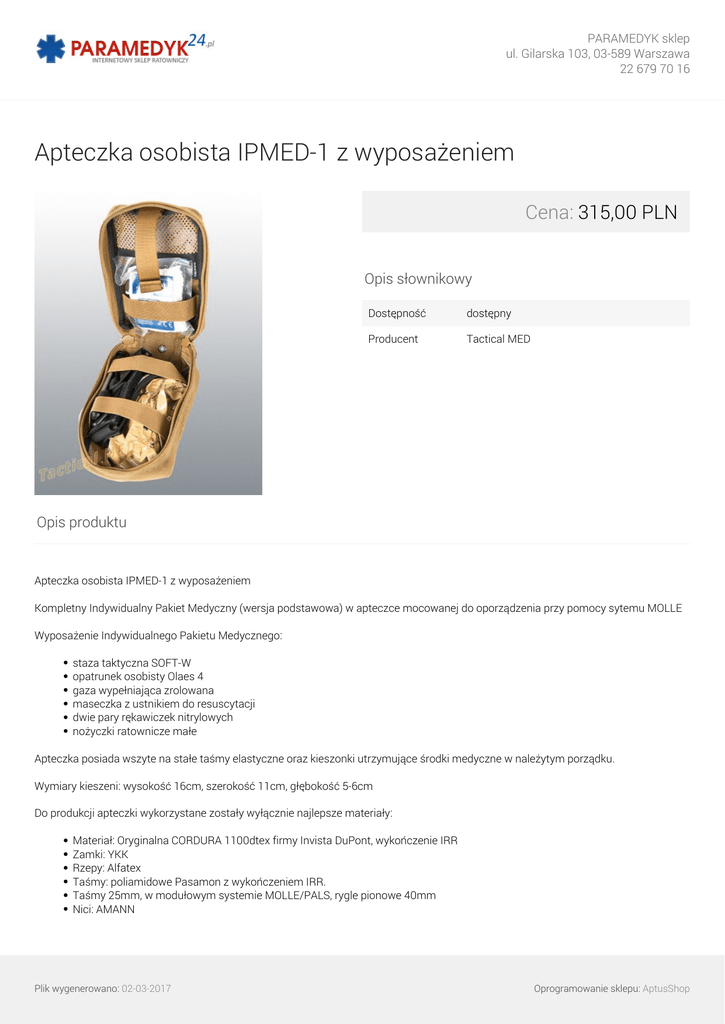 PARAMEDYK sklep ul. Gilarska 103, 03-589 Warszawa 22 679 70 16 Apteczka osobista IPMED-1 z wyposażeniem Cena: 315,00 PLN Opis słownikowy Dostępność dostępny Producent Tactical MED Opis produktu Apteczka osobista IPMED-1 z wyposażeniem Kompletny Indywidualny Pakiet Medyczny (wersja podstawowa) w apteczce mocowanej do oporządzenia przy pomocy sytemu MOLLE Wyposażenie Indywidualnego Pakietu Medycznego: staza taktyczna SOFT-W opatrunek osobisty Olaes 4 gaza wypełniająca zrolowana maseczka z ustnikiem do resuscytacji dwie pary rękawiczek nitrylowych nożyczki ratownicze małe Apteczka posiada wszyte na stałe taśmy elastyczne oraz kieszonki utrzymujące środki medyczne w należytym porządku. Wymiary kieszeni: wysokość 16cm, szerokość 11cm, głębokość 5-6cm Do produkcji apteczki wykorzystane zostały wyłącznie najlepsze materiały: Materiał: Oryginalna CORDURA 1100dtex firmy Invista DuPont, wykończenie IRR Zamki: YKK Rzepy: Alfatex Taśmy: poliamidowe Pasamon z wykończeniem IRR. Taśmy 25mm, w modułowym systemie MOLLE/PALS, rygle pionowe 40mm Nici: AMANN Plik wygenerowano: 02-03-2017 Oprogramowanie sklepu: AptusShop PARAMEDYK sklep ul. Gilarska 103, 03-589 Warszawa 22 679 70 16 Dostępne kolory apteczki: czarny, coyote brown Recenzja apteczki na blogu equipped.pl Parametry Kolor apteczki coyote brown Galeria Plik wygenerowano: 02-03-2017 Oprogramowanie sklepu: AptusShop PARAMEDYK sklep ul. Gilarska 103, 03-589 Warszawa 22 679 70 16 Plik wygenerowano: 02-03-2017 Powered by TCPDF (www.tcpdf.org) Oprogramowanie sklepu: AptusShop
