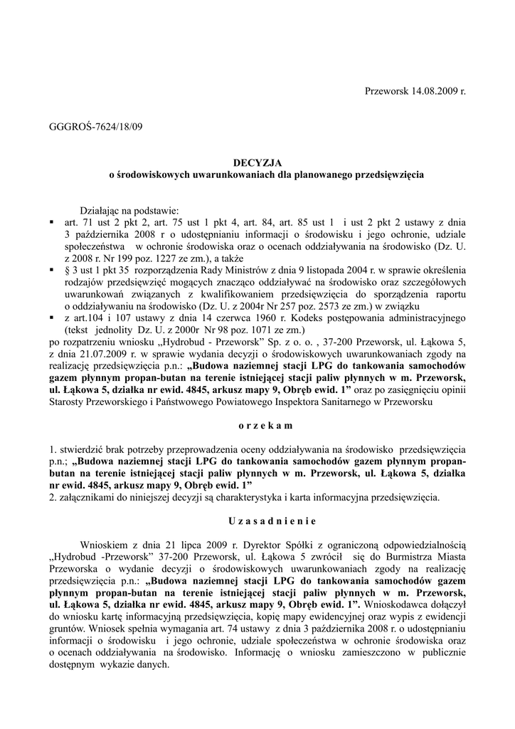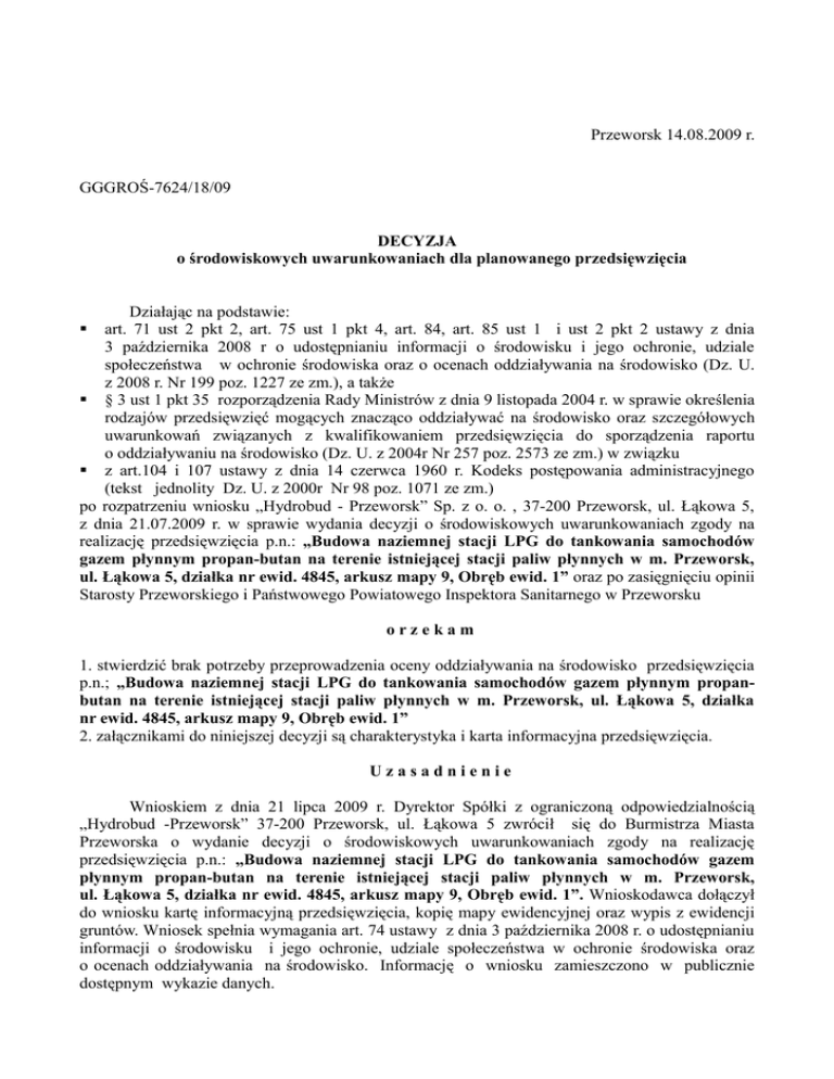 Przeworsk 14.08.2009 r. GGGROŚ-7624/18/09 DECYZJA o środowiskowych uwarunkowaniach dla planowanego przedsięwzięcia Działając na podstawie: art. 71 ust 2 pkt 2, art. 75 ust 1 pkt 4, art. 84, art. 85 ust 1 i ust 2 pkt 2 ustawy z dnia 3 października 2008 r o udostępnianiu informacji o środowisku i jego ochronie, udziale społeczeństwa w ochronie środowiska oraz o ocenach oddziaływania na środowisko (Dz. U. z 2008 r. Nr 199 poz. 1227 ze zm.), a także § 3 ust 1 pkt 35 rozporządzenia Rady Ministrów z dnia 9 listopada 2004 r. w sprawie określenia rodzajów przedsięwzięć mogących znacząco oddziaływać na środowisko oraz szczegółowych uwarunkowań związanych z kwalifikowaniem przedsięwzięcia do sporządzenia raportu o oddziaływaniu na środowisko (Dz. U. z 2004r Nr 257 poz. 2573 ze zm.) w związku z art.104 i 107 ustawy z dnia 14 czerwca 1960 r. Kodeks postępowania administracyjnego (tekst jednolity Dz. U. z 2000r Nr 98 poz. 1071 ze zm.) po rozpatrzeniu wniosku „Hydrobud - Przeworsk” Sp. z o. o. , 37-200 Przeworsk, ul. Łąkowa 5, z dnia 21.07.2009 r. w sprawie wydania decyzji o środowiskowych uwarunkowaniach zgody na realizację przedsięwzięcia p.n.: „Budowa naziemnej stacji LPG do tankowania samochodów gazem płynnym propan-butan na terenie istniejącej stacji paliw płynnych w m. Przeworsk, ul. Łąkowa 5, działka nr ewid. 4845, arkusz mapy 9, Obręb ewid. 1” oraz po zasięgnięciu opinii Starosty Przeworskiego i Państwowego Powiatowego Inspektora Sanitarnego w Przeworsku orzekam 1. stwierdzić brak potrzeby przeprowadzenia oceny oddziaływania na środowisko przedsięwzięcia p.n.; „Budowa naziemnej stacji LPG do tankowania samochodów gazem płynnym propanbutan na terenie istniejącej stacji paliw płynnych w m. Przeworsk, ul. Łąkowa 5, działka nr ewid. 4845, arkusz mapy 9, Obręb ewid. 1” 2. załącznikami do niniejszej decyzji są charakterystyka i karta informacyjna przedsięwzięcia. Uzasadnienie Wnioskiem z dnia 21 lipca 2009 r. Dyrektor Spółki z ograniczoną odpowiedzialnością „Hydrobud -Przeworsk” 37-200 Przeworsk, ul. Łąkowa 5 zwrócił się do Burmistrza Miasta Przeworska o wydanie decyzji o środowiskowych uwarunkowaniach zgody na realizację przedsięwzięcia p.n.: „Budowa naziemnej stacji LPG do tankowania samochodów gazem płynnym propan-butan na terenie istniejącej stacji paliw płynnych w m. Przeworsk, ul. Łąkowa 5, działka nr ewid. 4845, arkusz mapy 9, Obręb ewid. 1”. Wnioskodawca dołączył do wniosku kartę informacyjną przedsięwzięcia, kopię mapy ewidencyjnej oraz wypis z ewidencji gruntów. Wniosek spełnia wymagania art. 74 ustawy z dnia 3 października 2008 r. o udostępnianiu informacji o środowisku i jego ochronie, udziale społeczeństwa w ochronie środowiska oraz o ocenach oddziaływania na środowisko. Informację o wniosku zamieszczono w publicznie dostępnym wykazie danych. Zgodnie z art. 173 ust 1 i 2 ustawy o udostępnianiu informacji o środowisku i jego ochronie, udziale społeczeństwa w ochronie środowiska oraz o ocenach oddziaływania na środowisko/ Dz. U. z 2008 r. Nr 199 poz. 1227 ze zm./, w związku z § 3 ust 1 pkt 35 utrzymanego w mocy nie dłużej niż do 15 listopada 2010 r. rozporządzenia Rady Ministrów z dnia 9 listopada 2004 r. w sprawie określenia rodzajów przedsięwzięć mogących oddziaływać na środowisko oraz szczegółowych uwarunkowań związanych z kwalifikowaniem przedsięwzięcia do sporządzenia raport o oddziaływaniu na środowisko /Dz. U. z 2004r Nr 257 poz. 2573 ze zm./ inwestycja ta zaliczana jest do przedsięwzięć mogących potencjalnie znacząco oddziaływać na środowisko, dla których przeprowadzenie oceny oddziaływania na środowisko może być wymagane. Katalog przedsięwzięć, których realizacja wymaga lub może wymagać sporządzania raportu o oddziaływaniu przedsięwzięcia na środowisko określają przepisy rozporządzenia Rady Ministrów z dnia 9 listopada 2004 r. w sprawie określenia rodzajów przedsięwzięć mogących znacząco oddziaływać na środowisko oraz szczegółowych uwarunkowań związanych z kwalifikowaniem przedsięwzięcia do sporządzenia raportu o oddziaływaniu na środowisko (Dz.U. Nr 259, poz. 2573 z późn. zm.). W świetle przedmiotowego aktu prawnego obowiązkiem fakultatywnym do sporządzenia raportu oddziaływania na środowisko jest planowanie przedsięwzięcia dla instalacji do magazynowania lub dystrybucji ropy naftowej, produktów naftowych lub substancji chemicznych, nie wymienionych w § 2 ust. 1 pkt 22, z wyłączeniem stacji paliw na gaz płynny ( § 3 ust. 1 pkt 35). W myśl art. 71 w/w ustawy o udostępnianiu informacji o środowisku i jego ochronie, udziale społeczeństwa w ochronie środowiska oraz o ocenach oddziaływaniu na środowisko realizacja planowanego przedsięwzięcia mogącego potencjalnie znacząco oddziaływać na środowisko jest dopuszczalna wyłącznie po uzyskaniu decyzji o środowiskowych uwarunkowaniach zgody na realizację przedsięwzięcia. Zgodnie z art. 75 cytowanej wyżej ustawy organem właściwym do rozpoznania przedmiotowej sprawy jest Burmistrz Miasta Przeworska. Zawiadomieniem z dnia 22.07.2009 r. powiadomiono strony postępowania o jego wszczęciu. Na podstawie art. 64 ust 1 pkt 1 i 2 ustawy z dnia 3 października 2008 r. o udostępnianiu informacji o środowisku i jego ochronie, udziale społeczeństwa w ochronie środowiska oraz o ocenach oddziaływania na środowisko / Dz. U. z 2008 r. Nr 199 poz. 1227/, organ prowadzący postępowanie wystąpił do Starosty Przeworskiego w Przeworsku oraz do Państwowego Powiatowego Inspektora Sanitarnego w Przeworsku o opinię w przedmiocie stwierdzenia obowiązku przeprowadzenia oceny oddziaływania na środowisko dla planowanego przedsięwzięcia. Pismem z dnia 27.06.2009 r. (data wpływu 29.07.2009 r.) znak PSNZ.465-39/09 Państwowy Powiatowy Inspektor Sanitarny w Przeworsku wyraził opinie, że w przedmiotowej sp