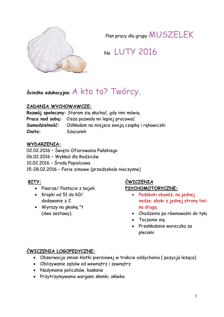 Plan pracy dla grupy Na Ścieżka edukacyjna: MUSZELEK LUTY 2016 A kto to? Twórcy. ZADANIA WYCHOWAWCZE: Rozwój społeczny: Staram się słuchać, gdy inni mówią Praca nad sobą: Cisza pozwala mi lepiej pracować Samodzielność: Odkładam na miejsce swoją czapkę i rękawiczki Cnota: Szacunek WYDARZENIA: 02.02.2016 – Święto Ofiarowania Pańskiego 06.02.2016 – Wykład dla Rodziców 10.02.2016 – Środa Popielcowa 15-28.02.2016 – Ferie zimowe (przedszkole nieczynne) BITY: Pisarze/ Postacie z bajek. Kropki od 51 do 60/ dodawanie z 2. Wyrazy na głoskę ”t (dwa zestawy). ĆWICZENIA PSYCHOMOTORYCZNE: Podskoki obunóż, na jednej nodze, skoki z jednej strony linii na drugą Chodzenie po równoważni do tyłu Toczenie się Przekładanie woreczka za plecami ĆWICZENIA LOGOPEDYCZNE: Obserwacja zmian klatki piersiowej w trakcie oddychania ( pozycja leżąca) Oblizywanie zębów od wewnątrz i zewnątrz Nadymanie policzków, kasłanie Przytrzymywanie wargami słomki, ołówka 1 WIERSZ: „Wynalazki” M. Przewoźniak Kto wynalazł żagiel, koło, papier, zegar i maszynę? Wynalazców mądre grono coś nowego wciąż wyczynia. Tyle możliwości mamy dzięki mądrym wynalazkom: i jeździmy, i latamy, mamy radio i żelazko. Może wy coś wymyślicie, czego dzieci oczekują? Dom, co jeździ sam po świecie, lub parasol przeciw dwójom? WIERSZ LOGOPEDYCZNY: Bi-bi, bi-bi, mam bibułki, a w nich małe ładne bułki. Obie-obie-obie, bułki te dam Tobie, ubi-ubi, ubi-ubi, albo komuś kto je lubi. PIOSENKI: „Sanna” (sł. B. Kossuht, muz. A. Markiewicz) 1. Zima, zima, zima pada, pada śnieg. Jadę, jadę w świat sankami, sanki dzwonią dzwoneczkami: Dzyń, dzyń, dzyń, dzyń, dzyń, dzyń. 2. Jaka pyszna sanna, parska raźno koń. Śnieg rozbija kopytami, sanki dzwonią dzwoneczkami: Dzyń, dzyń, ... dzwoneczkami: Dzyń, dzyń, .. 3. Zasypane pola, w śniegu cały świat. Biała droga hen, przed nami, sanki dzwonią 2 ZAGADKI: Dwa łasuchy tym się szczycą , że wygrały z czarownicą. (Jaś i Małgosia) Kto listy pisać chciał drobnym maczkiem i po co raz kupił maczku paczkę? (Kaczka Dziwaczka) Zgubiła pantofelek, gdy na balu była, gdy książę ją odnalazł macochę opuściła. (Kopciuszek) Chłopiec z bajki znany, z drewna wystrugany. Kiedy kłamał w głos strasznie rósł mu nos. (Pinokio) W chatce krasnoludków mieszka prześliczna królewna… (Śnieżka) AUDYCJE: Antoni Dvorak _ „Humoreska” Jan Sebastian Bach – Preludium z I suity wiolonczelowej JĘZYK ANGIELSKI: TEMATY SŁOWNICTWO I GRAMATYKA BITY Colors Blue – trousers, ink, blueberries, whale, sky, river Green – crocodile, frog, cabbage, peas, Christmas tree, cucumber Yellow – daffodils, cheese, duck, corn, sun, lemon Black – spider, stones, blackboard, cat, staff, mulberry Brown – closet, cookie, nut, chocolate, log, teddy bear Colors Food Numbers 1-50 Body 3 Food Sandwich, cheese, blue cheese, ketchup, olives, mayonnaise, pizza, chilli peppers, tomatoes, eggs, salami, pineapple, garlic, cucumber, fish, red pepper, mushrooms, rocket, cream, ham, pickle, honey, orange, broccoli Body Eyes, nose, ears, arms, legs, paws ♫SONGS♫ My teddy bear ♫ My teddy bear has two eyes, two eyes, two eyes. My teddy bear has two eyes. I love my teddy bear. My teddy bear has one nose, one nose, one nose. My teddy bear has one nose. I love my teddy bear. My teddy bear has two ears, two ears, two ears. My teddy bear has two ears. I love my teddy bear. My teddy bear has two arms, two arms, two arms. My teddy bear has two arms. I love my teddy bear. My teddy bear has two legs, two legs, two legs. My teddy bear has two legs. I love my teddy bear. My teddy bear has four paws, four paws, four paws. My teddy bear has four paws. I love my teddy bear. 4 5