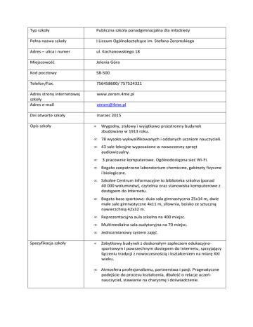Typ szkoły Publiczna szkoła ponadgimnazjalna dla młodzieży Pełna nazwa szkoły I Liceum Ogólnokształcące im. Stefana Żeromskiego Adres – ulica i numer ul. Kochanowskiego 18 Miejscowość Jelenia Góra Kod pocztowy 58-500 Telefon/Fax. 756458600/ 757524321 Adres strony internetowej szkoły Adres e-mail www.zerom.4me.pl Dni otwarte szkoły marzec 2015 Opis szkoły Specyfikacja szkoły [email protected] • Wygodny, stylowy i wyjątkowo przestronny budynek zbudowany w 1913 roku. • 78 wysoko wykwalifikowanych i oddanych uczniom nauczycieli. • 43 sale lekcyjne wyposażone w nowoczesny sprzęt audiowizualny. • 3 pracownie komputerowe. Ogólnodostępna sieć Wi-Fi. • Bogato zaopatrzone laboratorium chemiczne, gabinety fizyczne i biologiczne. • Szkolne Centrum Informacyjne to biblioteka szkolna (ponad 40 000 woluminów), czytelnia oraz stanowiska komputerowe z dostępem do Internetu. • Bogata baza sportowa: duża sala gimnastyczna 25x14 m, dwie małe sale gimnastyczne 4x11 m, siłownia, boisko ze sztuczną nawierzchnią 42x32 m. • Reprezentacyjna aula szkolna na 400 miejsc. • Multimedialna sala audytoryjna na 70 miejsc. • Jednozmianowy system zajęć. • Zabytkowy budynek z doskonałym zapleczem edukacyjnosportowym i powszechnym dostępem do Internetu, sprzyjający łączeniu tradycji z nowoczesnością i kształceniem na miarę XXI wieku. • Atmosfera profesjonalizmu, partnerstwa i pasji. Pragmatyczne podejście do procesu kształcenia, dbałość o relacje uczeńnauczyciel, stawianie na charyzmę i doświadczenie. • Doskonała zdawalność na egzaminach maturalnych – z nami po prostu zdaje się najlepiej! • Wysoko wykwalifikowana kadra nauczycielska. Większość z nas to nauczyciele dyplomowani z uprawnieniami egzaminatorów. Poza wiedzą i doświadczeniem, cechuje nas entuzjazm i zaangażowanie, które wkładamy w przygotowanie oraz prowadzenie wszystkich zajęć. • W największym tego słowa znaczeniu indywidualizacja nauczania! Rozwijamy pasje, wychodzimy naprzeciw młodym, pomagamy się uczyć i wyrównujemy szanse edukacyjne. • Finansowo wspieramy i nagradzamy uczniów wybitnych corocznymi stypendiami fundowanymi przez Radę Rodziców, pomagamy także uczniom z trudnościami materialnymi – stypendia socjalne. • Mamy jasny i klarowny system oceniania. Naszym priorytetem jest ocenianie kształtujące: u nas zawsze uzyskasz informację zwrotną, jakie są Twoje mocne strony, a nad czym i w jaki sposób powinieneś pracować. • Nasi uczniowie mogą swobodnie wybierać z całej gamy zajęć dodatkowych, uzupełniających oraz warsztatów i kół zainteresowań. • Utrzymujemy stały kontakt z uczniami i rodzicami poprzez dziennik elektroniczny, jesteśmy również do Waszej dyspozycji w każdy ostatni czwartek miesiąca, od godz. 17:00. • Jesteśmy blisko! Szkoła znajduje się w bardzo dogodnej lokalizacji blisko centrum miasta, nieopodal dworca PKP i przystanków MZK. • Z pasją uczymy języków obcych. Oprócz lekcji w grupach międzyoddziałowych, zróżnicowanych poziomem zaawansowania, uczniowie mają okazję poznać kulturę danego kraju, np. w ramach organizowanych cyklicznie Dni Krajów Frankofońskich, uczniowskiej wymiany międzynarodowej (zajęcia za granicą), wycieczek zagranicznych czy też spotkań z studentami AISEC. • W naszej szkole stałą praktyką są atrakcyjne zagraniczne wycieczki edukacyjne na Wyspy Brytyjskie do: Anglii, Szkocji czy Walii oraz do krajów francuskojęzycznych: Francji, Belgii i Luksemburga. • Organizujemy liczne obozy naukowe, w tym – astronomiczne, matematyczne, ekologiczne, przyrodnicze, geograficzne. • Mamy wyjątkowo prężnie działający Samorząd Uczniowski, posiadający własne pomieszczenie tzw. AKWARIUM, złożony z młodych społeczników i pasjonatów działań obywatelskich, • Absolwenci naszej szkoły bez żadnych problemów dostają się na wybrane kierunki studiów na uczelniach krajowych i zagranicznych, mamy „swoich ludzi” w Cambridge, Oxfordzie, Sorbonie, na Harwardzie! • Jesteśmy najlepsi w ogólnopolskich rankingach! Nasze liceum znajduje się w czołówce szkół dolnośląskich i w 1 setce najlepszych szkół w kraju - podwójny tytuł Złotej Szkoły! Z nami zdobędziesz szczyty i pobijesz wszelkie rekordy . Możesz zostać: - literaturoznawcą - mistrzem autoprezentacji, dyskusji i wystąpień publicznych wygrana Debata Oksfordzka naszego liceum z V LO z Wrocławia – Politechnika Wrocławska, wrzesień 2014 r.http://youtu.be/QUYi4hIa95c?list=UUqNhy7wiqY85btVNhC4Mh0g - młodym historykiem sztuki i kulturoznawcą - mistrzem rachunków - mistrzem klawiatury - poliglotą - artystą, gwiazdą estrady (zdjęcie z koncertu charytatywnego, imprezy okolicznościowej) - mistrzem sportu - odkryjesz tajniki nauki, techniki i przyrody. A w czasie wolnym: - będziesz mógł skorzystać ze Szkolnego Centrum Informacyjnego – biblioteki i czytelni w jednym, - pogawędzić z pedagogiem szkolnym, - „uwolnić książkę” - podyskutować z koleżankami i kolegami w Akwarium, - wybrać coś smacznego z bogatego menu naszego szkolnego Bistro. Misja szkoły „Żeromski” – szkoła z charyzmą, doświadczeniem i pasją. U nas, kształcimy pragmatycznie. Stawiamy na charyzmę, wiedzę i pasję. Łączenie tradycji z postępem to nasze motto, nauki wyciągamy z przeszłości, a jednocześnie kształcimy młodego człowieka świadomie, z wykorzystaniem metod interaktywnych i aktywizujących, na miarę potrzeb XXI wieku. W naszej szkole uczeń to partner. Zaznajomienie go z różnymi postawami moralnymi, skłanianie do refleksji nad dokonywanymi wyborami, budowanie tożsamości narodowej i lokalnej, wspomaganie rozwoju wiedzy, umiejętności, wskazywanie na powiązania między poszczególnymi dziedzinami nauki i kultury – tym kierujemy się na co dzień. „Żeromszczaki” – bo tak powszechnie określa się naszych uczniów i absolwentów, podstawę programową znają od