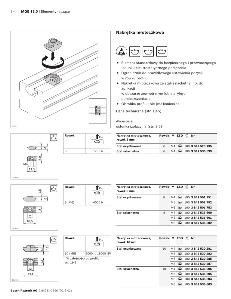 3-4 MGE 13.0 | Elementy łączące Nakrętka młoteczkowa 6 8 10 ESD f Element standardowy do bezpiecznego i przewodzącego ładunku elektrostatycznego połączenia f Ogranicznik do prawidłowego ustawienia pozycji w rowku profilu f Nakrętka młoteczkowa ze stali szlachetnej np. do aplikacji w obszarze zewnętrznym lub sterylnych pomieszczeniach f Obróbka profilu: nie jest konieczna Dane techniczne (str. 19-5) Akcesoria: osłonka izolacyjna (str. 3-5) 20978 Rowek Nakrętka młoteczkowa, rowek 6 mm Fmax Rowek M ESD Nr 4 1 6 1700 N 6 M4 Stal szlachetna 6 M4 5,9 6 Stal ocynkowana ESD ESD 100 3 842 523 135 100 3 842 536 599 00111429 M4 11,5 00109374 Rowek 1,5 8 Nakrętka młoteczkowa, rowek 8 mm Fmax 8 6 Stal ocynkowana 8 (M6) Rowek M ESD 4000 N M4 M5 8 M6 Stal szlachetna M 00111429 8 M4 M5 16,5 M6 ESD ESD ESD ESD ESD ESD Nr 100 3 842 501 751 100 3 842 501 752 100 3 842 501 753 100 3 842 536 600 100 3 842 536 601 100 3 842 536 602 00109375 Rowek Nakrętka młoteczkowa, rowek 10 mm Fmax 8,7 5,7 10 10 Stal ocynkowana 10 (M8) 6000 ... 18000 Rowek M ESD N1) M5 W zależności od profilu (str. 19-5) 9,8 1) M 19,4 00109376 M4 M6 M8 00111429 Stal szlachetna 10 M4 M5 M6 M8 Bosch Rexroth AG, 3 842 540 396 (2013-02) ESD ESD ESD ESD ESD ESD ESD ESD Nr 100 3 842 530 281 100 3 842 530 283 100 3 842 530 285 100 3 842 530 287 100 3 842 536 606 100 3 842 536 605 100 3 842 536 604 100 3 842 536 603 Elementy łączące | MGE 13.0 3-5 f Osłonka izolacyjna do rozłączania części, które są 10 bezpośrednio izolowane, do użycia z nakrętkami młoteczkowymi dla rowka 8 mm w rowku 10 mm 8 1 2 3 4 5 19613 10 10 10 10 10 10 45 50 60 Osłonka izolacyjna do nakrętki młoteczkowej, rowek 8 mm Rowek 10,8 5,8 10 Materiał: Nr 10 3 842 524 012 Polamid o dużej wytrzymałości; czarny 6 7 10 8 9 19,6 00109384 10 Śruba wieńcowa 11 12 ESD 13 f Śruba wieńcowa z łbem wielofunkcyjnym, aby było możliwe przykręcenie kluczem oczkowym/szczękowym 14 (RK 13) lub śrubokrętem Torx (T40) f Możliwe jest przykręcenie maszynowe 15 f Zaleca się do mocowania kątowników f Szybki i łatwy montaż 16 f Duże przenoszenie siły poprzez szeroki kołnierz f Dostosowany do ESD f Z Polyfleck do bezpiecznego zabierania nakrętki młoteczkowej 17 18 Narzędzie: klucz kątowy Torx® (str. 14-6) 19 Akcesoria: 20 20780 nakrętka młoteczkowa (str. 3-4) Śruba wieńcowa ø21 SW13 21 ø6,75 M8 8 L T40 M L (mm) ESD M8x18-SW13-T401) M8 18 M8x20-SW13-T402) M8 20 ESD ESD Nr 100 3 842 541 246 100 3 842 541 409 1) Do kątownika 40/40 i 60/60 2) Do wszystkich innych kątowników dla rowka 10 mm Materiał: Stal ocynkowana 20781 Bosch Rexroth AG, 3 842 540 396 (2013-02)