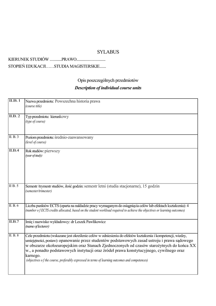 SYLABUS KIERUNEK STUDIÓW .............PRAWO................................ STOPIEŃ EDUKACJI……STUDIA MAGISTERSKIE....... Opis poszczególnych przedmiotów Description of individual course units II.B. l Nazwa przedmiotu: Powszechna historia prawa (course title) II.B. 2 Typ przedmiotu: kierunkowy (type of course) II. B. 3 Poziom przedmiotu: średnio-zaawansowany (level of course) II.B.4 Rok studiów: pierwszy (year of study) II B. 5 Semestr /trymestr studiów, ilość godzin: semestr letni (studia stacjonarne), 15 godzin (semester/trimester) II. B. 6 Liczba punktów ECTS (oparta na nakładzie pracy wymaganym do osiągnięcia celów lub efektach kształcenia): 4 (number o f ECTS credits allocated, based on the student workload required to achieve the objectives or learning outcomes) II.B.7 Imię i nazwisko wykładowcy: dr Leszek Pawlikowicz (name of lecturer) II. B. 8 Cele przedmiotu (wskazane jest określenie celów w odniesieniu do efektów kształcenia i kompetencji, wiedzy, umiejętności, postaw): opanowanie przez studentów podstawowych zasad ustroju i prawa sądowego w obszarze okołoeuropejskim oraz Stanach Zjednoczonych od czasów staroŜytnych do końca XX w., a ponadto podstawowych instytucji oraz źródeł prawa konstytucyjnego, cywilnego oraz karnego. (objectives o f the course, preferably expressed in terms of learning outcomes and competences) 2 II. B. 19 Wymagania wstępne: znajomość historii powszechnej na poziomie wymaganym przy egzaminie maturalnym (prerequisites) II. B. 10 Forma zajęć: ćwiczenia (form class) II.B. 11 Treści merytoryczne przedmiotu (course contents) Ustrój i źródła prawa despotii wschodnich, Sparty i Aten – 1. Podstawowe zasady ustrojowe państwa rzymskiego w okresie cesarstwa oraz rodzaje źródeł prawa sądowego – 2. Podstawowe zasady ustrojowe wybranych państw europejskich w okresie funkcjonowania monarchii patrymonialnej – 1. Podstawowe zasady ustrojowe wybranych państw europejskich w okresie rozdrobnienia feudalnego- 1. Porównanie źródeł prawa wybranych państw europejskich doby monarchii patrymonialnej i rozdrobnienia feudalnego - 1. Podstawowe zasady ustrojowe wybranych państw europejskich w okresie funkcjonowania monarchii absolutnej - 1. Porównanie źródeł prawa sądowego wybranych państw europejskich doby monarchii absolutnej. Podstawowe akty ustrojowe Anglii, Stanów Zjednoczonych i Francji w okresie tworzenia się zrębów państwa kapitalistycznego - 1. Podstawowe zasady ustrojowe funkcjonujące w wybranych państwach europejskich w okresie XIX w. – 1. Porównanie źródeł prawa sądowego wybranych państw europejskich funkcjonujących w dobie XIX w. – 1. Podstawowe zasady ustrojowe funkcjonujące w wybranych państwach europejskich w okresie do połowy XX w. – 1. Porównanie źródeł prawa sądowego wybranych państw europejskich funkcjonujących w okresie do połowy XX w. – 1. Tendencje ustrojowe zachodzące w świecie w II poł. XX w. – 1. Kolokwium zaliczeniowe – 1. II.B.13 Metody nauczania: nauczanie teoretyczne (wykład konwersatoryjny, rozszerzający wybrane zagadnienia) oraz dyskusja, ułatwiająca samodzielne dochodzenie do wiedzy. (teaching methods) II.B.14 Metody oceny/ forma zaliczenia: Formą zaliczenia jest ocenianie ciągłe poprzez systematyczne uczestnictwo w dyskusjach prowadzonych na zajęciach. W pozostałych przypadkach zaliczenie w formie testu wielokrotnego wyboru. 3 II.B. 11 Spis zalecanych lektur (recommended reading) - literatura podstawowa 1. Michał Szczaniecki Powszechna historia państwa i prawa, Warszawa 1998. 2. I. Jaworski Zarys powszechnej historii państwa i prawa, Warszawa 1997. - literatura uzupełniająca: 1. Stefan Grzybowski Dzieje prawa, Wrocław 1981. 2. Tadeusz Maciejewski Historia powszechna ustroju i prawa, Warszawa 2004. 3. Krzysztof Krasowski, Bogdan Lesiński, Krystyna Sikorska-Dzięgielewska, Jerzy Walachowicz Powszechna historia państwa i prawa, Poznań 1993; 4. Katarzyna Sójka-Zielińska Historia prawa, Warszawa 2006; 5. Andrzej Dziadzio Powszechna historia prawa, Warszawa 2009; 6. Ewa Borkowska-Bagieńska, Bogdan Lesiński Historia prawa sądowego, Poznań 1995; 7. Stanisław Grodziski Porównawcza historia ustrojów państwowych, Kraków 1998; 8. Andrzej Nowakowski Powszechne dzieje ustroju państw w zarysie, Częstochowa 1998; 9. Marek Wąsowicz Historia ustroju państw Zachodu: zarys wykładu, Warszawa 1998; 10. Marek Kunstler, Marian Ptak Powszechna historia państwa i prawa. Wybór tekstów źródłowych, Wrocław 1986; 11. Andrzej Gulczyński, Bogdan Lesiński, Jerzy Walachowicz, Jacek Wiewiorowski Historia państwa i prawa. Wybór tekstów źródłowych, Poznań 1995. (assessment methods) II.B.1 Język wykładowy: polski (language of instructlon) Podpis prowadzącego zajęcia .......................................................... Akceptacja kierownika Katedry/Zakładu .................................................................. 4 II.B.