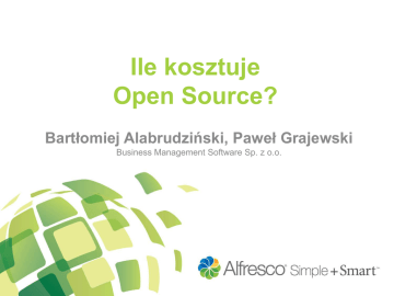Ile kosztuje Open Source? Bartłomiej Alabrudziński, Paweł Grajewski Business Management Software Sp. z o.o. Business Management Software Oficjalny partner Alfresco Paweł Grajewski Architekt Systemowy Specjalista z zakresu technologii JEE i BPM Członek elitarnego zespołu Equal Experts w Londynie Projektuje systemy dla branży finansowej Bartłomiej Alabrudziński Architekt Systemowy Architekt Alfresco Specjalista z zakresu technologii JEE i BPM Projektuje systemy dla branży finansowej Historia ruchu Open Source 1983 – powstaje ruch open-source 1991 – startuje projekt Linux 1995 – zaczyna się „dot-com boom” 1998 – publikacja kodu przeglądarki Netscape 2008 – publikacja kodu systemu Android 2008 – GitHub, koncepcja “social coding” Powszechność Open Source • Linux + wartość odtworzeniowa ponad 3 mld $ + 35-40% udziału w rynku serwerów • Android + 1 miliard aktywnych użytkowników + 85% udziału w rynku smartphone’ów Chromium - rdzeń Chrome (46% rynku) Firefox (17% rynku) • • Mity na temat Open Source • Popularne wyobrażenie o Open Source: + tworzone przez społeczność + będące własnością nas wszystkich + dostępne całkowicie za darmo “po wsze czasy” • W rzeczywistości: + ma swojego autora (bądź wielu autorów) + jest udostępnione na licencji z grupy open-source zapewniającej tzw. „four freedoms” Własność i autorstwo • Trzy możliwe scenariusze: + zbiór indywidualnych kontrybucji wielu osób + prawa autorskie w rękach fundacji non-profit + prawa autorskie w rękach komercyjnej organizacji Przekazanie praw autorskich: Specyfika rozwiązań Open Source • Dużo większa dynamika zmian • Transparentność: + statystyki kodu źródłowego, członkowie zespołu + proces rozwoju, zgłoszenia błędów/usterek • Unikatowa cecha! • Poziom transparentności niemożliwy do zapewnienia przez jakiekolwiek rozwiązanie komercyjne Open Source w komercyjnym świecie otwartość umiarkowane koszty wysoki koszt bezpieczeństwo Alfresco a Open Source One Czy warto płacić za Open Source? Niedostępność systemu przez kilka godzin Frustracja użytkowników związana z błędami systemu Utrata danych z całego dnia roboczego System nie działa na nowej wersji przeglądarki internetowej System posiada lukę bezpieczeństwa pozwalającą na nieuprawniony dostęp do danych Alfresco One – dla zastosowań Enterprise Enterprise Platforms One Certified training Alfresco One – dla zastosowań Enterprise Enterprise Platforms One Certified training Wybór rozwiązania na miarę potrzeb • Strona internetowa oparta o darmowy CMS • Platforma wsparcia procesów biznesowych wykorzystująca komercyjny silnik BPM Dziękujemy za uwagę! Business Management Software Sp. z o.o. Bartłomiej Alabrudziński [email protected] Paweł Grajewski [email protected] www.bms.com.pl