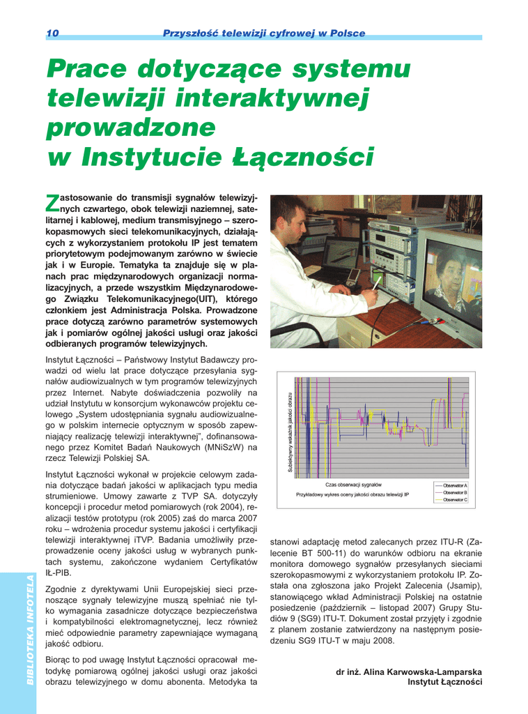 10 Przysz³oœæ telewizji cyfrowej w Polsce Prace dotycz¹ce systemu telewizji interaktywnej prowadzone w Instytucie £¹cznoœci Z astosowanie do transmisji sygna³ów telewizyjnych czwartego, obok telewizji naziemnej, satelitarnej i kablowej, medium transmisyjnego – szerokopasmowych sieci telekomunikacyjnych, dzia³aj¹cych z wykorzystaniem protoko³u IP jest tematem priorytetowym podejmowanym zarówno w œwiecie jak i w Europie. Tematyka ta znajduje siê w planach prac miêdzynarodowych organizacji normalizacyjnych, a przede wszystkim Miêdzynarodowego Zwi¹zku Telekomunikacyjnego(UIT), którego cz³onkiem jest Administracja Polska. Prowadzone prace dotycz¹ zarówno parametrów systemowych jak i pomiarów ogólnej jakoœci us³ugi oraz jakoœci odbieranych programów telewizyjnych. BIBLIOTEKA INFOTELA Instytut £¹cznoœci – Pañstwowy Instytut Badawczy prowadzi od wielu lat prace dotycz¹ce przesy³ania sygna³ów audiowizualnych w tym programów telewizyjnych przez Internet. Nabyte doœwiadczenia pozwoli³y na udzia³ Instytutu w konsorcjum wykonawców projektu celowego „System udostêpniania sygna³u audiowizualnego w polskim internecie optycznym w sposób zapewniaj¹cy realizacjê telewizji interaktywnej”, dofinansowanego przez Komitet Badañ Naukowych (MNiSzW) na rzecz Telewizji Polskiej SA. Instytut £¹cznoœci wykona³ w projekcie celowym zadania dotycz¹ce badañ jakoœci w aplikacjach typu media strumieniowe. Umowy zawarte z TVP SA. dotyczy³y koncepcji i procedur metod pomiarowych (rok 2004), realizacji testów prototypu (rok 2005) zaœ do marca 2007 roku – wdro¿enia procedur systemu jakoœci i certyfikacji telewizji interaktywnej iTVP. Badania umo¿liwi³y przeprowadzenie oceny jakoœci us³ug w wybranych punktach systemu, zakoñczone wydaniem Certyfikatów I£-PIB. Zgodnie z dyrektywami Unii Europejskiej sieci przenosz¹ce sygna³y telewizyjne musz¹ spe³niaæ nie tylko wymagania zasadnicze dotycz¹ce bezpieczeñstwa i kompatybilnoœci elektromagnetycznej, lecz równie¿ mieæ odpowiednie parametry zapewniaj¹ce wymagan¹ jakoœæ odbioru. stanowi adaptacjê metod zalecanych przez ITU-R (Zalecenie BT 500-11) do warunków odbioru na ekranie monitora domowego sygna³ów przesy³anych sieciami szerokopasmowymi z wykorzystaniem protoko³u IP. Zosta³a ona zg³oszona jako Projekt Zalecenia (Jsamip), stanowi¹cego wk³ad Administracji Polskiej na ostatnie posiedzenie (paŸdziernik – listopad 2007) Grupy Studiów 9 (SG9) ITU-T. Dokument zosta³ przyjêty i zgodnie z planem zostanie zatwierdzony na nastêpnym posiedzeniu SG9 ITU-T w maju 2008. Bior¹c to pod uwagê Instytut £¹cznoœci opracowa³ metodykê pomiarow¹ ogólnej jakoœci us³ugi oraz jakoœci obrazu telewizyjnego w domu abonenta. Metodyka ta dr in¿. Alina Karwowska-Lamparska Instytut £¹cznoœci