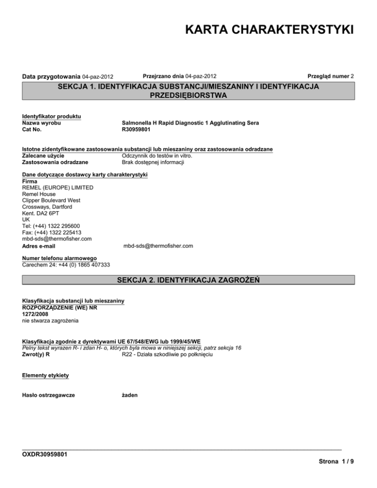 KARTA CHARAKTERYSTYKI Data przygotowania 04-paz-2012 Przejrzano dnia 04-paz-2012 Przegląd numer 2 SEKCJA 1. IDENTYFIKACJA SUBSTANCJI/MIESZANINY I IDENTYFIKACJA PRZEDSIĘBIORSTWA Identyfikator produktu Nazwa wyrobu Cat No. Salmonella H Rapid Diagnostic 1 Agglutinating Sera R30959801 Istotne zidentyfikowane zastosowania substancji lub mieszaniny oraz zastosowania odradzane Odczynnik do testów in vitro. Zalecane użycie Brak dostępnej informacji Zastosowania odradzane Dane dotyczące dostawcy karty charakterystyki Firma REMEL (EUROPE) LIMITED Remel House Clipper Boulevard West Crossways, Dartford Kent. DA2 6PT UK Tel: (+44) 1322 295600 Fax: (+44) 1322 225413 [email protected] [email protected] Adres e-mail Numer telefonu alarmowego Carechem 24: +44 (0) 1865 407333 SEKCJA 2. IDENTYFIKACJA ZAGROŻEŃ Klasyfikacja substancji lub mieszaniny ROZPORZĄDZENIE (WE) NR 1272/2008 nie stwarza zagrożenia Klasyfikacja zgodnie z dyrektywami UE 67/548/EWG lub 1999/45/WE Pelny tekst wyrazen R- i zdan H- o, których byla mowa w niniejszej sekcji, patrz sekcja 16 R22 - Działa szkodliwie po połknięciu Zwrot(y) R Elementy etykiety Hasło ostrzegawcze żaden _____________________________________________________________________________________________ OXDR30959801 Strona 1 / 9 KARTA CHARAKTERYSTYKI Przejrzano dnia 04-paz-2012 Salmonella H Rapid Diagnostic 1 Agglutinating Sera _____________________________________________________________________________________________ SEKCJA 2. IDENTYFIKACJA ZAGROŻEŃ Inne zagrożenia Brak dostępnej informacji. SEKCJA 3. SKŁAD/INFORMACJA O SKŁADNIKACH Składniki Nr WE. Procent wagowy Nr CAS 67/548/EEC klasyfikacji Sodium hydroxide 1310-73-2 EEC No. 215-185-5 <0.5 1310-73-2 C; R35 Sodium azide 26628-22-8 EEC No. 247-852-1 0.1 26628-22-8 T+; R28 R32 N; R50-53 CLP klasyfikacji Nr REACH. - rozporządzenia (WE) nr 1272/2008 Skin Corr. 1A 01-2119457892-27 (H314) Eye Dam. 1 (H318) Acute Tox. 2 (H300) Aquatic Acute 1 (H400) Aquatic Chronic 1 (H410) (EUH032) Pelny tekst wyrazen R- i zdan H- o, których byla mowa w niniejszej sekcji, patrz sekcja 16 SEKCJA 4. ŚRODKI PIERWSZEJ POMOCY Opis środków pierwszej pomocy Kontakt z oczami Płukać starannie dużą ilością wody, również pod powiekami. Uzyskać pomoc lekarską. Kontakt przez skórę Uzyskać pomoc lekarską. Zmyć ciepłą wodą z mydłem. Połknięcie NIE prowokować wymiotów. Uzyskać pomoc lekarską. Wdychanie Przenieść na świeże powietrze. Uzyskać pomoc lekarską. Uwagi dla lekarza Leczenie objawowe SEKCJA 5. POSTĘPOWANIE W PRZYPADKU POŻARU Środki gaśnicze Stosowne środki gaśnicze Użycie środków gaśniczych odpowiednich dla lokalnych warunków i dla środowiska _____________________________________________________________________________________________ OXDR30959801 Strona 2 / 9 KARTA CHARAKTERYSTYKI Przejrzano dnia 04-paz-2012 Salmonella H Rapid Diagnostic 1 Agglutinating Sera _____________________________________________________________________________________________ Środki gaśnicze, których nie wolno użyć ze względów bezpieczeństwa Brak dostępnej informacji. Szczególne zagrożenia związane z substancją lub mieszaniną Rozkład termiczny może powodować wydzielanie drażniących gazów i par Informacje dla straży pożarnej Podobnie jak w przypadku innych pożarów, stosować odpowiedni izolujący aparat oddechowy i pełny ubiór ochronny SEKCJA 6. POSTĘPOWANIE W PRZYPADKU NIEZAMIERZONEGO UWOLNIENIA DO ŚRODOWISKA Indywidualne środki ostrożności, wyposażenie ochronne i procedury w sytuacjach kryzysowych Użyć środków ochrony osobistej. Zapewnić wystarczającą wentylację. Die dopuścić do kontakctu z oczami, skórą lub ubraniem. Środki ostrożności w zakresie ochrony środowiska Zapobiegać dalszemu wyciekowi lub rozlaniu jeżeli to bezpieczne. Nie dopuścić do przedostania się produktu do kanalizacji. Metody i materiały zapobiegające rozprzestrzenianiu się skażenia i służące do usuwania skażenia Wchłonąć w obojętny materiał sorpcyjny. Dokładnie czyścić skażone powierzchnie. SEKCJA 7. POSTĘPOWANIE Z SUBSTANCJAMI I MIESZANINAMI ORAZ ICH MAGAZYNOWANIE Środki ostrożności dotyczące bezpiecznego obchodzenia się z substancjami i mieszaninami Die dopuścić do kontakctu z oczami, skórą lub ubraniem. Stosować środki ochrony osobistej. Używaj tylko w miejscach dobrze wentylowanych. Warunki bezpiecznego magazynowania, łącznie z informacjami dotyczącymi wszelkich niezgodności Przechowywać pojemnik szczelnie zamkniety. Przechowywać w temperaturze pomiedzy 2 i 8 °C. Szczególne zastosowanie(-a) końcowe SEKCJA 8. KONTROLA NARAŻENIA/ŚRODKI OCHRONY INDYWIDUALNEJ Parametry dotyczące kontroli Limity nateżeń Składniki Sodium hydroxide Unia Europejska Wielka Brytania 2 mg/m3 STEL Francja VME: 2 mg/m3 8 heures. Belgia 2 mg/m3 VLE Hiszpania VLA-EC: 2 mg/m3 15 minutos _____________________________________________________________________________________________ OXDR30959801 Strona 3 / 9 KARTA CHARAKTERYSTYKI Przejrzano dnia 04-paz-2012 Salmonella H Rapid Diagnostic 1 Agglutinating Sera _____________________________________________________________________________________________ Sodium azide Składniki Sodium hydroxide Sodium azide Składniki Sodium hydroxide Sodium azide Skin TWA 0.1 mg/m3 STEL 0.3 mg/m3 Skin TWA 0.1 mg/m3 STEL 0.3 mg/m3 VME: 0.1 mg/m3 8 heures. restrictive limit VLCT: 0.3 mg/m3 Skin Skin TWA 0.1 mg/m3 STEL 0.3 mg/m3 Skin VLA-EC: 0.3 mg/m3 15 minutos VLA-ED: 0.1 mg/m3 8 horas Włochy Niemcy 2 mg/m3 TWA (inhalable fraction) Portugalia Ceiling: 2 mg/m3 Holandia TWA: 0.1 mg/m3 8 ore. STEL: 0.3 mg/m3 15 minuti. Skin MAK 0.2 mg/m3 (inhalable) Ceiling: 0.29 mg/m3 Ceiling: 0.11 ppm Skin STEL: 0.3 mg/m3 15 minuten TWA: 0.1 mg/m3 8 uren Finlandia STEL: 2 mg/m3 15 minuutteina Ceiling: 2 mg/m3 TWA: 0.1 mg/m3 8 tunteina STEL: 0.3 mg/m3 15 minuutteina Skin Austria STEL: 4 mg/m3 15 Minuten TWA: 2 mg/m3 8 Stunden Skin STEL: 0.3 mg/m3 15 Minuten T
