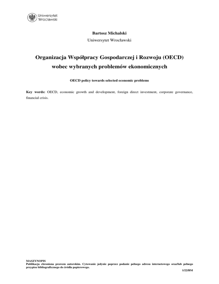Bartosz Michalski Uniwersytet Wrocławski Organizacja Współpracy Gospodarczej i Rozwoju (OECD) wobec wybranych problemów ekonomicznych OECD policy towards selected economic problems Key words: OECD, economic growth and development, foreign direct investment, corporate governance, financial crisis. MASZYNOPIS Publikacja chroniona prawem autorskim. Cytowanie jedynie poprzez podanie pełnego adresu internetowego oraz/lub pełnego przypisu bibliograficznego do źródła papierowego. 1/22/BM Powstanie OECD oraz jej główne cele Organizacja Współpracy Gospodarczej i Rozwoju (ang. Organisation for Economic Cooperation and Development, OECD) istnieje od roku 1961. Jej poprzedniczką była Organizacja Europejskiej Współpracy Gospodarczej (ang. Organisation for European Economic Cooperation, OEEC), której główne zadania koncentrowały się wokół kwestii odbudowy Europy z powojennych zniszczeń, głównie przy użyciu środków finansowych przewidzianych w planie Marshalla. Z biegiem czasu, wraz z pogłębianiem integracji gospodarczej w Europie oraz intensyfikacją powiązań w ramach całej gospodarki światowej, a tym samym postępującą współzależnością, pojawiła się konieczność ustanowienia forum, które zrzeszałoby najlepiej rozwinięte gospodarczo kraje. Można przypuszczać, iż chciano w ten sposób utrwalić ukształtowany po II wojnie światowej gospodarczy podział świata, co wiązało się z koniecznością podjęcia współpracy opartej o szerszą formułę i skupiającej się na realizacji konkretnych pomysłów, które przekładałyby się na stopniowe zmiany (reformy) architektury światowej gospodarki. W tym celu 14 grudnia 1960 roku podpisano konwencję założycielską (ang. Convention on the Organisation for Economic Cooperation and Development), która wskazuje jedynie wiązkę ogólnych celów gospodarczych (zob. art. 1 Konwencji): • zrównoważone tempo wzrostu gospodarczego i zatrudnienia, • rosnący standard życia, • utrzymanie finansowej stabilności, • rozwój gospodarki światowej. Warto zwrócić uwagę, że powyższe zadania wpisywały się niejako w działania polityczne na świecie, które naznaczone były tragedią nieodległej wojny1. Zgodnie z nimi 1 Nie mniej ciekawym aspektem może okazać się to, że OECD zdominowana początkowo przez państwa europejskie (zob. niżej) stała się forum de facto integrującym kraje, które w latach 60. XX wieku były członkami dwóch odrębnych organizacji – Europejskiej Wspólnoty Gospodarczej (EWG, powołanej do życia 25 marca 1957 roku) oraz Europejskiego Stowarzyszenia Wolnego Handlu (EFTA, powołanego do życia 4 stycznia 1960 roku, a więc niecały rok przed podpisaniem konwencji założycielskiej OECD). Można zatem sądzić, iż w obliczu narastających napięć związanych z zimną wojną OECD miała stać się niejako gospodarczym ramieniem Zachodu, a wśród krajów powołujących do życia OECD byli wszyscy ówcześni członkowie NATO. Warto również pamiętać, że rok 1960 przyniósł niepodległość wielu krajom afrykańskim, co jednocześnie rozpoczęło ideologiczną rywalizację o sojuszników na tym kontynencie. Byłe europejskie mocarstwa kolonialne, chcąc utrzymać tam wpływy i jednocześnie wziąć na siebie część odpowiedzialności za kolonialne dziedzictwo, musiały utworzyć organizację międzynarodową, niezaangażowaną bezpośrednio, lecz oferującą nowo powstałym krajom zinstytucjonalizowane wsparcie. Innym symbolicznym wydarzeniem, uznawanym za początek zimnej wojny, które miało miejsce w roku 1960 było wystąpienia sowieckiego przywódcy Nikity Chruszczowa w ONZ (12 września). MASZYNOPIS Publikacja chroniona prawem autorskim. Cytowanie jedynie poprzez podanie pełnego adresu internetowego oraz/lub pełnego przypisu bibliograficznego do źródła papierowego. 2/22/BM pokój międzynarodowy powinien był być budowany w oparciu o kilka stabilnych filarów, gdzie jednym z nich byłaby właśnie sprawnie funkcjonująca, stabilna gospodarka, pozwalająca podnosić standard życia i przeciwdziałać w ten sposób jakimkolwiek próbom wznawiania sporów militarnych, których stricte gospodarczo-społeczną konsekwencją byłaby m.in. utrata wypracowanego dobrobytu. Jednocześnie sama instytucja państwa, zgodnie z dominującym wówczas podejściem keynesowskim, miała gwarantować, iż redystrybucja korzyści będących pochodną wzrostu i rozwoju gospodarczego będzie właściwa i przełoży się na utrwalenie strukturalnych warunków ekspansji. Powołanie do życia OECD jako płaszczyzny wzajemnych konsultacji oraz współpracy w sferach mających szczególne znaczenie dla krajów wysokorozwiniętych2 miało przyczynić się do bardziej efektywnego wykorzystania posiadanych zasobów. W tym celu przewidziano, że organizacja nie może być klubem zamkniętym na nowe inicjatywy i członków. W konsekwencji wśród najważniejszych zasad wprowadzono zapisy mające zagwarantować realizację tych ambitnych założeń. Uznano, że powinna istnieć możliwość podejmowania decyzji, które byłyby wiążące dla wszystkich członków, formułowania rekomendacji oraz zawierania innych porozumień z krajami członkowskimi, nieczłonkowskimi, jak i innymi organizacjami międzynarodowymi (art. 5 konwencji założycielskiej). Według stanu na II połowę roku 2009 OECD zrzesza 30 państw członkowskich 3 , dysponuje rocznym budżetem w wysokości 320 mln EUR 4 , a jej główna działalność koncentruje się na promowaniu określonych kierunków działań podejmowanych w ramach narodowej oraz międzynarodowej polityki gospodarczej. Misją OECD jest hasło zakładające uczynienie gospodarki światowej silniejszą, czystszą oraz bardziej sprawiedliwą (ang. For a 2 Określenie „kraje wysokorozwinięte” miało i ma nadal raczej charakter umowny, gdyż OECD zrzesza i zamierza przyjąć do swojego grona kraje o dość zróżnicowanym potencjale. Tym samym tr
