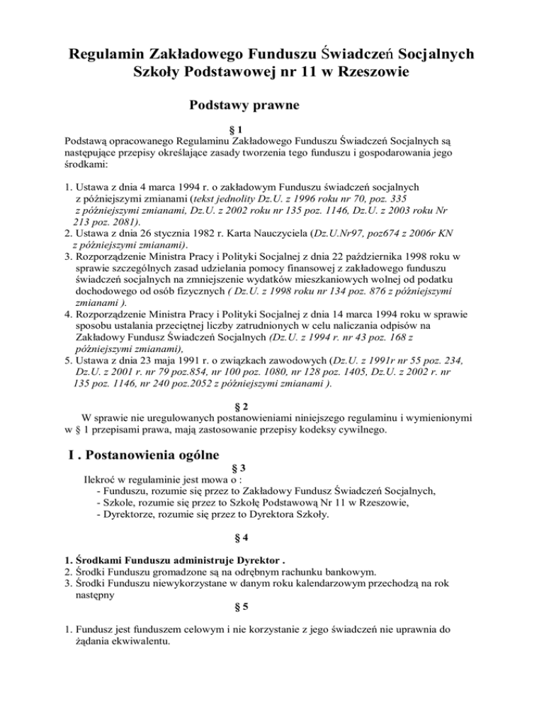 Regulamin Zakładowego Funduszu Świadczeń Socjalnych Szkoły Podstawowej nr 11 w Rzeszowie Podstawy prawne §1 Podstawą opracowanego Regulaminu Zakładowego Funduszu Świadczeń Socjalnych są następujące przepisy określające zasady tworzenia tego funduszu i gospodarowania jego środkami: 1. Ustawa z dnia 4 marca 1994 r. o zakładowym Funduszu świadczeń socjalnych z późniejszymi zmianami (tekst jednolity Dz.U. z 1996 roku nr 70, poz. 335 z późniejszymi zmianami, Dz.U. z 2002 roku nr 135 poz. 1146, Dz.U. z 2003 roku Nr 213 poz. 2081). 2. Ustawa z dnia 26 stycznia 1982 r. Karta Nauczyciela (Dz.U.Nr97, poz674 z 2006r KN z późniejszymi zmianami). 3. Rozporządzenie Ministra Pracy i Polityki Socjalnej z dnia 22 października 1998 roku w sprawie szczególnych zasad udzielania pomocy finansowej z zakładowego funduszu świadczeń socjalnych na zmniejszenie wydatków mieszkaniowych wolnej od podatku dochodowego od osób fizycznych ( Dz.U. z 1998 roku nr 134 poz. 876 z późniejszymi zmianami ). 4. Rozporządzenie Ministra Pracy i Polityki Socjalnej z dnia 14 marca 1994 roku w sprawie sposobu ustalania przeciętnej liczby zatrudnionych w celu naliczania odpisów na Zakładowy Fundusz Świadczeń Socjalnych (Dz.U. z 1994 r. nr 43 poz. 168 z późniejszymi zmianami), 5. Ustawa z dnia 23 maja 1991 r. o związkach zawodowych (Dz.U. z 1991r nr 55 poz. 234, Dz.U. z 2001 r. nr 79 poz.854, nr 100 poz. 1080, nr 128 poz. 1405, Dz.U. z 2002 r. nr 135 poz. 1146, nr 240 poz.2052 z późniejszymi zmianami ). §2 W sprawie nie uregulowanych postanowieniami niniejszego regulaminu i wymienionymi w § 1 przepisami prawa, mają zastosowanie przepisy kodeksy cywilnego. I . Postanowienia ogólne §3 Ilekroć w regulaminie jest mowa o : - Funduszu, rozumie się przez to Zakładowy Fundusz Świadczeń Socjalnych, - Szkole, rozumie się przez to Szkołę Podstawową Nr 11 w Rzeszowie, - Dyrektorze, rozumie się przez to Dyrektora Szkoły. §4 1. Środkami Funduszu administruje Dyrektor . 2. Środki Funduszu gromadzone są na odrębnym rachunku bankowym. 3. Środki Funduszu niewykorzystane w danym roku kalendarzowym przechodzą na rok następny §5 1. Fundusz jest funduszem celowym i nie korzystanie z jego świadczeń nie uprawnia do żądania ekwiwalentu. 2. Świadczenia socjalne finansowane z Funduszu nie są świadczeniami należnymi. Osoby, których wnioski zostały załatwione odmownie, nie mogą rościć pretensji do jakiejkolwiek wypłaty z tego tytułu w późniejszym terminie. 3. Załatwione odmownie wnioski osób uprawnionych ubiegających się o dopłatę z Funduszu nie wymagają uzasadnienia, a decyzja pracodawcy odmawiająca dopłaty jest ostateczna ( o odmowie przyznania świadczenia wnioskodawcę na jego prośbę może poinformować Dyrektor). §6 1. Dyrektor wyznacza i powołuje Szkolną Komisję Socjalną zwaną dalej Komisją w skład której wchodzą: · jeden nauczyciel – członków Rady Pedagogicznej Szkoły, · jeden przedstawiciel pracowników administracji i obsługi, · przedstawiciele związków zawodowych ( po jednym z każdego związku) 2. Komisja ma charakter organu pomocniczego. 4. Komisję powołuje się na okres 2 lat. 5. Dyrektor jest przewodniczącym Komisji , powołuje protokolanta , który protokołuje przebieg wszystkich posiedzeń komisji. 6. Komisja nie ma uprawnień decyzyjnych. 7. Członków Komisji obowiązuje tajemnica służbowa. §7 1. Podstawę gospodarowania środkami Funduszu stanowi roczny plan finansowy opracowany przez księgową i komisję socjalną , uzgodniony ze związkami zawodowymi i zatwierdzony przez Dyrektora. 2. Opracowany, zgodnie z podstawami prawnymi regulamin określający zasady wykorzystania Funduszu, w tym podział Funduszu na poszczególne cele i warunki przyznawania świadczeń uprawnionym wymaga uzgodnienia z zakładowymi organizacjami związkowymi. §8 Obowiązki Komisji : 1. Dokonanie racjonalnego podziału środków Funduszu w porozumieniu z Dyrektorem, 2. Rozpatrywanie wniosków i kwalifikowanie ich do przyznawania świadczeń zgodnie z przyjętym regulaminem według kolejności zgłoszeń, 3.Dyrektor może zwołać posiedzenie Komisji podając termin z tygodniowym wyprzedzeniem, 4. Przyjmowaniem, rejestracją wniosków i sporządzaniem umów z pożyczkobiorcami zajmuje się wyznaczony przez Dyrektora pracownik Szkoły, II. Tworzenie Funduszu §9 Fundusz tworzy się z corocznego odpisu podstawowego naliczanego w stosunku do przeciętnej liczby zatrudnionych. Wysokość odpisu wynosi: 1) dla nauczycieli wysokości ustalanej jako iloczyn planowanej, przeciętnej w danym roku kalendarzowym, liczby nauczycieli zatrudnionych w pełnym i niepełnym wymiarze zajęć (po przeliczeniu na pełny wymiar zajęć) skorygowanej w końcu roku do faktycznej przeciętnej liczby zatrudnionych nauczycieli (po przeliczeniu na pełny wymiar zajęć) i 110% kwoty bazowej, określanej dla pracowników państwowej sfery budżetowej na podstawie art. 5 pkt 1 lit. a i art. 6 ust. 1 pkt 2 ustawy o kształtowaniu wynagrodzeń w państwowej sferze budżetowej oraz o zmianie niektórych ustaw, ustalanej corocznie w ustawie budżetowej, 2) 5% emerytur i rent pobieranych przez nauczycieli będących emerytami i rencistami, 3) na jednego pracownika niepedagogicznego 37,5% przeciętnego wynagrodzenia miesięcznego w gospodarce narodowej w roku poprzednim lub drugim półroczu roku poprzedniego, jeżeli przeciętne wynagrodzenie z tego okresu stanowiło kwotę wyższą, 4) na jednego emeryta lub rencistę – pracownika niepedagogicznego 6,25% przeciętnego wynagrodzenia miesięcznego w gospodarce narodowej w roku poprzednim lub drugim półroczu roku poprzedniego, jeżeli przeciętne wynagrodzenie z tego okresu stanowiło kwotę wyższą. § 10 Sposób ustalania przeciętnej liczby zatrudnionych w celu naliczania odpisu na Fundusz: 1) podstawę naliczania odpisu stanowi przeciętna planowana w danym roku kalendarzowym liczba osób zatrudnionych w szkole, skorygowa