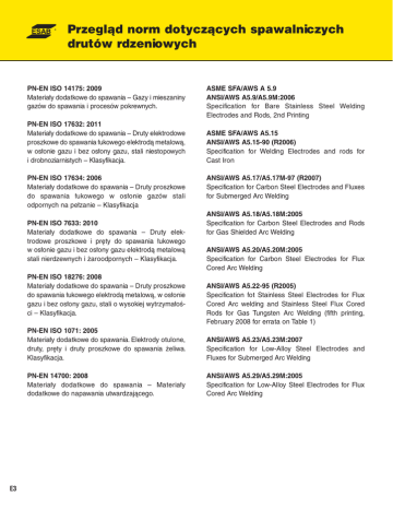 Przegląd norm dotyczących spawalniczych drutów rdzeniowych PN-EN ISO 14175: 2009 Materiały dodatkowe do spawania – Gazy i mieszaniny gazów do spawania i procesów pokrewnych. PN-EN ISO 17632: 2011 Materiały dodatkowe do spawania – Druty elektrodowe proszkowe do spawania łukowego elektrodą metalową, w osłonie gazu i bez osłony gazu, stali niestopowych i drobnoziarnistych – Klasyfikacja. PN-EN ISO 17634: 2006 Materiały dodatkowe do spawania – Druty proszkowe do spawania łukowego w osłonie gazów stali odpornych na pełzanie – Klasyfikacja PN-EN ISO 7633: 2010 Materiały dodatkowe do spawania – Druty elektrodowe proszkowe i pręty do spawania łukowego w osłonie gazu i bez osłony gazu elektrodą metalową stali nierdzewnych i żaroodpornych – Klasyfikacja. PN-EN ISO 18276: 2008 Materiały dodatkowe do spawania – Druty proszkowe do spawania łukowego elektrodą metalową, w osłonie gazu i bez osłony gazu, stali o wysokiej wytrzymałości – Klasyfikacja. E3 ASME SFA/AWS A 5.9 ANSI/AWS A5.9/A5.9M:2006 Specification for Bare Stainless Steel Welding Electrodes and Rods, 2nd Printing ASME SFA/AWS A5.15 ANSI/AWS A5.15-90 (R2006) Specification for Welding Electrodes and rods for Cast Iron ANSI/AWS A5.17/A5.17M-97 (R2007) Specification for Carbon Steel Electrodes and Fluxes for Submerged Arc Welding ANSI/AWS A5.18/A5.18M:2005 Specification for Carbon Steel Electrodes and Rods for Gas Shielded Arc Welding ANSI/AWS A5.20/A5.20M:2005 Specification for Carbon Steel Electrodes for Flux Cored Arc Welding ANSI/AWS A5.22-95 (R2005) Specification fot Stainless Steel Electrodes for Flux Cored Arc welding and Stainless Steel Flux Cored Rods for Gas Tungsten Arc Welding (fifth printing, February 2008 for errata on Table 1) PN-EN ISO 1071: 2005 Materiały dodatkowe do spawania. Elektrody otulone, druty, pręty i druty proszkowe do spawania żeliwa. Klasyfikacja. ANSI/AWS A5.23/A5.23M:2007 Specification for Low-Alloy Steel Electrodes and Fluxes for Submerged Arc Welding PN-EN 14700: 2008 Materiały dodatkowe do spawania – Materiały dodatkowe do napawania utwardzającego. ANSI/AWS A5.29/A5.29M:2005 Specification for Low-Alloy Steel Electrodes for Flux Cored Arc Welding
