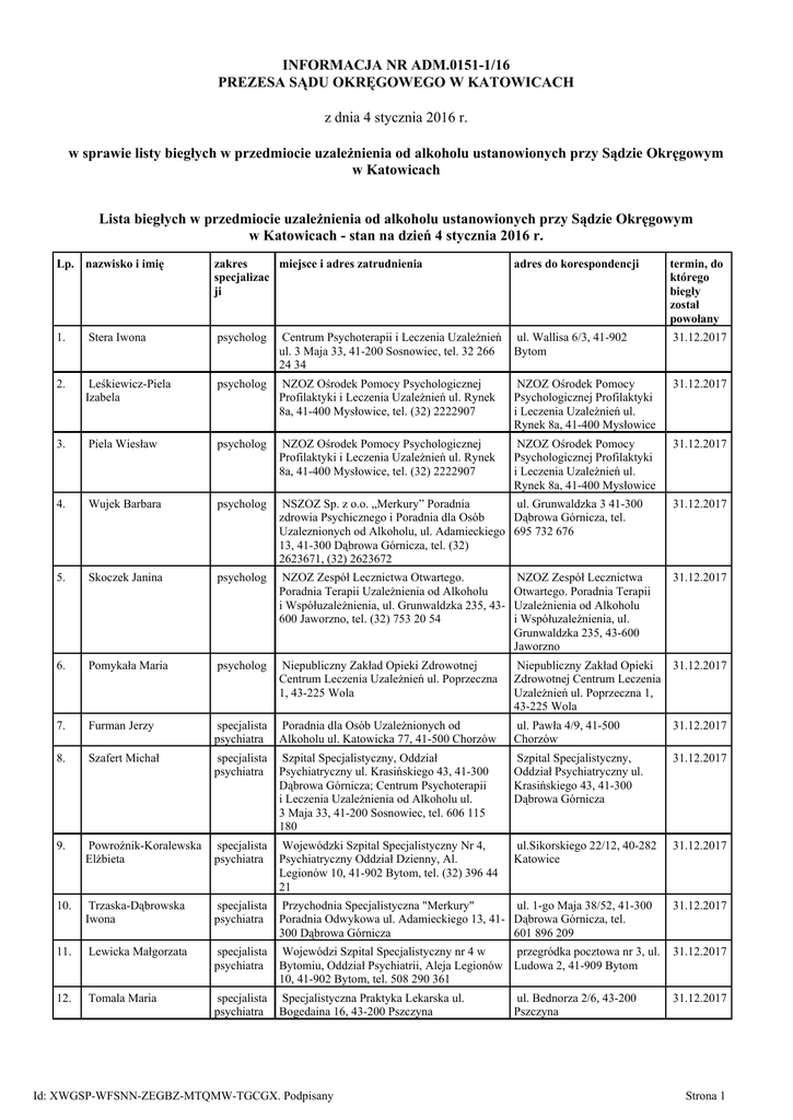 INFORMACJA NR ADM.0151-1/16 PREZESA SĄDU OKRĘGOWEGO W KATOWICACH z dnia 4 stycznia 2016 r. w sprawie listy biegłych w przedmiocie uzależnienia od alkoholu ustanowionych przy Sądzie Okręgowym w Katowicach Lista biegłych w przedmiocie uzależnienia od alkoholu ustanowionych przy Sądzie Okręgowym w Katowicach - stan na dzień 4 stycznia 2016 r. Lp. nazwisko i imię zakres miejsce i adres zatrudnienia specjalizac ji adres do korespondencji termin, do którego biegły został powołany 1. Stera Iwona psycholog Centrum Psychoterapii i Leczenia Uzależnień ul. 3 Maja 33, 41-200 Sosnowiec, tel. 32 266 24 34 ul. Wallisa 6/3, 41-902 Bytom 31.12.2017 2. Leśkiewicz-Piela Izabela psycholog NZOZ Ośrodek Pomocy Psychologicznej Profilaktyki i Leczenia Uzależnień ul. Rynek 8a, 41-400 Mysłowice, tel. (32) 2222907 NZOZ Ośrodek Pomocy Psychologicznej Profilaktyki i Leczenia Uzależnień ul. Rynek 8a, 41-400 Mysłowice 31.12.2017 3. Piela Wiesław psycholog NZOZ Ośrodek Pomocy Psychologicznej Profilaktyki i Leczenia Uzależnień ul. Rynek 8a, 41-400 Mysłowice, tel. (32) 2222907 NZOZ Ośrodek Pomocy Psychologicznej Profilaktyki i Leczenia Uzależnień ul. Rynek 8a, 41-400 Mysłowice 31.12.2017 4. Wujek Barbara psycholog NSZOZ Sp. z o.o. „Merkury” Poradnia ul. Grunwaldzka 3 41-300 zdrowia Psychicznego i Poradnia dla Osób Dąbrowa Górnicza, tel. Uzaleznionych od Alkoholu, ul. Adamieckiego 695 732 676 13, 41-300 Dąbrowa Górnicza, tel. (32) 2623671, (32) 2623672 31.12.2017 5. Skoczek Janina psycholog NZOZ Zespół Lecznictwa Otwartego. Poradnia Terapii Uzależnienia od Alkoholu i Współuzależnienia, ul. Grunwaldzka 235, 43600 Jaworzno, tel. (32) 753 20 54 NZOZ Zespół Lecznictwa Otwartego. Poradnia Terapii Uzależnienia od Alkoholu i Współuzależnienia, ul. Grunwaldzka 235, 43-600 Jaworzno 31.12.2017 6. Pomykała Maria psycholog Niepubliczny Zakład Opieki Zdrowotnej Centrum Leczenia Uzależnień ul. Poprzeczna 1, 43-225 Wola Niepubliczny Zakład Opieki Zdrowotnej Centrum Leczenia Uzależnień ul. Poprzeczna 1, 43-225 Wola 31.12.2017 7. Furman Jerzy specjalista psychiatra Poradnia dla Osób Uzależnionych od Alkoholu ul. Katowicka 77, 41-500 Chorzów ul. Pawła 4/9, 41-500 Chorzów 31.12.2017 8. Szafert Michał specjalista psychiatra Szpital Specjalistyczny, Oddział Psychiatryczny ul. Krasińskiego 43, 41-300 Dąbrowa Górnicza; Centrum Psychoterapii i Leczenia Uzależnienia od Alkoholu ul. 3 Maja 33, 41-200 Sosnowiec, tel. 606 115 180 Szpital Specjalistyczny, Oddział Psychiatryczny ul. Krasińskiego 43, 41-300 Dąbrowa Górnicza 31.12.2017 9. Powroźnik-Koralewska Elżbieta specjalista psychiatra Wojewódzki Szpital Specjalistyczny Nr 4, Psychiatryczny Oddział Dzienny, Al. Legionów 10, 41-902 Bytom, tel. (32) 396 44 21 ul.Sikorskiego 22/12, 40-282 Katowice 31.12.2017 10. Trzaska-Dąbrowska Iwona specjalista psychiatra Przychodnia Specjalistyczna "Merkury" ul. 1-go Maja 38/52, 41-300 Poradnia Odwykowa ul. Adamieckiego 13, 41- Dąbrowa Górnicza, tel. 300 Dąbrowa Górnicza 601 896 209 31.12.2017 11. Lewicka Małgorzata specjalista psychiatra Wojewódzi Szpital Specjalistyczny nr 4 w przegródka pocztowa nr 3, ul. Bytomiu, Oddział Psychiatrii, Aleja Legionów Ludowa 2, 41-909 Bytom 10, 41-902 Bytom, tel. 508 290 361 31.12.2017 12. Tomala Maria specjalista psychiatra Specjalistyczna Praktyka Lekarska ul. Bogedaina 16, 43-200 Pszczyna 31.12.2017 Id: XWGSP-WFSNN-ZEGBZ-MTQMW-TGCGX. Podpisany ul. Bednorza 2/6, 43-200 Pszczyna Strona 1 13. Kuczyńska Ewa psycholog Samodzielny Publiczny Zakład Terapii Samodzielny Publiczny Uzależnień i Współuzależnienia, Al. Młodych Zakład Terapii Uzależnień 16, 41-100 Siemianowice Śl., tel. (032) 765 41 i Współuzależnienia, Al. 38 Młodych 16, 41-100 Siemianowice Śl 31.12.2017 14. Wcisło Katarzyna psycholog Samodzielny Publiczny Zakład Terapii Samodzielny Publiczny Uzależnień i Współuzależnienia, Al. Młodych Zakład Terapii Uzależnień 16, 41-100 Siemianowice Śl., tel. (032) 765 41 i Współuzależnienia Al. 38 Młodych 16, 41-100 Siemianowice Śl. 31.12.2017 15. Kanczyk Jadwiga specjalista psychiatra SPZOZ Ośrodek Terapii Uzależnień i Pomocy ul. Wrocławska 38, 41-902 Psychologicznej ul. Ballestremów 16, 41-700 Bytom Ruda Śl., tel. 501364 167 31.12.2018 16. Wojtalewicz Monika psycholog "Hunter" Sp. z o.o. ul. Piastowska 29, 42-500 Będzin, tel. 606 907 662 ul. Klonowa 3/14, 42-500 Będzin 31.12.2018 17. Tatura Dorota psycholog ZOZ Sp. z o.o. w Świętochłowicach Poradnia Terapii Uzależnienia od Alkoholu i Współuzależnienia ul. Szpitalna 2, Świętochłowice ul. Matejki 21/2, 41-902 Bytom 31.12.2018 18. John-Ziaja Hanna psychiatra Centrum Psychiatrii, Oddział Psychiatrii II, ul. Centrum Psychiatrii, Oddział 31.12.2017 Korczaka 27, 40-340 Katowice tel. 607 560 Psychiatrii II, ul. Korczaka 27, 647 40-340 Katowice 19. Baic Joanna psychiatra Poradnia Ochrony Zdrowia Psychicznego "Centrum" ul. Powstańców Warszawskich 38, 41-902 Bytom ul. Piekarska 60/60/19, 41902 Bytom 31.12.2017 20. Lebda-Wyborna Monika psychiatra Samodzielny Publiczny Zakład Terapii Uzależnień i Współuzależnienia Aleja Młodych 16, 41-106 Siemianowice Śl., tel. 606 383 822, 32 765 41 38 Samodzielny Publiczny Zakład Terapii Uzależnień i Współuzależnienia Al. Młodych 16, 41-106 Siemianowice Śl. 31.12.2017 21. Cierpioł Lech psycholog Samodzielny Publiczny Zakład Terapii Uzależnień i Współuzależnienia, Al. Młodych 16, 41-100 Siemianowice Śl., tel. (32) 765 41 38 Samodzielny Publiczny Zakład Terapii Uzależnień i Współuzależnienia, Al. Młodych 16, 41-100 Siemianowice Śl. 31.12.2017 22. Zdrada Damian psycholog Centrum Psychoterapii i Leczenia Uzależnień ul. 3 Maja 33, 41-200 Sosnowiec, tel. 32 266 24 34 Centrum Psychoterapii i Leczenia Uzależnień ul. 3 Maja 33, 41-200 Sosnowiec 31.12.2017 23. Staroń-Marszycka Katarzyna psychiatra Specjalistyczny Niepubliczny Zakład Opieki Zdrowotnej "Marvit" ul. Gen. J. Bema 14, 42500 