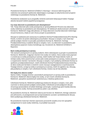 POLISH Posiedzenia Komisji ds. Nieletnich (Children’s Hearings) – broszura informacyjna dla rodziców oraz prawnych opiekunów objaśniająca co pociąga za sobą konieczność przyjścia nieletniego na posiedzenie Komisji ds. Nieletnich. Posiedzenia zwoływane są w przypadku istnienia zastrzeżeń dotyczących dobra Twojego dziecka lub jeżeli nieletni popełnił przestępstwo. Czy moja obecność na posiedzeniu jest obowiązkowa? Tak. Twoja obecność jako osoby powiązanej ze sprawą (Relevant Person) oraz obecność osoby nieletniej na posiedzeniu jest obowiązkowa. W niektórych okolicznościach członkowie Komisji ds. Nieletnich mogą zdecydować, że Twoja obecność oraz/lub obecność nieletniego nie jest konieczna, chyba że sam chcesz przyjść na posiedzenie. Decyzja ta wydawana jest zazwyczaj na spotkaniu Komisji Przedposiedzeniowej (Pre‐Hearing Panel), na które nie jesteś zobowiązany przychodzić. Decyzja w związku z tym może być jednak podjęta również na początku posiedzenia Komisji ds. Nieletnich. Komisję Przedposiedzeniową o wydanie decyzji w związku z tym, czy obecność na posiedzeniu jest obowiązkowa poprosić możesz kontaktując się z Kuratorem ds. Nieletnich (Children’s Reporter). Bycie osobą powiązaną ze sprawą Tak zwanymi powiązanymi ze sprawą osobami, które zobowiązane są przyjść na posiedzenie Komisji ds. Nieletnich, mogą być również inne osoby niż rodzice. Dana osoba może poprosić o uznanie jej za osobę powiązaną ze sprawą. Jeżeli myślisz lub Twoje dziecko myśli, że istnieje osoba, która powinna być uznana jako osoba powiązana ze sprawą, możesz poprosić o rozpatrzenie również i tej kwestii. Decyzję w związku z tym podejmą członkowie Komisji na spotkaniu przedposiedzeniowym. Jeżeli członkowie Komisji Przedposiedzeniowej stwierdzą, że dana osoba jest lub była w ostatnim czasie znacząco zaangażowana w wychowywanie Twojego dziecka, uznają tą osobę za powiązaną ze sprawą. Jeżeli nie zgodzisz się z decyzją, jaką podejmą w związku z tym członkowie Komisji, możesz się od niej odwołać. Kim będą inne obecne osoby? Oprócz Ciebie, Twojego dziecka i pozostałych powiązanych ze sprawą osób na posiedzeniu Komisji ds. Nieletnich obecne będą inne osoby, w tym trzech członków Komisji ds. Nieletnich, specjalnie wyszkolonych wolontariuszy z lokalnej społeczności. Członkowie Komisji ds. Nieletnich podejmują ostateczne decyzje w związku z tym, jakie czynności w danej sprawie podjęte zostaną dalej. Członkowie przed podjęciem decyzji otrzymują sprawozdania od władz lokalnego samorządu i wysłuchują opinii każdej obecnej na posiedzeniu osoby. Komisji przewodniczy jeden z jej członków. Na posiedzeniu Komisji ds. Nieletnich obecny jest Kurator ds. Nieletnich, którego zadaniem jest pilnowanie, że postępowanie jest przeprowadzone uczciwie i protokołowanie decyzji, które podejmują członkowie Komisji ds. Nieletnich. Na posiedzenie może być również zaproszony pracownik socjalny oraz inni specjaliści zaangażowani w życie osoby nieletniej, na przykład nauczyciel. POLISH Jak przebiega posiedzenie Komisji ds. Nieletnich? Na pierwszym posiedzeniu przewodniczący Komisji ds. Nieletnich odczyta powody skierowania dziecka na posiedzenie (oświadczenie o podstawach skierowania). Komisja zapyta się następnie Ciebie, nieletniego oraz innych powiązanych ze sprawą osób, czy zgadzasz/zgadzają się z tymi podstawami czy nie. Jeżeli którakolwiek osoba nie zgodzi się z oświadczeniem o podstawach skierowania lub nie zrozumie go, członkowie Komisji nie będą mogli wydać ostatecznej decyzji w sprawie. W takim przypadku mają możliwość umorzenia skierowania, co stanowi koniec sprawy, lub przekazania skierowania sędziemu Sądu Okręgowego (Sheriff Court), aby zdecydował, czy podstawy skierowania są prawidłowe. Jeżeli Komisja uzna to za konieczne, na okres przejściowy może wdrożyć tymczasowy nakaz przymusowego nadzoru (Interim Compulsory Supervision Order). Nakaz ten obowiązywał będzie przez krótki okres czasu dopóki nie będzie musiał zostać przedłużony. Nakaz oznacza, że w życie dziecka tymczasowo interweniować będą zobowiązani przedstawiciele lokalnych władz. Jeżeli Komisja ds. Nieletnich wyda taki nakaz oraz/lub przekaże oświadczenie o podstawach skierowania do Sądu, Komisja wytłumaczy, co będzie to oznaczało dla Ciebie oraz Twojego dziecka. Jakie decyzje mogą zostać podjęte przez Komisję ds. Nieletnich? Jeżeli wszyscy zgodzą się z oświadczeniem o podstawach skierowania i będą je rozumieli, Komisja ds. Nieletnich może zacząć omawiać raporty w sprawie, wysłuchać wszystkich obecnych na posiedzeniu osób i podjąć decyzję leżącą w najlepszym interesie Twojego dziecka. Komisja przed wydaniem decyzji pod uwagę zobowiązana jest wziąć poglądy Twojego dziecka, Twoją opinię oraz to, co myślą wszelkie inne powiązane ze sprawą osoby. Jeżeli członkowie Komisji ds. Nieletnich stwierdzą, że konieczna jest oficjalna prawna interwencja, Twoje dziecko poddadzą nakazowi przymusowego nadzoru. Nakaz taki obejmować może środki, które będą miały wpływ na życie Twojego dziecka i decydować na przykład o jego miejscu zamieszkania lub poziomie kontaktu utrzymywanego z daną osobą. Komisja ds. Nieletnich powody swojej decyzji oraz wdrażane środki przedstawi pod koniec posiedzenia. Egzemplarz tych powodów wraz z nakazem przymusowego nadzoru zostanie Ci wysłany pocztą. Twoje prawa Twojemu dziecku, Tobie oraz osobie powiązanej ze sprawą przysługują następujące prawa: Prawo do złożenia prośby do Komisji Przedposiedzeniowej. Prawo do przyprowadzenia ze sobą na posiedzenie przedstawiciela, którym na przykład może być prawnik, rzecznik lub osoba znajoma. Prawo do wysłania raportu do rozpatrzenia przez członków Komisji ds. Nieletnich, który do Biura Kuratora ds. Nieletnich musi wpłynąć, w miarę mo